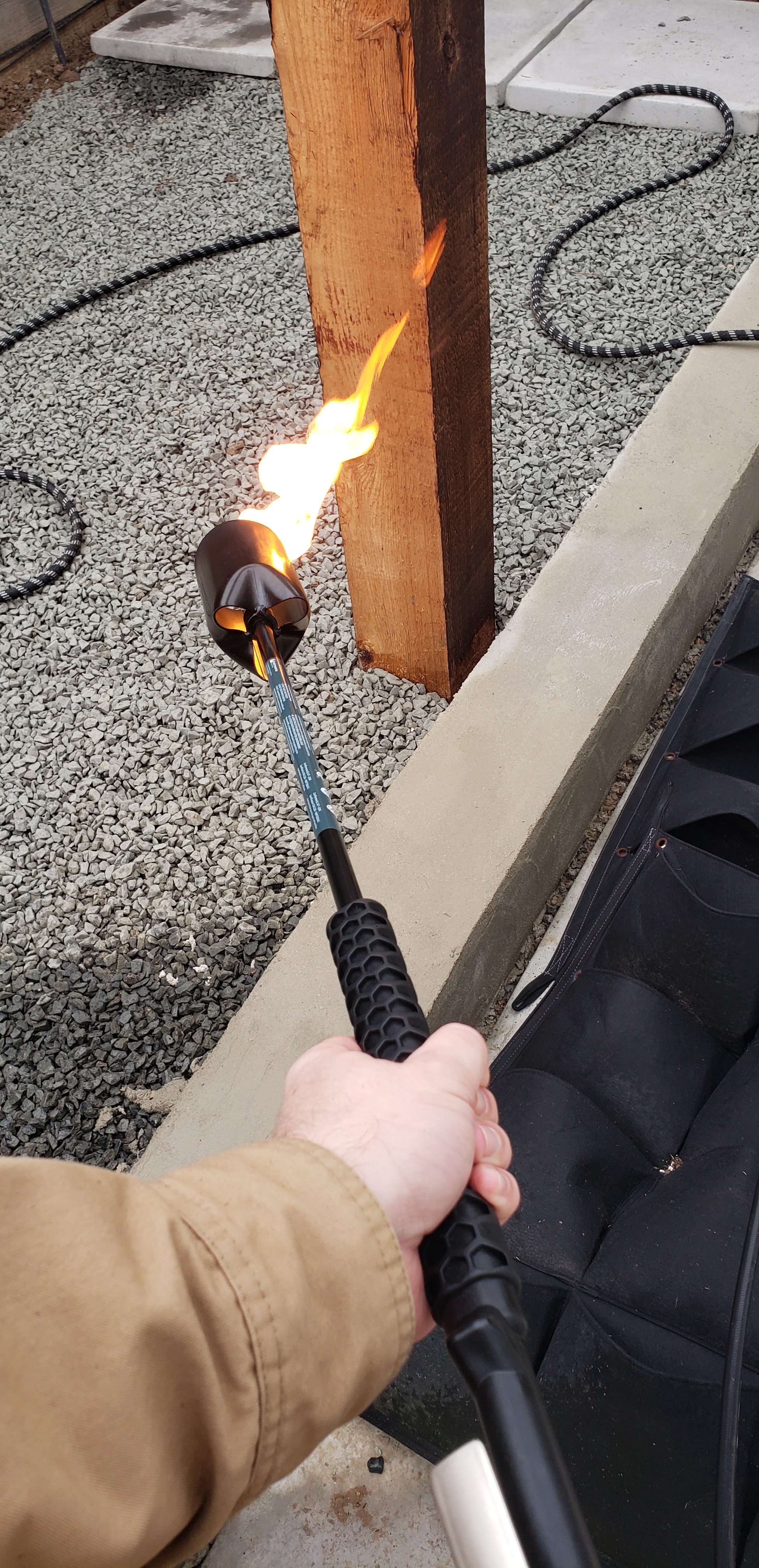 Before you start any projects be aware of any limitations/challenges you have. During the scope of this work we were working with open flame, a propane tank and being up on a ladder. It is much easier to limit the risks with good preparation but there are risks. I highly recommend preparing the posts before they are in the ground. And, very importantly, the wind was very still each day we burned. You may note in several of the photos a water hose is very close at hand.