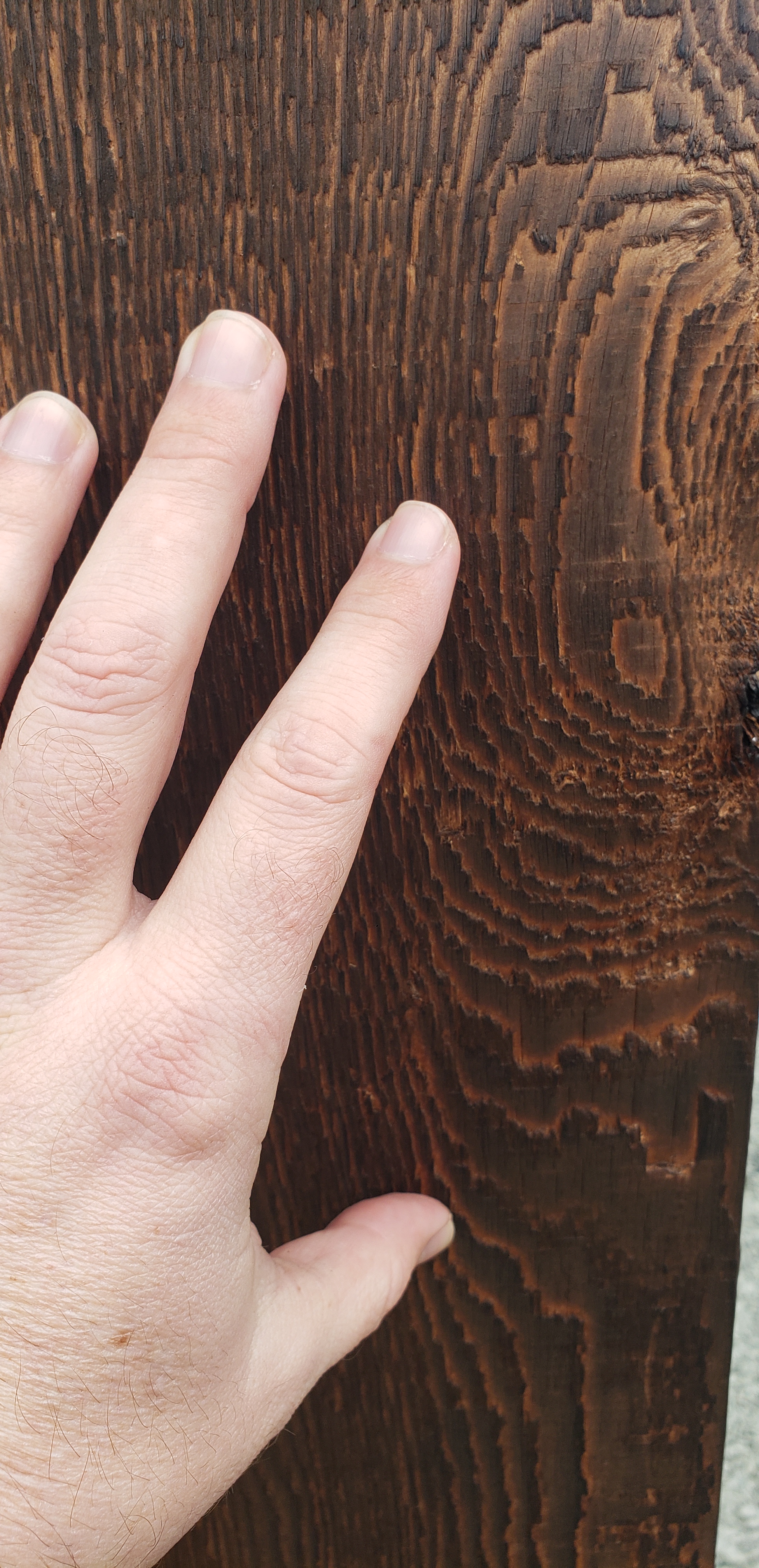 One of my favorite sections of wood. The cut brings out grain that reminds me of tiger stripes. Brush free of the char, freshly oiled (linseed oil with a wide, to cover more area quickly, brush), and ready for its close-up!