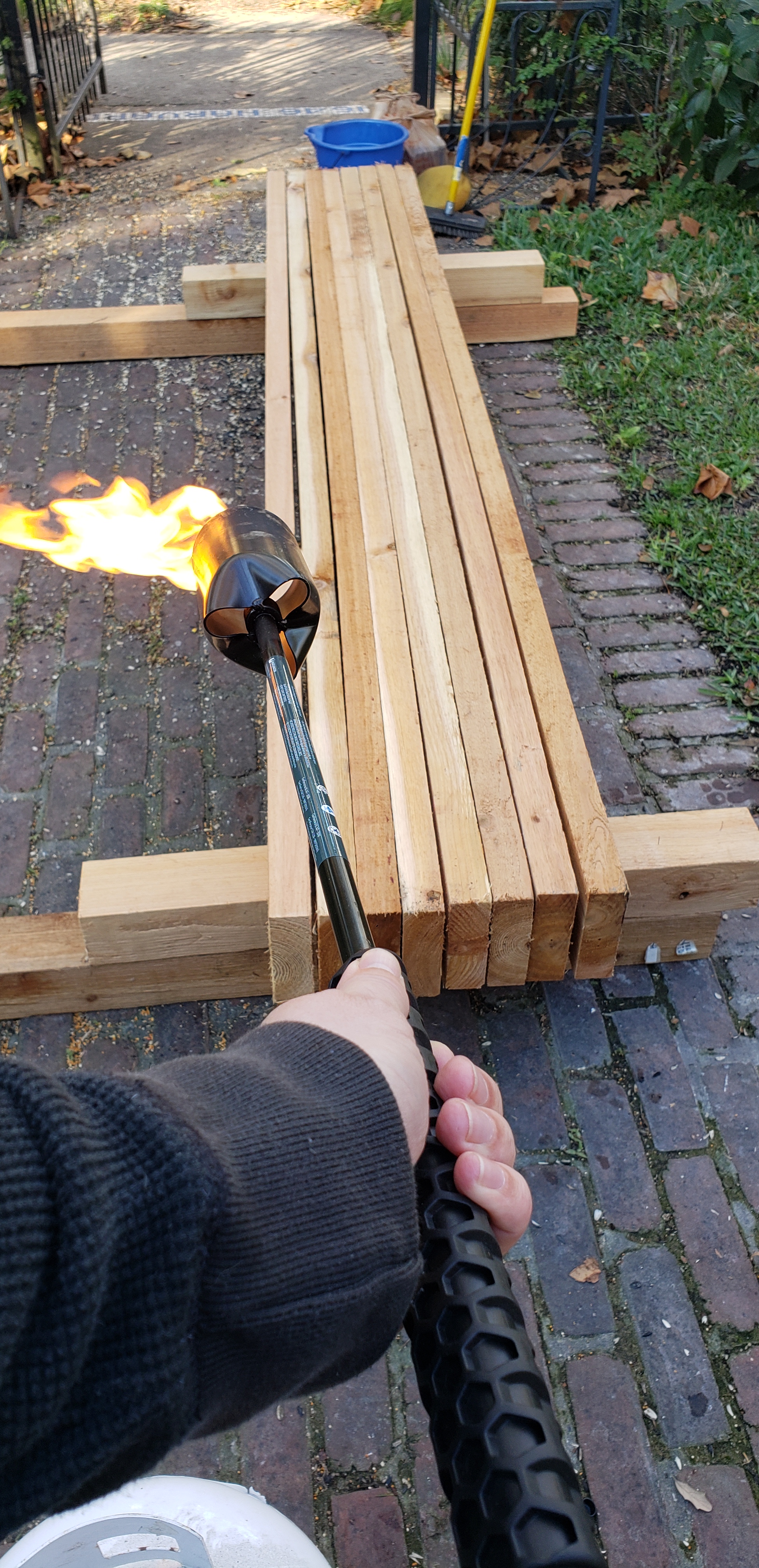 After applying quite a bit of heat I found the posts very resilient. Burning the back sides of the posts (near the fence), while on a ladder, takes much more concentration than the cross-beams while standing on the ground. Again, the entire process is much easier when the lumber is on the ground.