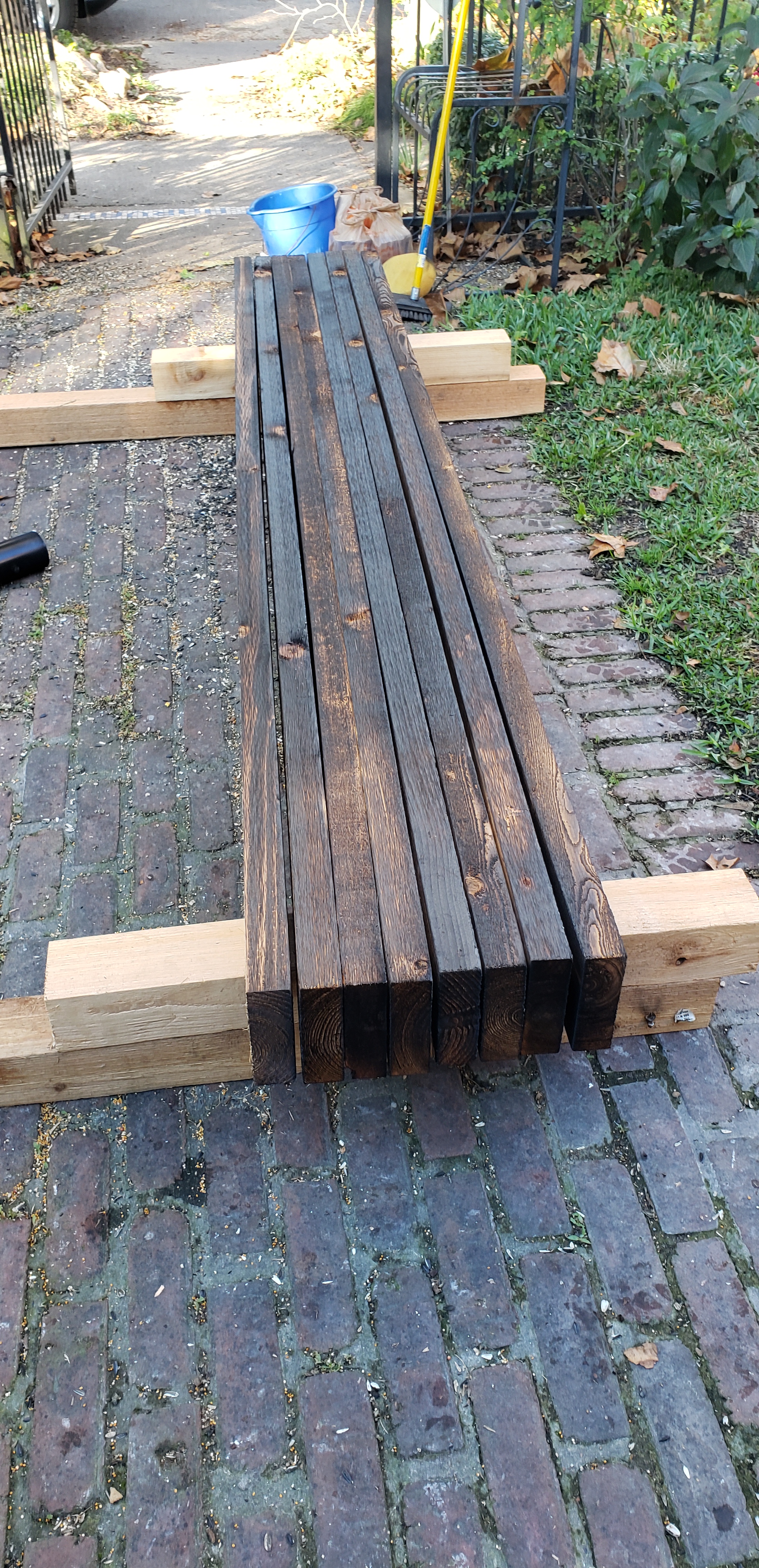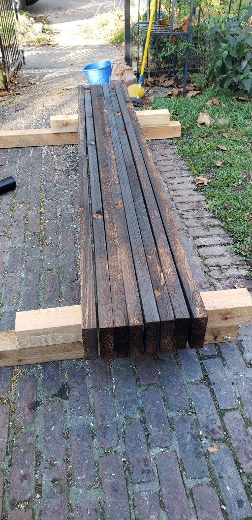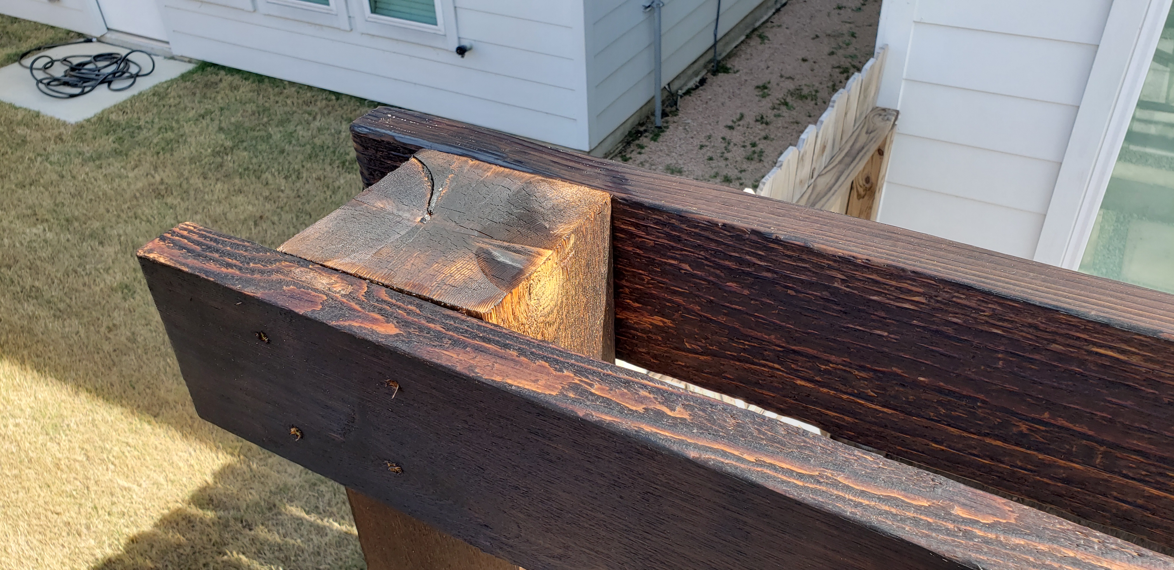 The posts had to be cut, on site and in the air, once we decided the desired height. It is challenging enough to make sure posts are plumb, and aligned, without also having to make sure they are an exact height. I used the smaller torch, yes while on a ladder, to finish the tops of the posts. The 2×6 cross-ties here, in contrast with the image before, show the deeper browns that the oil brings out. The literature we have read suggests oiling every year. We are eager to see how the characteristics change over the next few months as our seasons shift warmer.