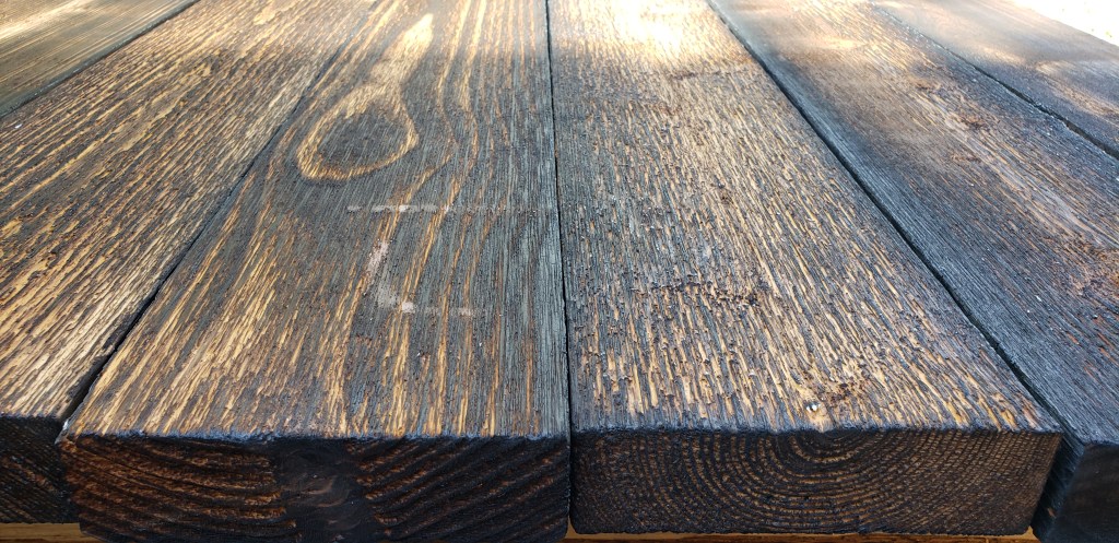 Charred and brushed. Ready to be oiled. We wood is very thirsty after the heat treatments. We oiled the lumber twice. For anyone who wants an even more charred look: I burnt some scrap pieces after having oiled them and they became a very dark brown-black. The crew disposed of them before I could take photograph