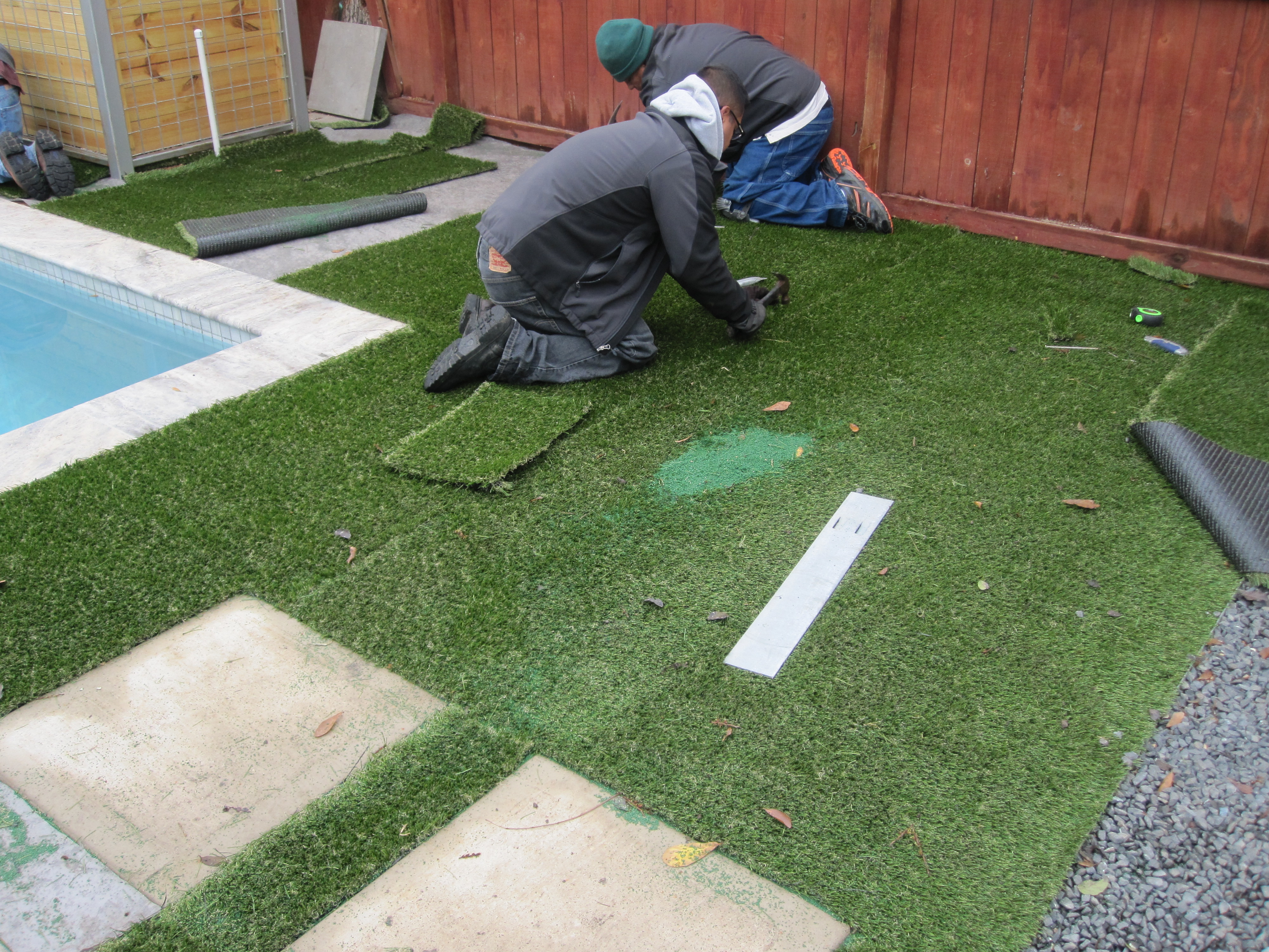 To install the grass we must have a sturdy level surface. First we excavated the area and added a base of crushed concrete, which is compacted. Next it is leveled with sand or decomposed granite. Then a weed barrier cloth is installed before the grass goes in to place.
