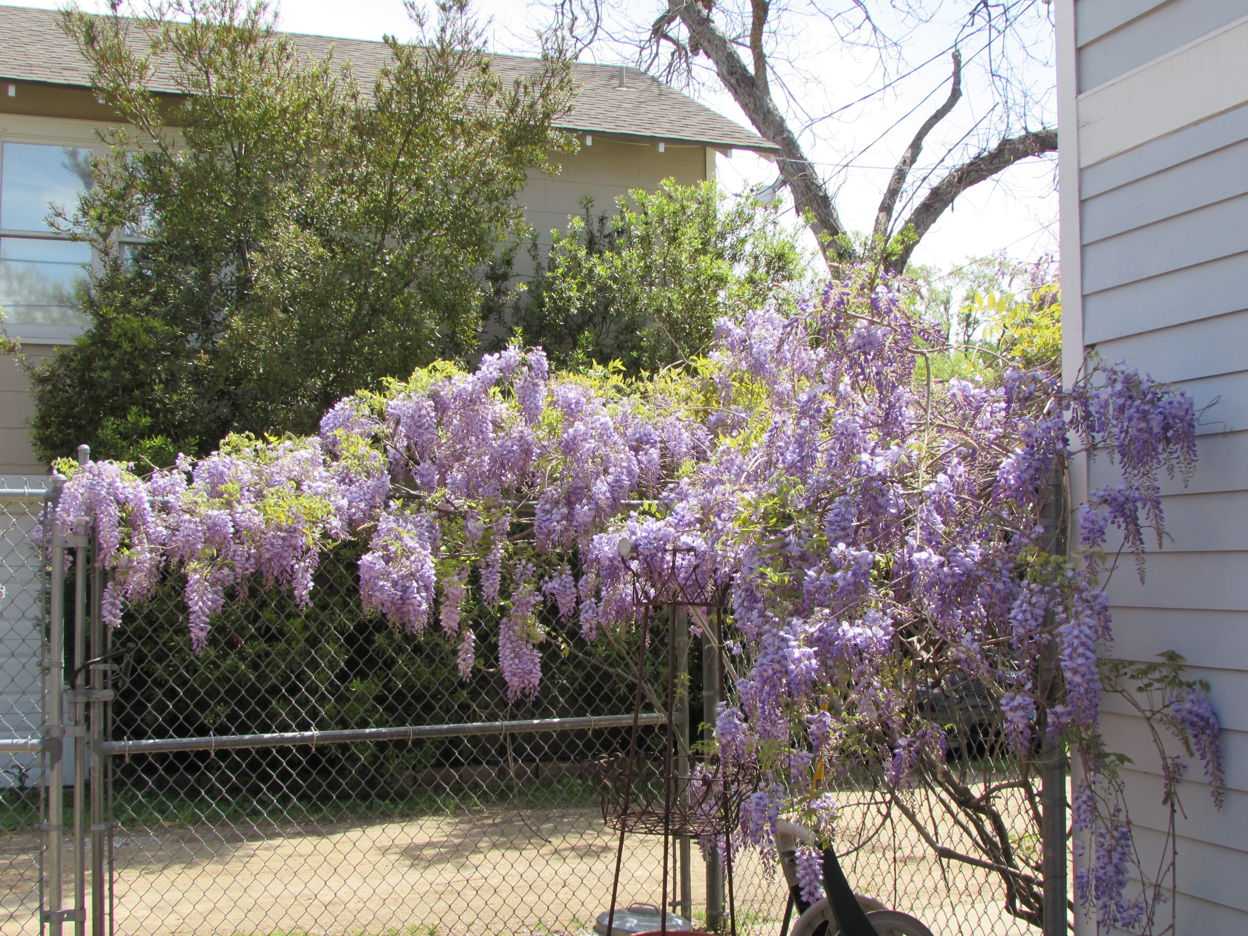 Wisteria is one of my favorite vines. I planted it here at Ravenscourt when I built a new garage with a guest cottage on top. The wisteria grows up the stairs to the little porch on one side and across the small pergola above the garage door on the alley side. It is a wonderful bloomer and is maturing nicely. We have had to cut it back to paint the stairs and when it got too heavy for the pergola.