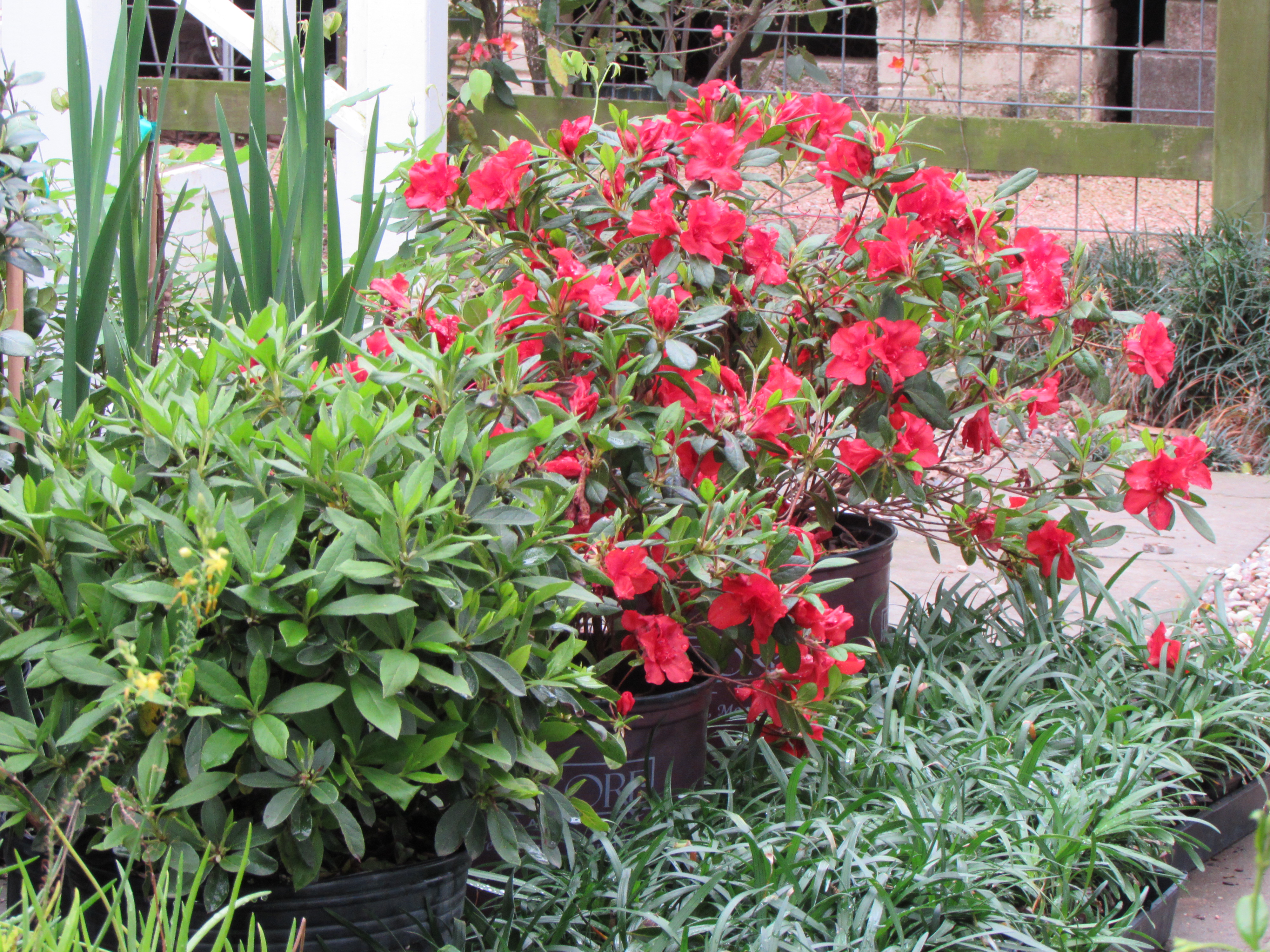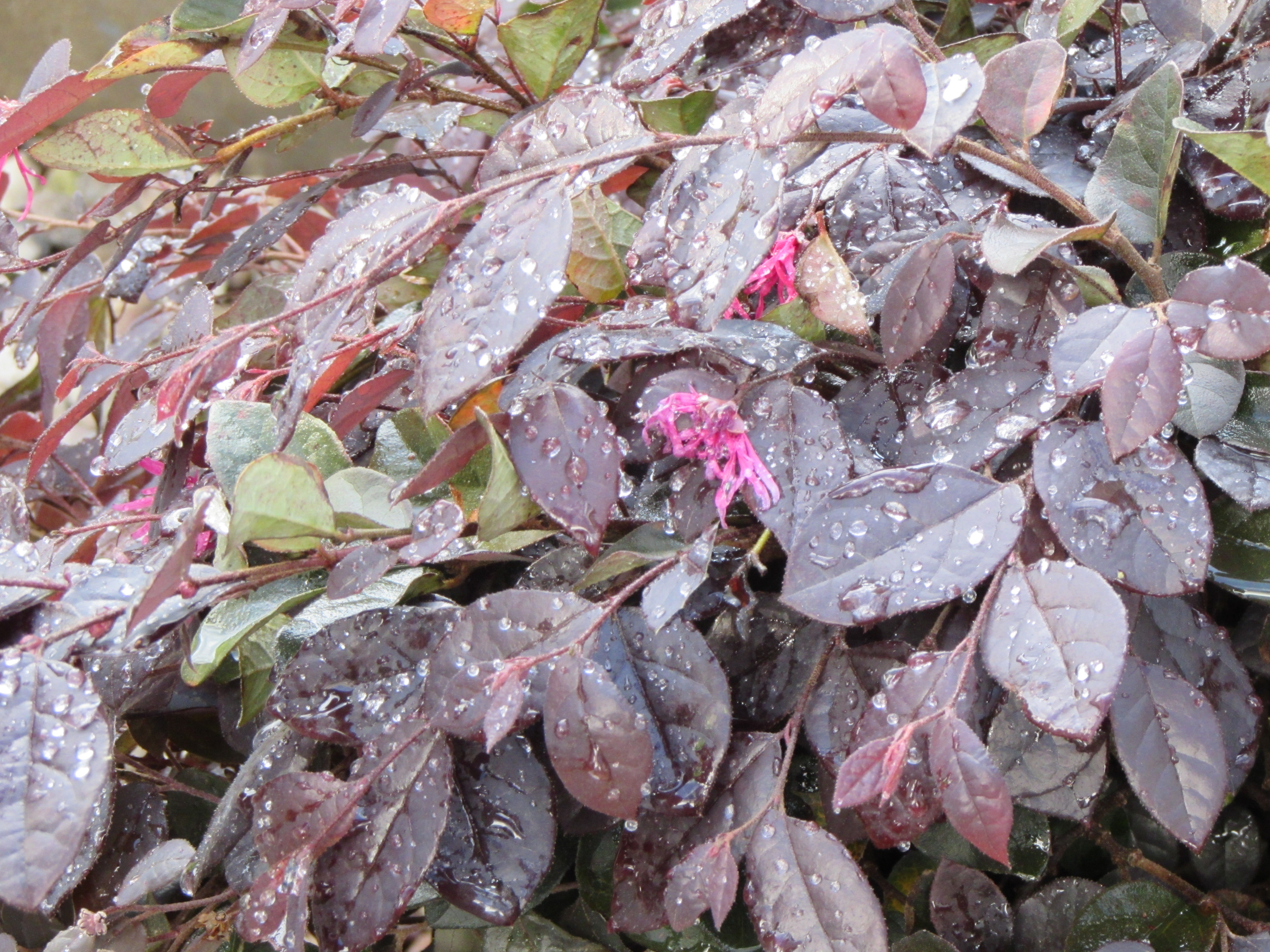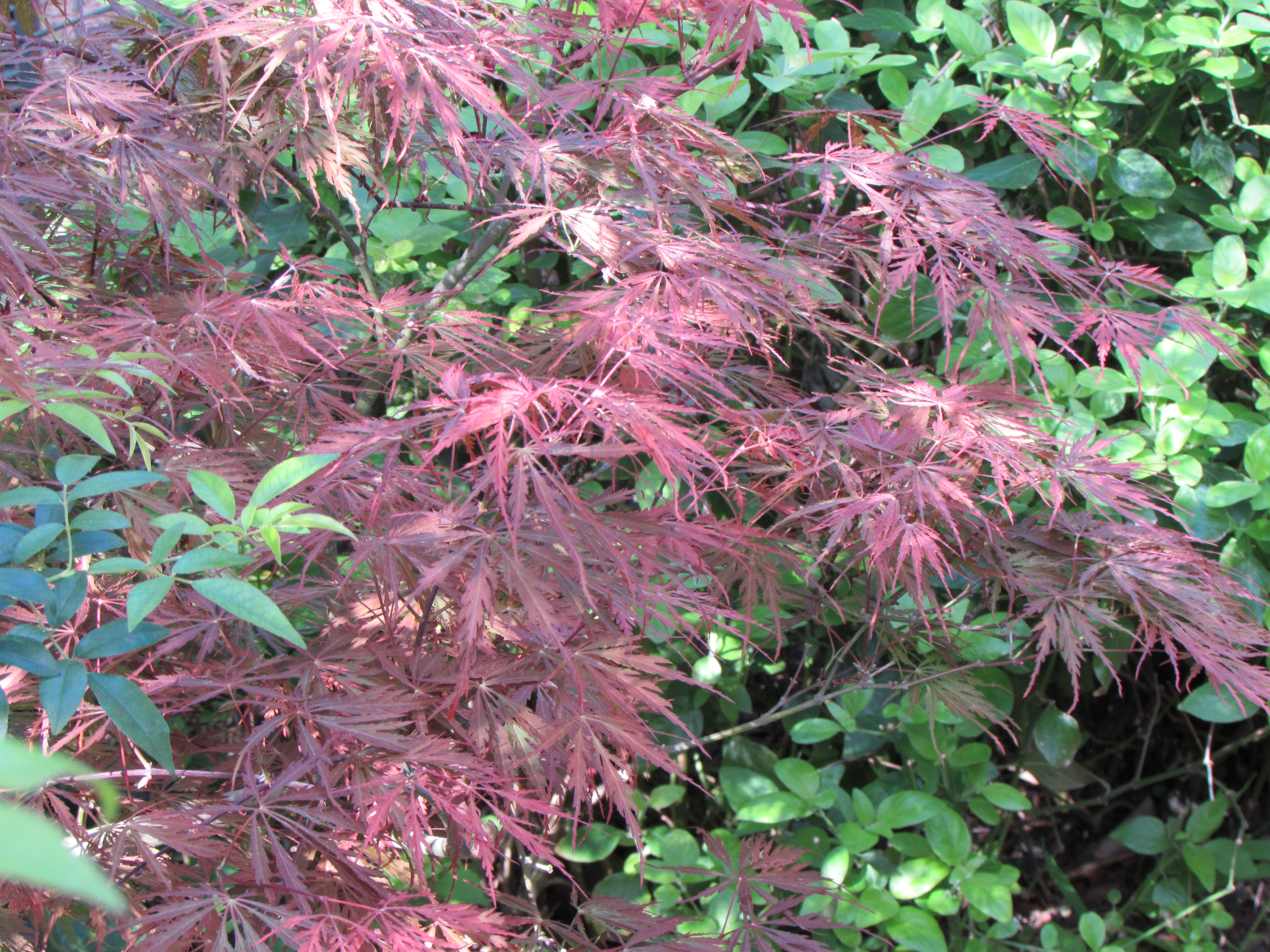 I love to plant a beautiful plant with a deep warm shade of red next to one with cool green leaves. Because flowers are often fleeting I look to the leaves when creating a design. For some reason I am very attracted to plants that have any shade of red in their leaves. I enjoy red flowers but not as much as leaves. The fronds of Autumn fern in the spring are a multitude of color…from rust to chartreuse. My laceleaf Japanese maples is stunning with its crimson leaves that will fade to green by summer. I like pairing plants with deep red or burgundy foliage next to plants with shades of lime green. The contrast between my oakleaf hydrangea and loropetalum is exciting even on a cloudy day. I would never wear a shirt with that much contrast but in nature it delights my eye with its dramatic contrast!