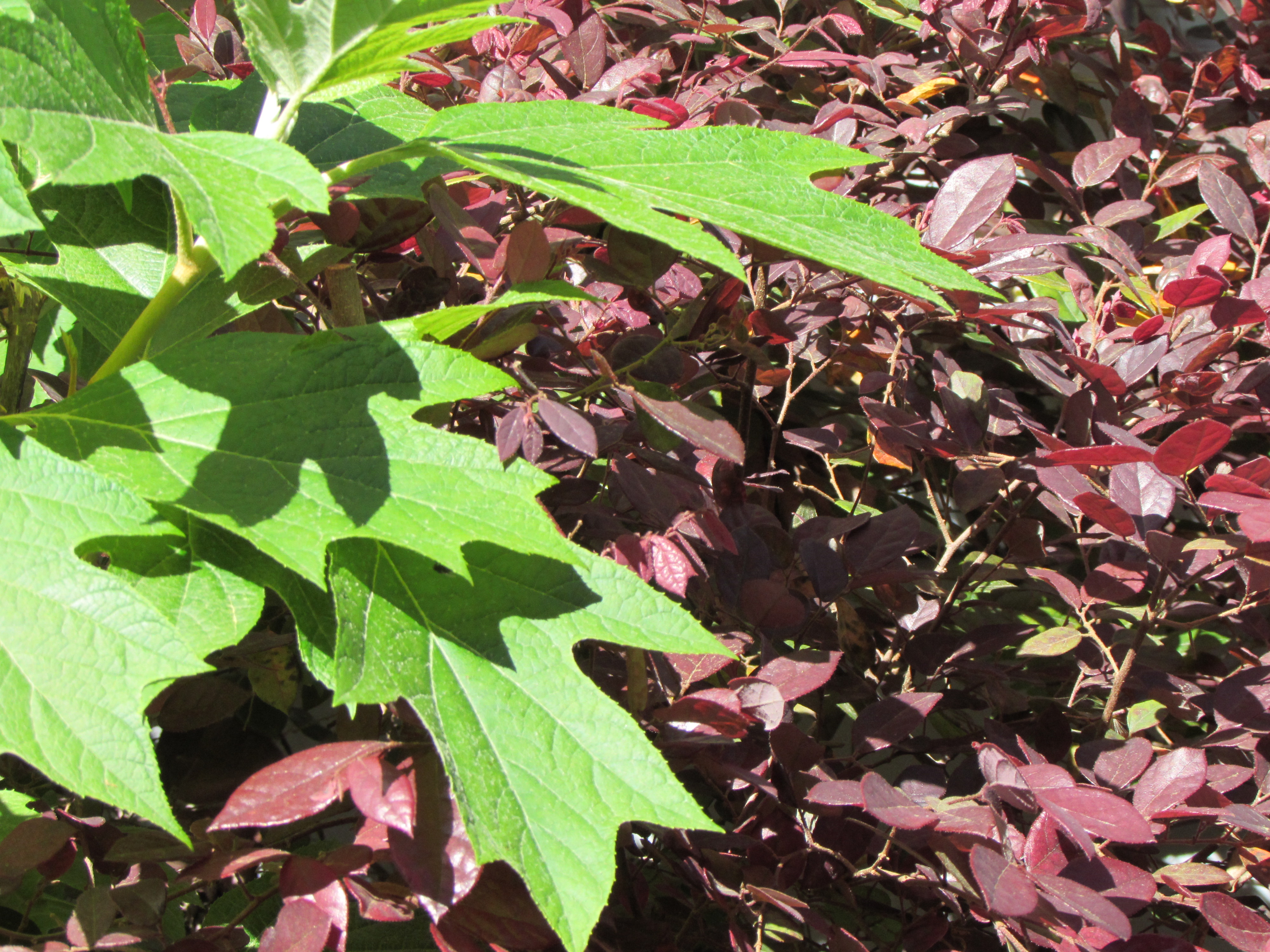 additive color, Charles Blanc, color star, color theory, color wheel in flowers, Laceleaf Japanese Maple, Loropetalum, Oakleaf hydrangea, red and green plants, subtractive color