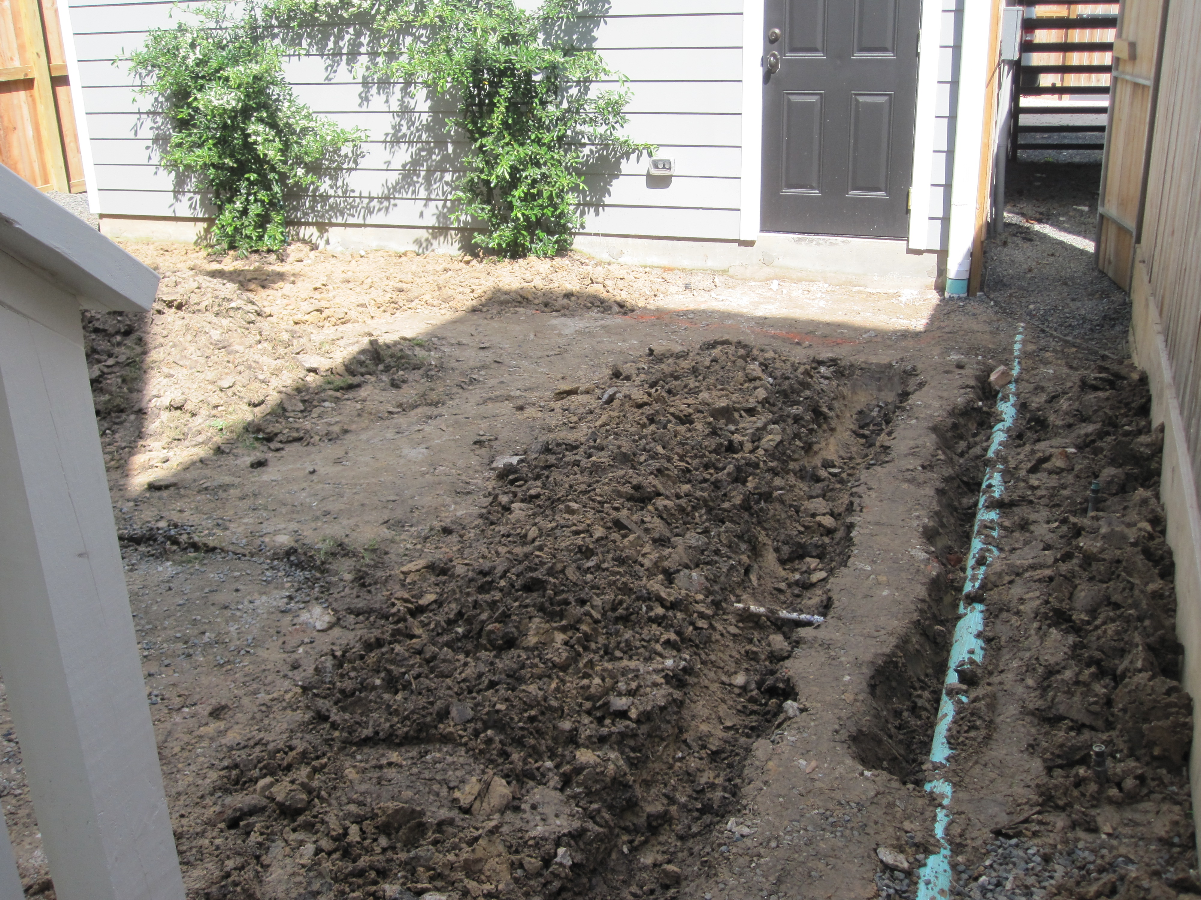 Below-ground conditions had to be changed at several turns. This drain line ran straight through the bed where we wanted to plant several trees. Fortunately it was no surprise as we saw the builder install it. A slight shift over and we had plenty of room. Once we dug down sufficiently in our patio site we were ready to bring in our base material.