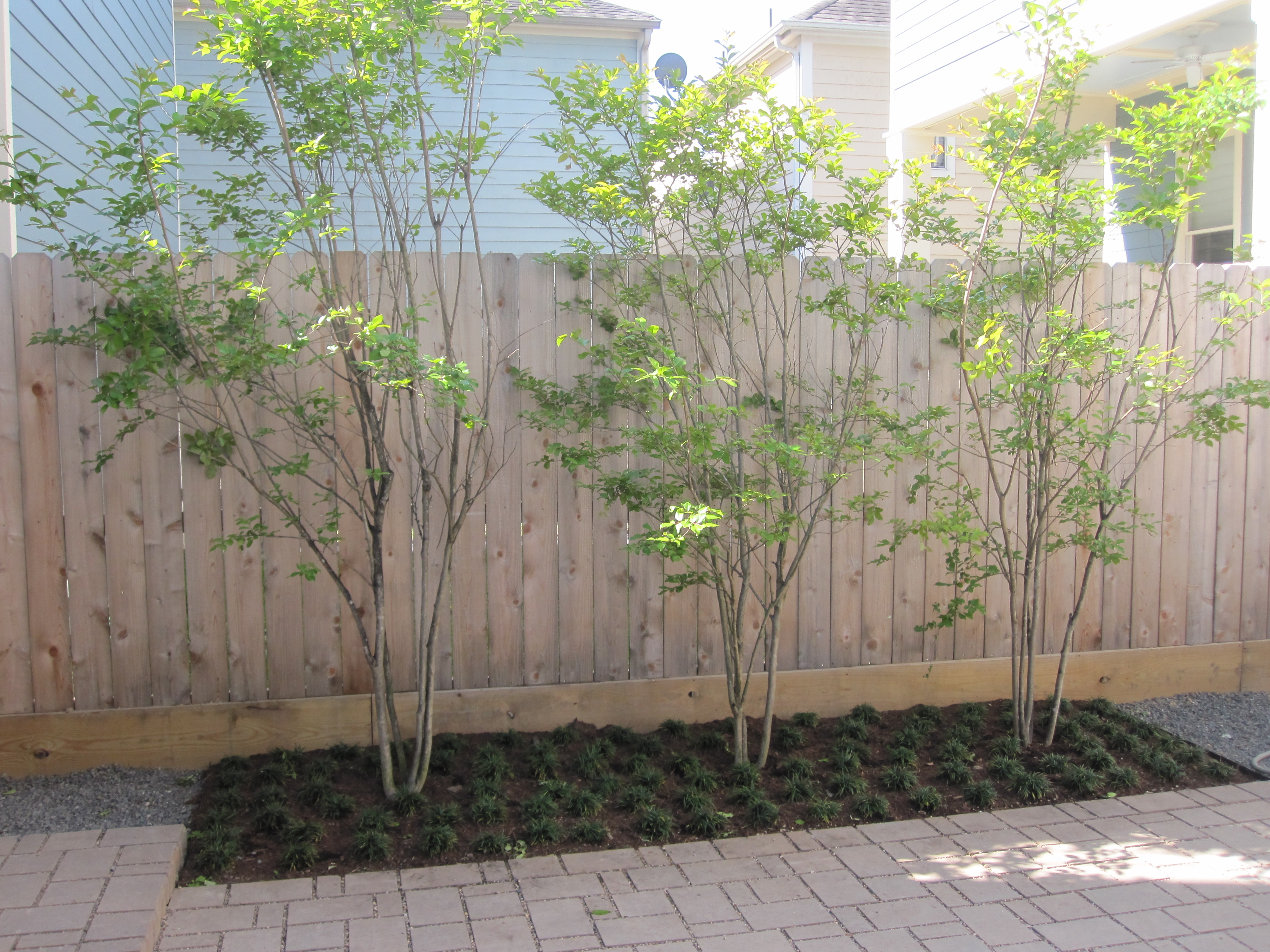 As these Muskogee Crape myrtles grow taller they will add more shade from the southern sun on part of the patio.