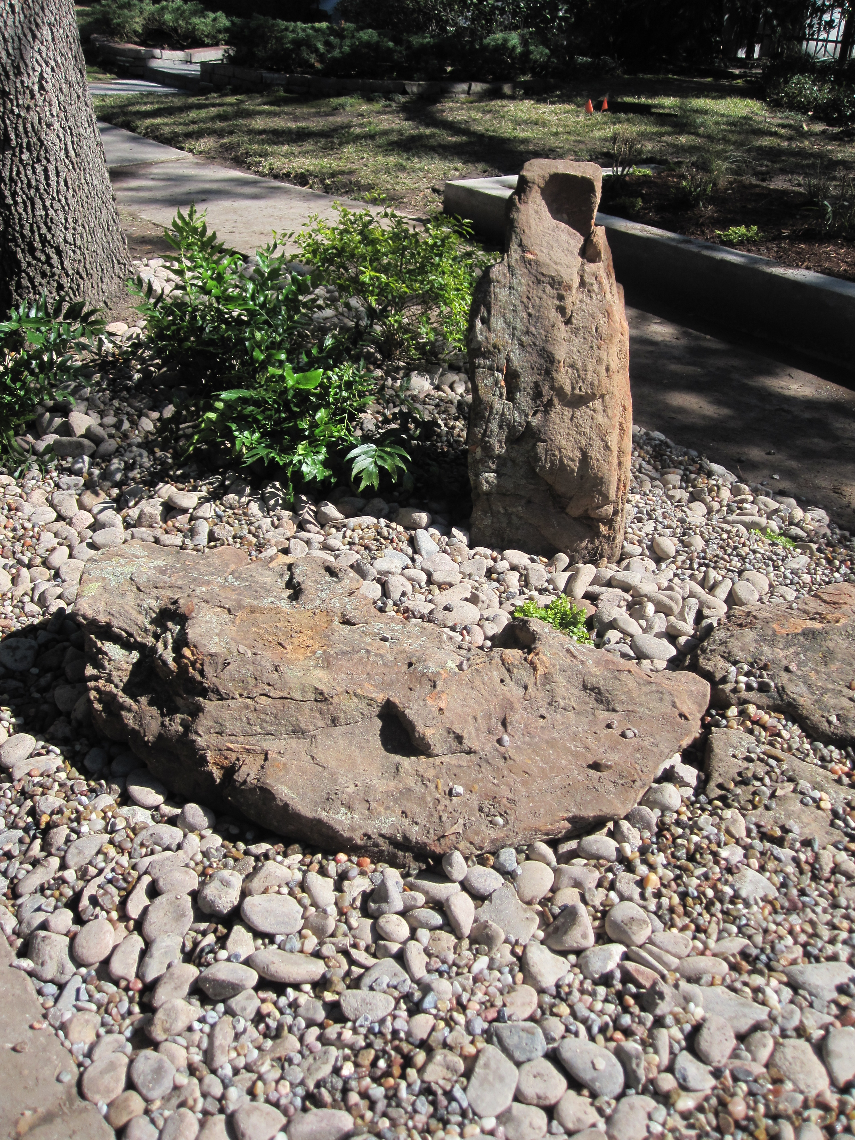 The rocks and boulders make a fun visual treat for people walking by while letting the ground remain totally water permeable so the trees can get as much water as possible.