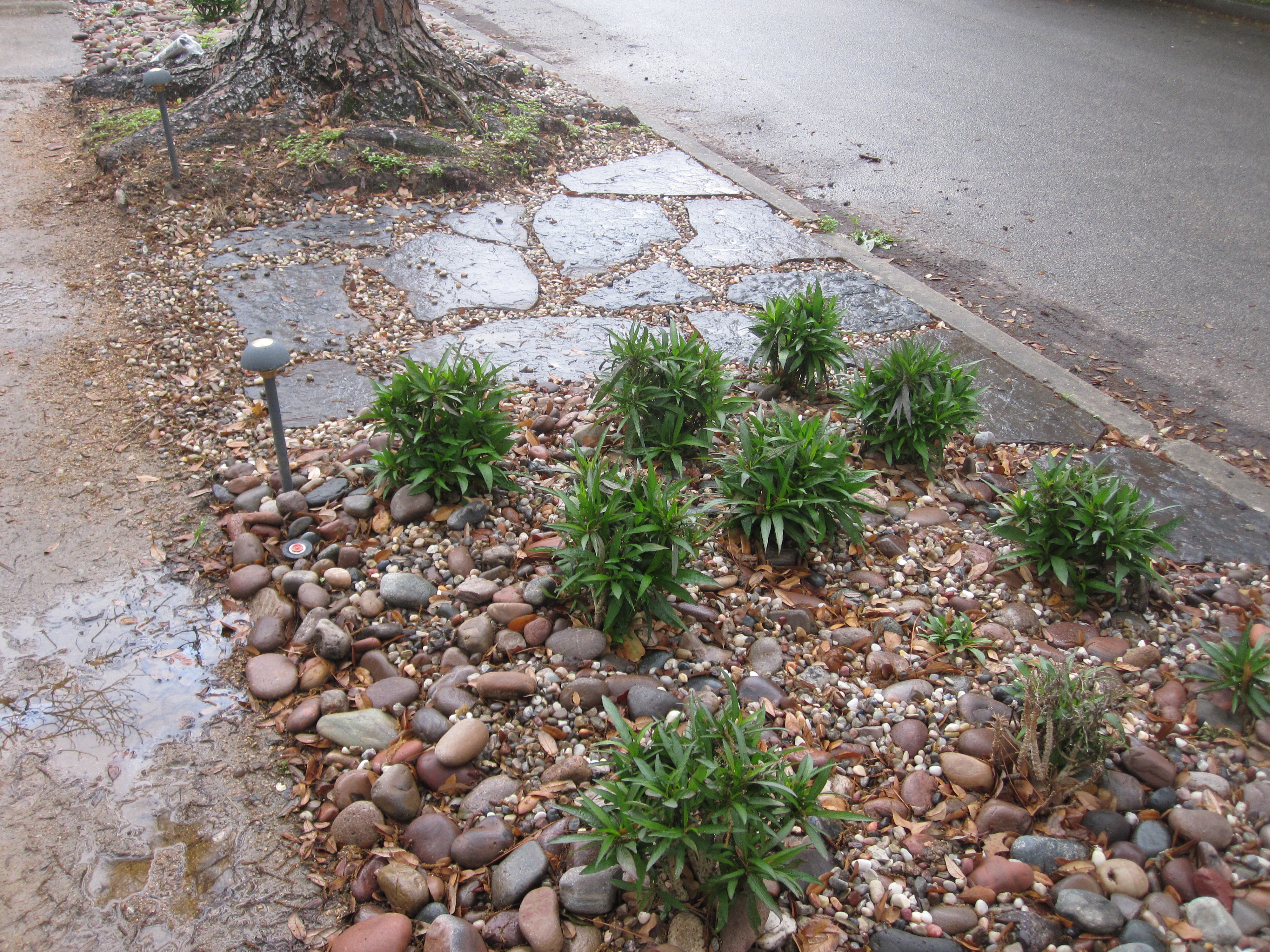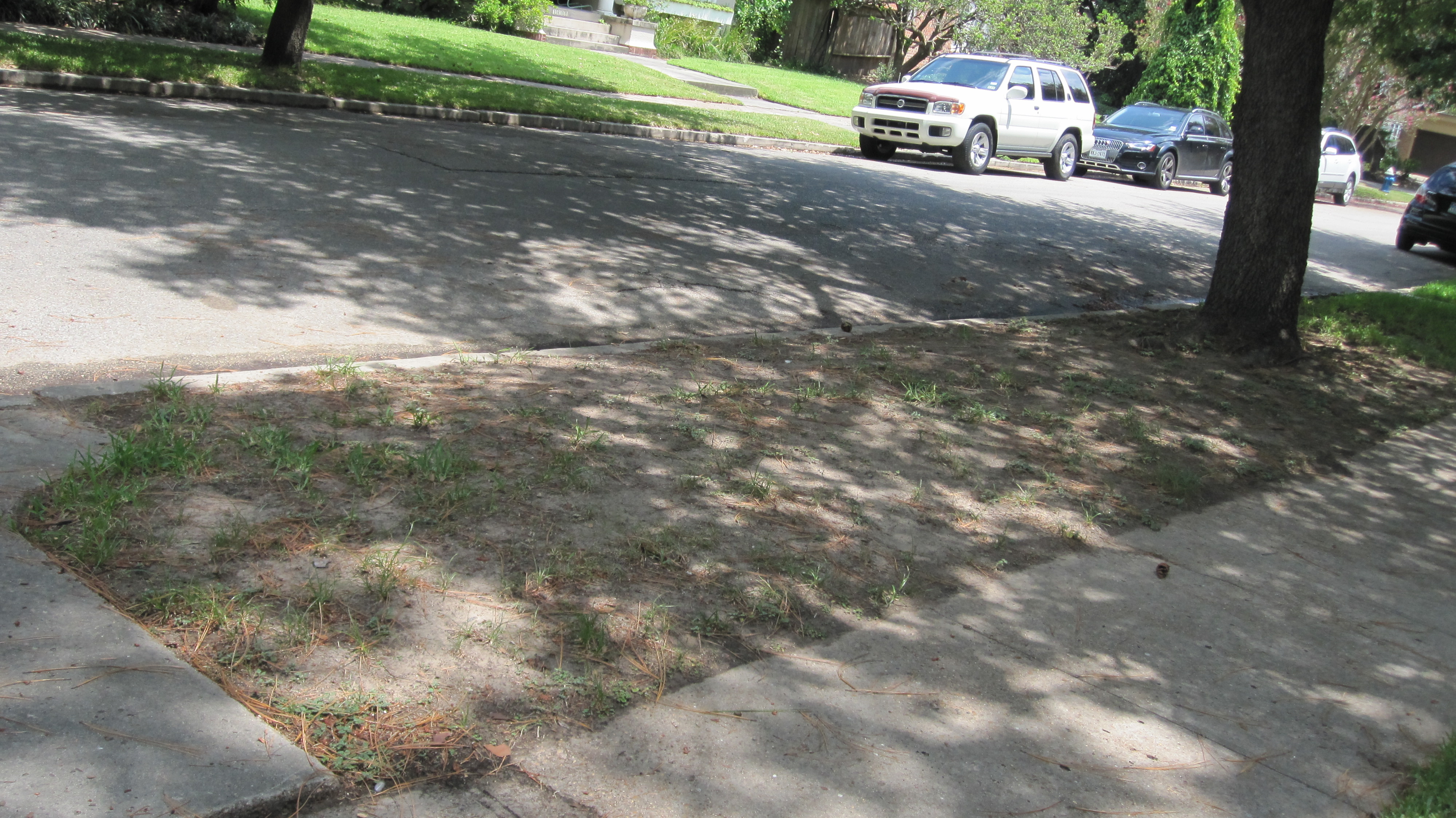 When we first visited this property the Right-of-Way was bare dirt, a few weeds and a tall oak and pine tree flanking each side. The grass had failed during the drought and now the soil was very hard packed. The side walk was broken and lifting up from large roots of the two big trees. The owners wanted a low maintenance solution that would also be interesting to passers by.