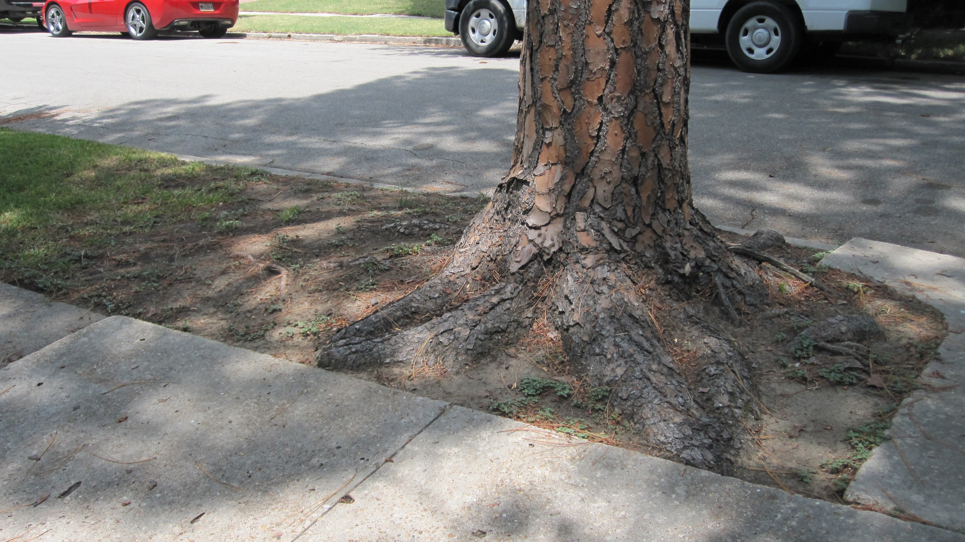 In the area where the old broken and dangerous sidewalk was removed we used decomposed granite as a replacement. It is compacted in and makes for a smooth walking surface. It also allows the water to seep down to be available to the tree. And, if the roots push up again it is easy to refresh. This is neighborhood where people walk and safety is very important.
