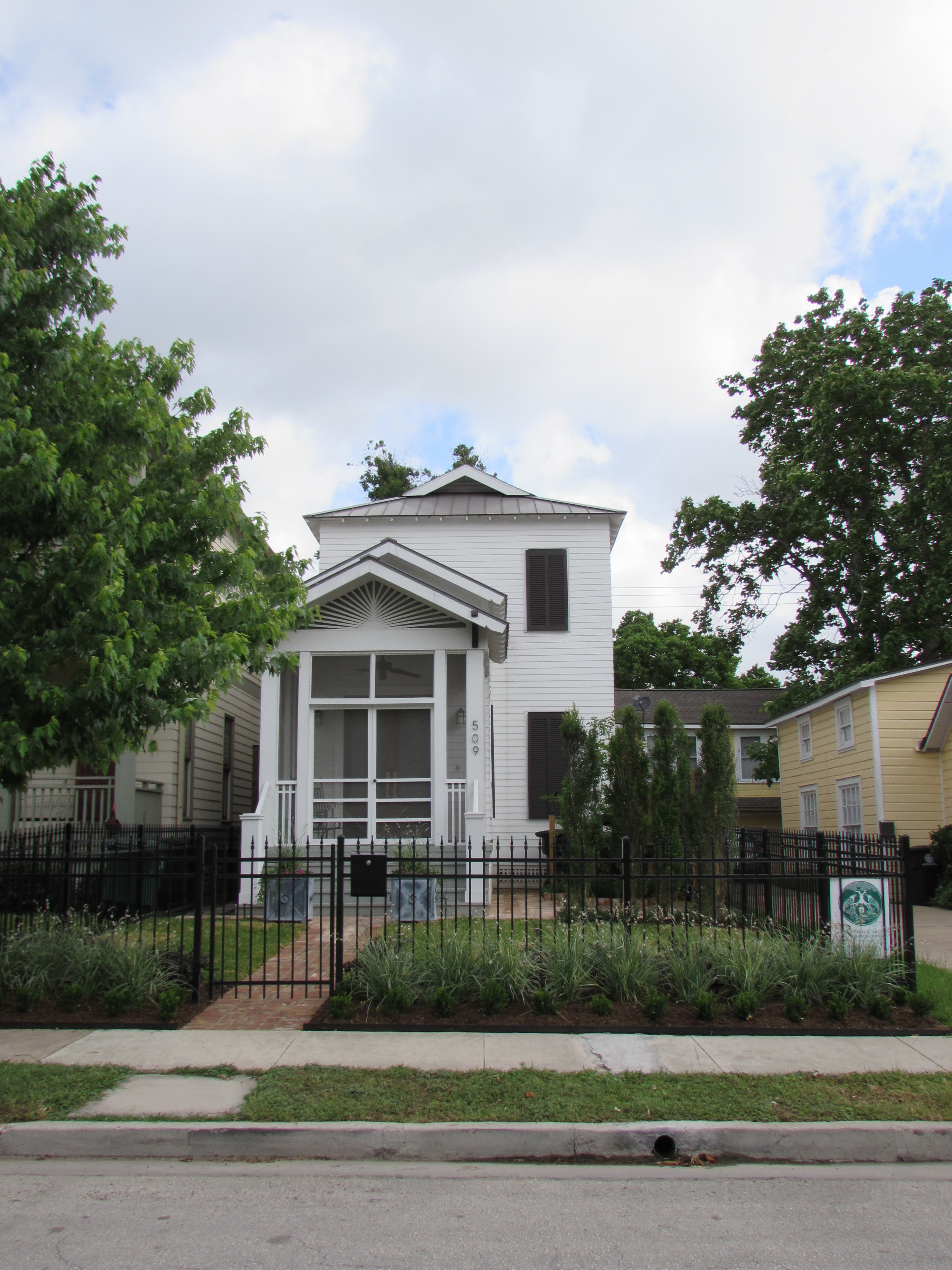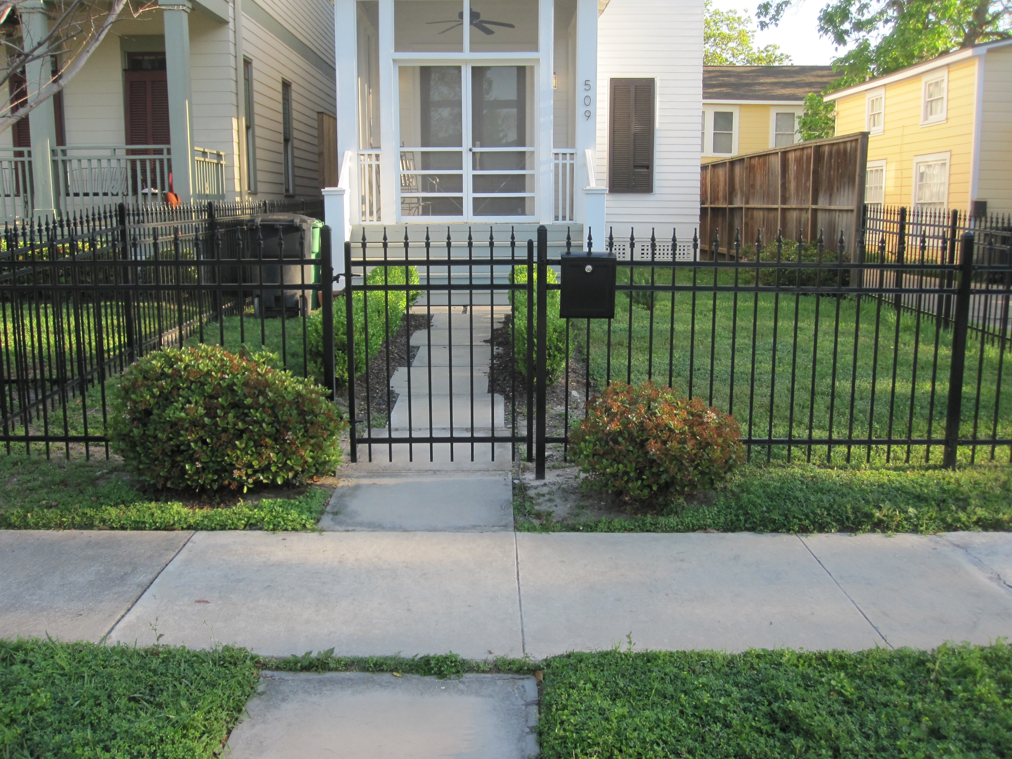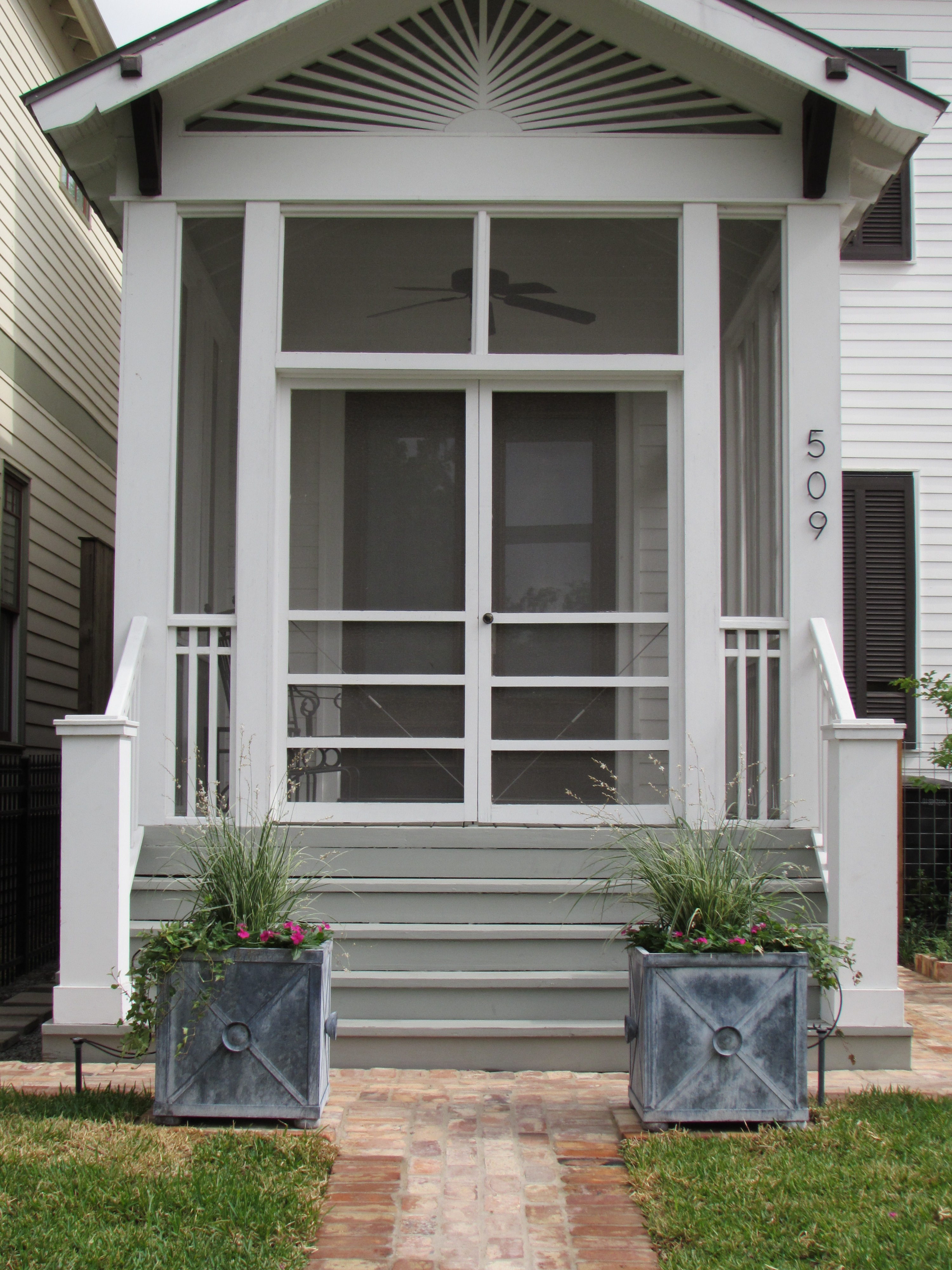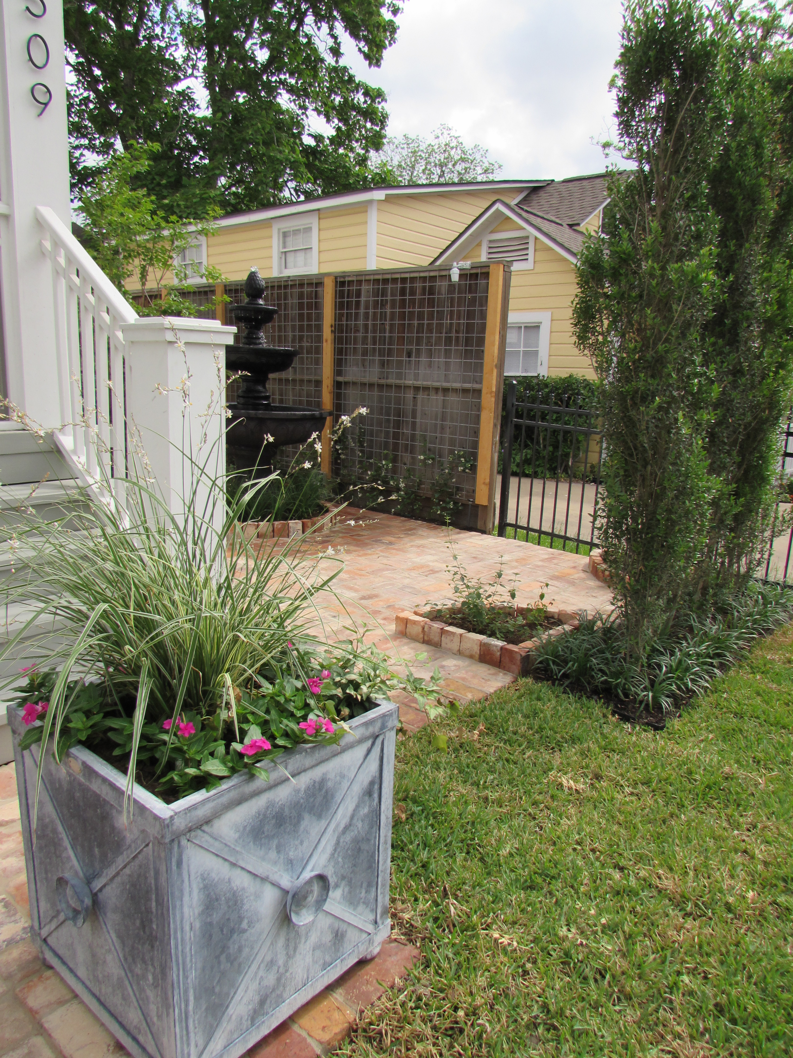 Just finished and ready to enjoy! This newly built home has a garage in back off the alley but no backyard. Everything is out front and exposed. The owner wanted curb appeal, that was simple, with neat lines and easy to maintain. There was also a need for a place to hide trash cans. We often get vague desires from clients and when they give us enough freedom, we can create some rather fun spaces. In Houston a screened porch is a great place to enjoy being outside without being eaten alive by mosquitoes. I still felt that it needed a space that invited you out in to the garden, especially on those beautiful spring days when the air is dry and there is a slight breeze. Breaking the yard into two spaces allowed us to make a courtyard area with just enough room for a couple of chairs and a cafe table. We installed an over-sized fountain so it can be enjoyed from the screen porch as well as the little courtyard.