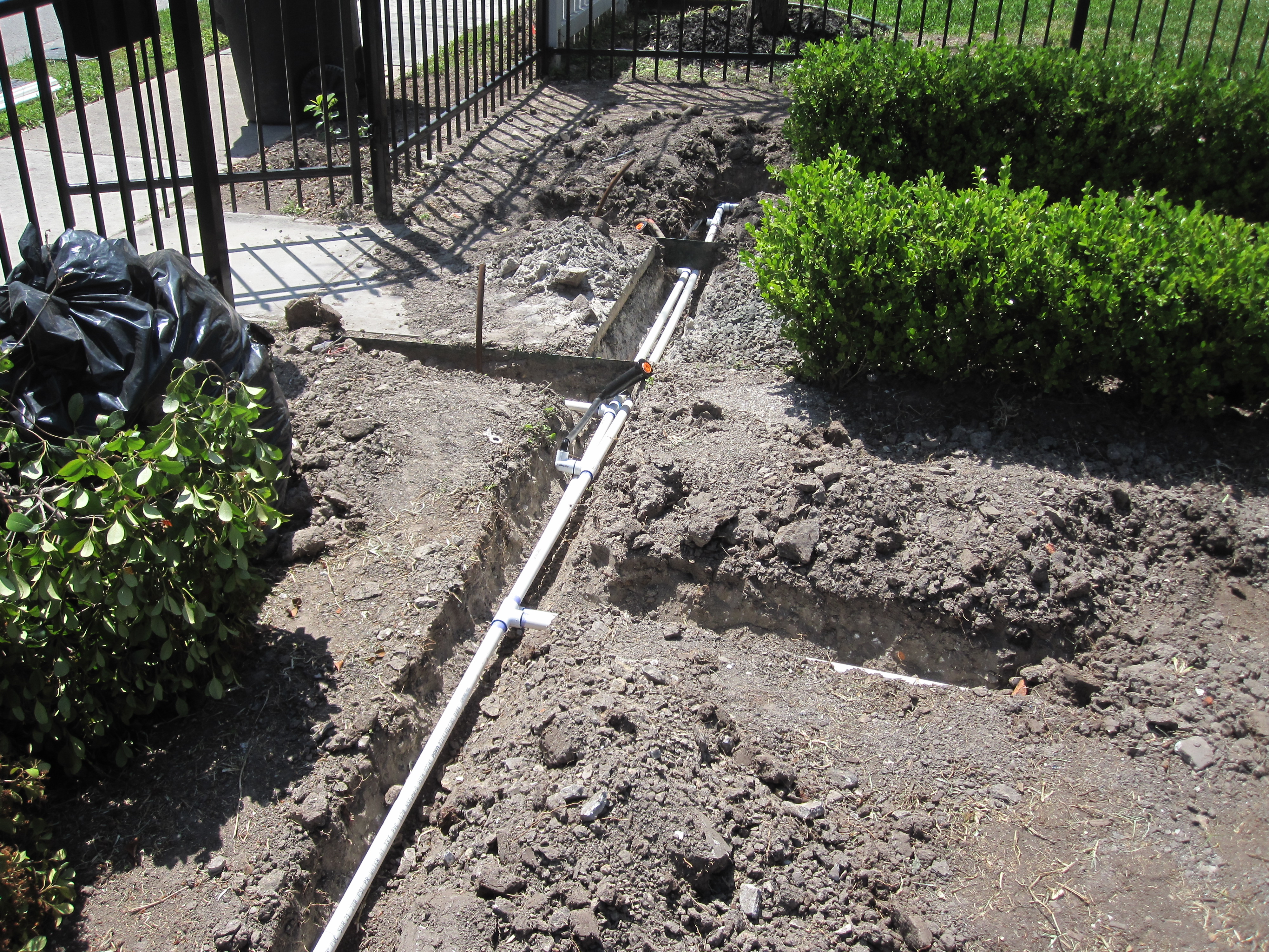 We start below ground doing the most disruptive and messy work first. Trenching for irrigation and drain lines needs to follow the parameters of the design. This takes good planing and often some creativity. In the state of Texas you are required to have a license to install an irrigation system. One thing we like to keep in mind is the future in terms of possible repairs or adjustment.