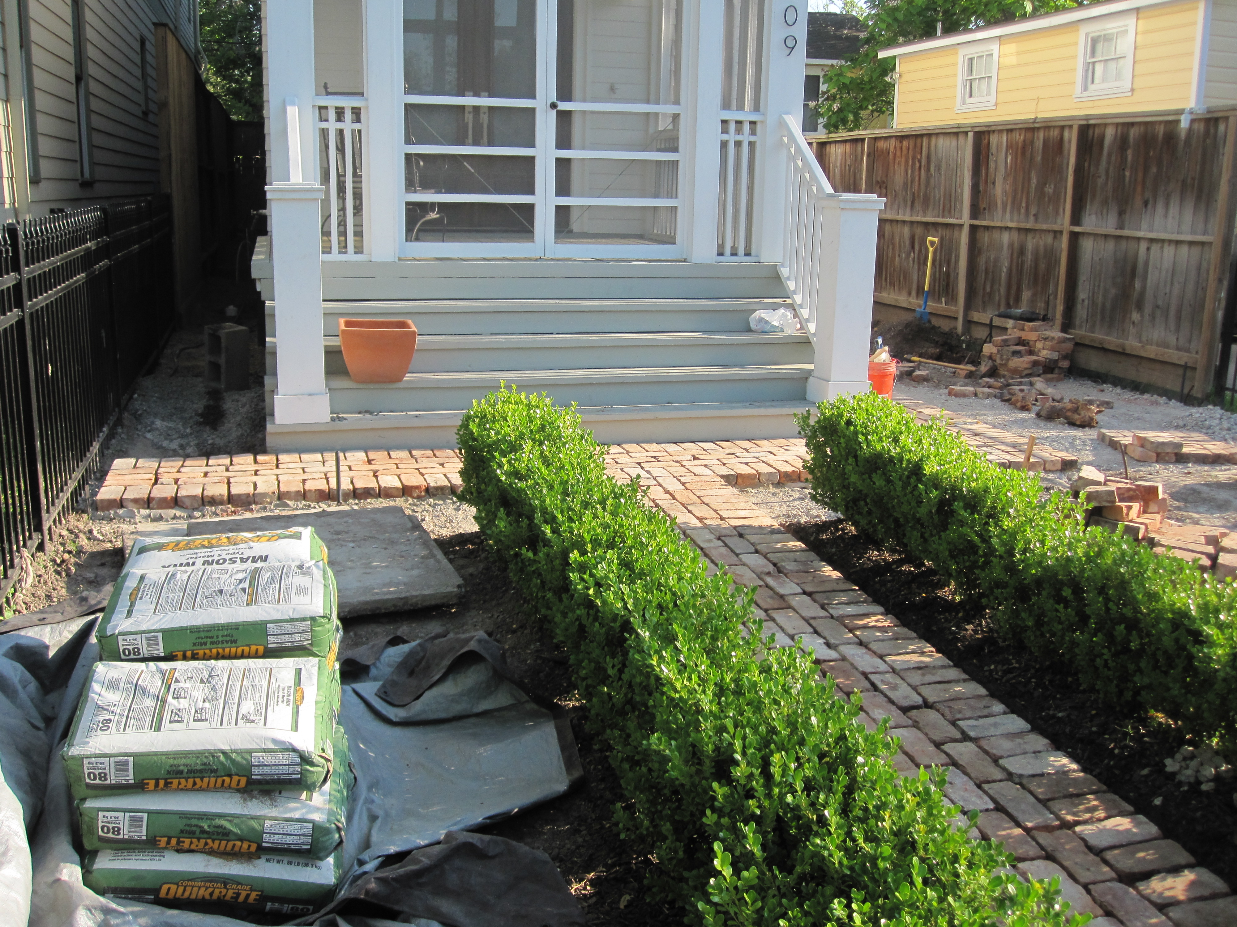 Because the yard was small, and there was a fence at the front of the property, we had to make sure to not have crewmen stepping all over one another, or on freshly laid bricks. In this job we had only a couple of men working on the approach, as it came to the public sidewalk. This way we could keep weight off of this high-traffic section until it had time to set. We use ready-mixes of concrete and mortar. Working with small batches allows us time to get everything as precise as possible. The downside is working with these small batches does drive up our cost. The upside is it helps us keep a neater work-site and less chance of errors; a trade we are happy to make.
