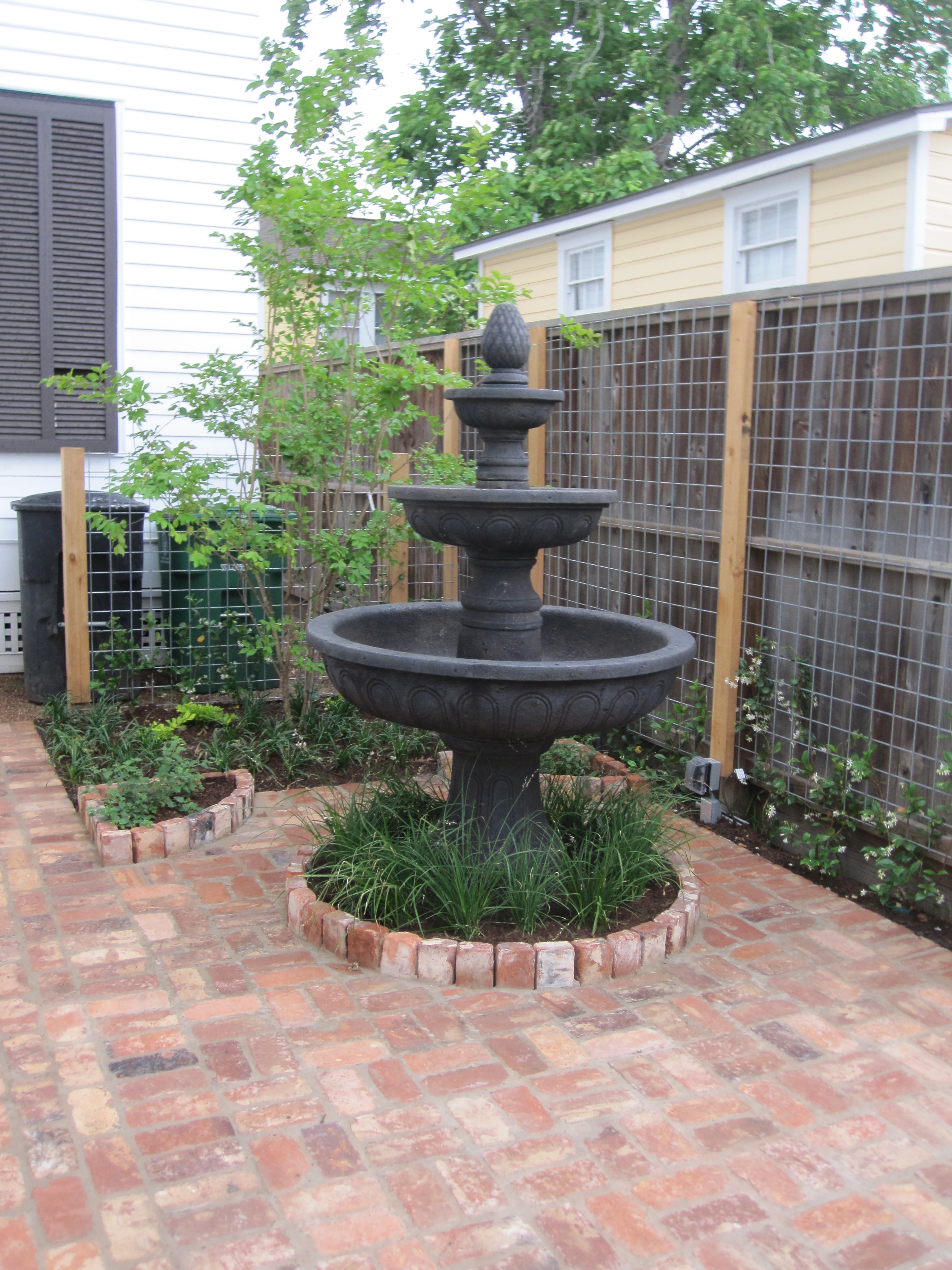 Here, we see the unveiling of the over-sized fountain! Remember we wanted a feature that could also be enjoyed while sitting on the screened porch. To give you a sense of scale it is 72″ tall. A simple screen on the fence will give the star jasmine a frame to climb upon and hide the fence in a couple of years. A 45-gallon Natchez crape myrtle is centered in the bed behind and will create nice shade and seasonal interest as it matures. A low screen was constructed behind this bed, also planted with Star jasmine, to create a second green wall. We kept this screen lower to allow the client to see the garden and fountain from the window behind.
