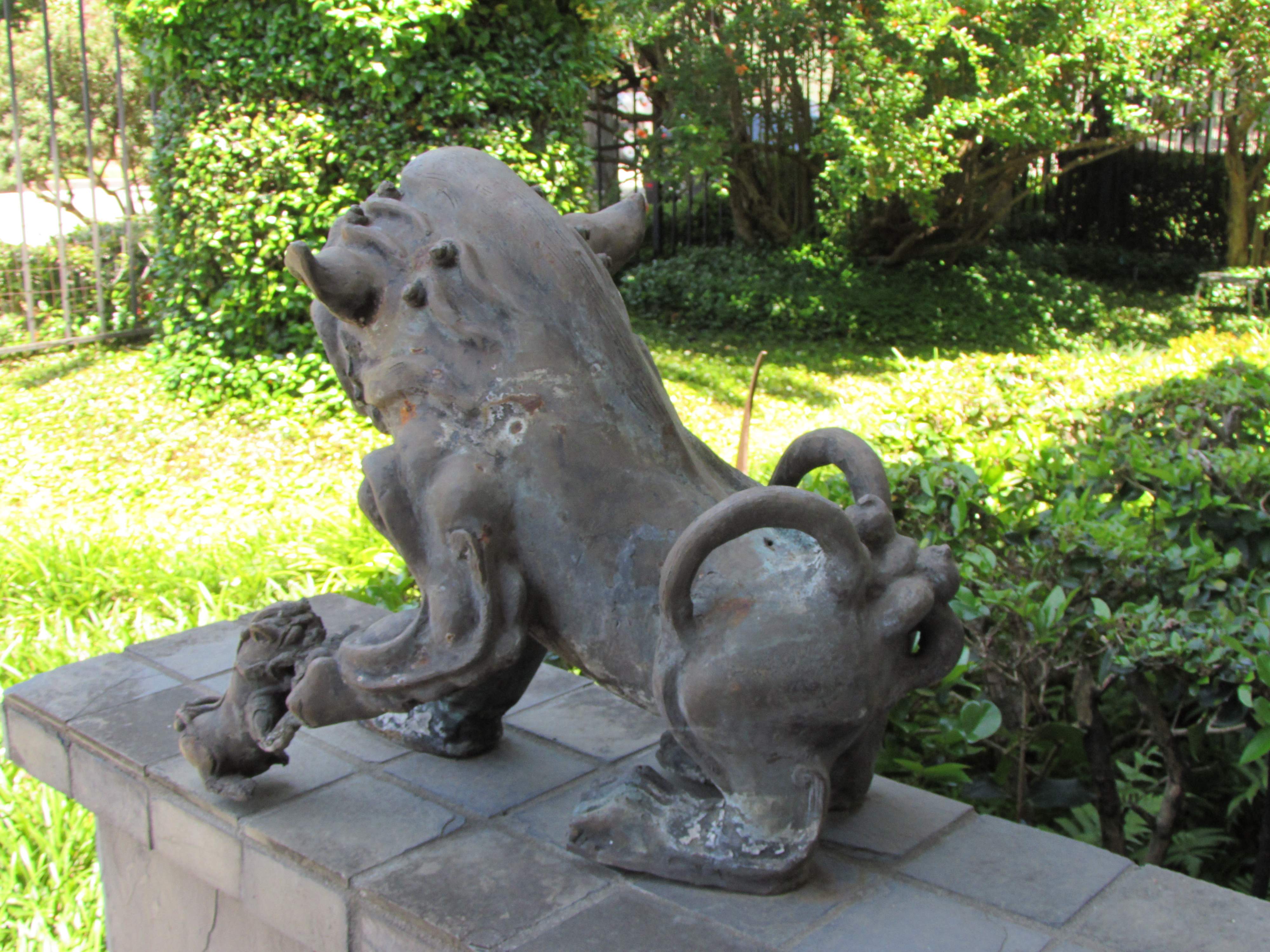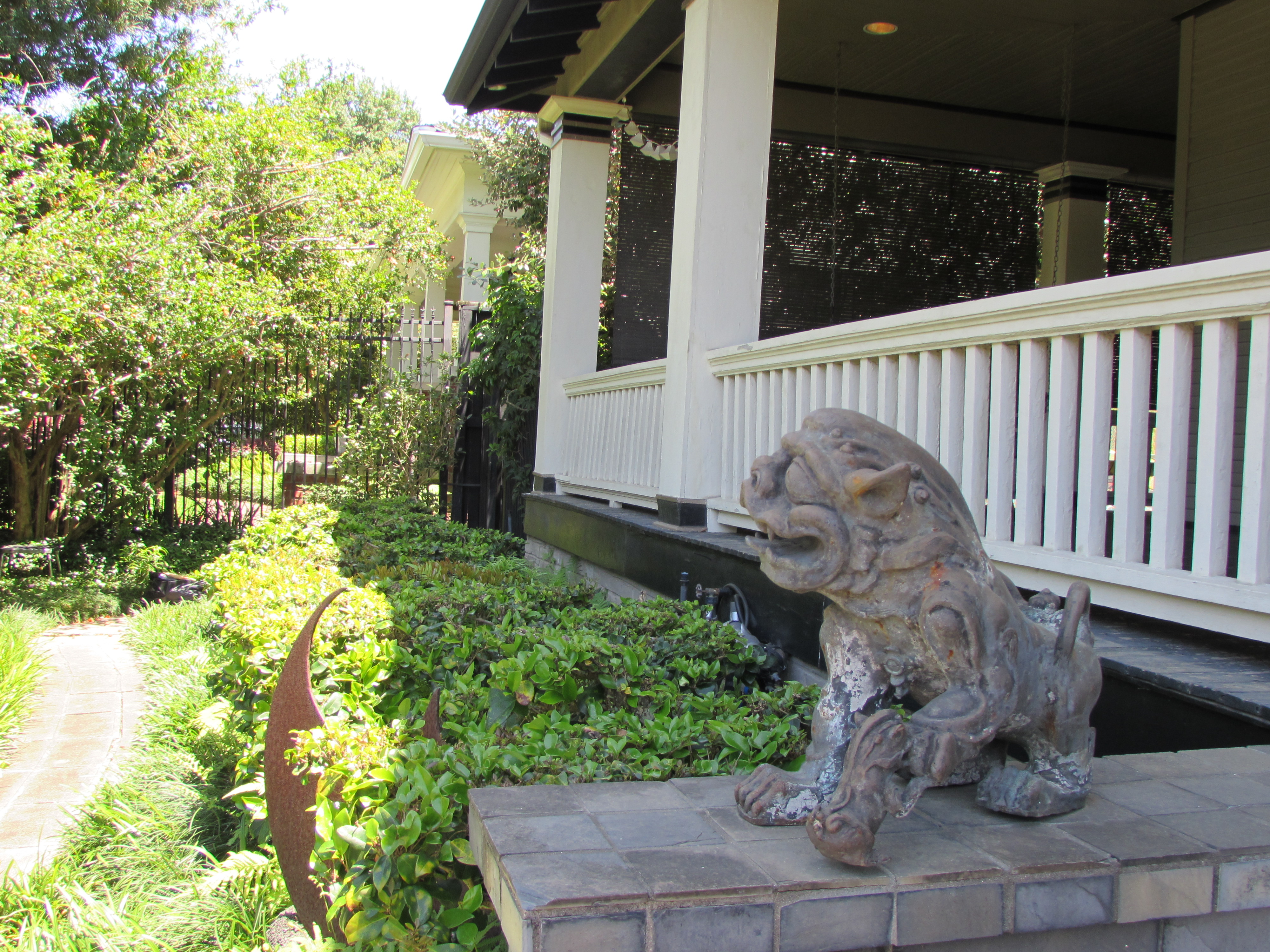 Asian garden, brass bells, bungalow, Collectors Weekly, dragon mural, Foo dogs, Foo lions, Houston, orchid house, Ravenscourt Landscaping & Design LLC, Tea's Nursery