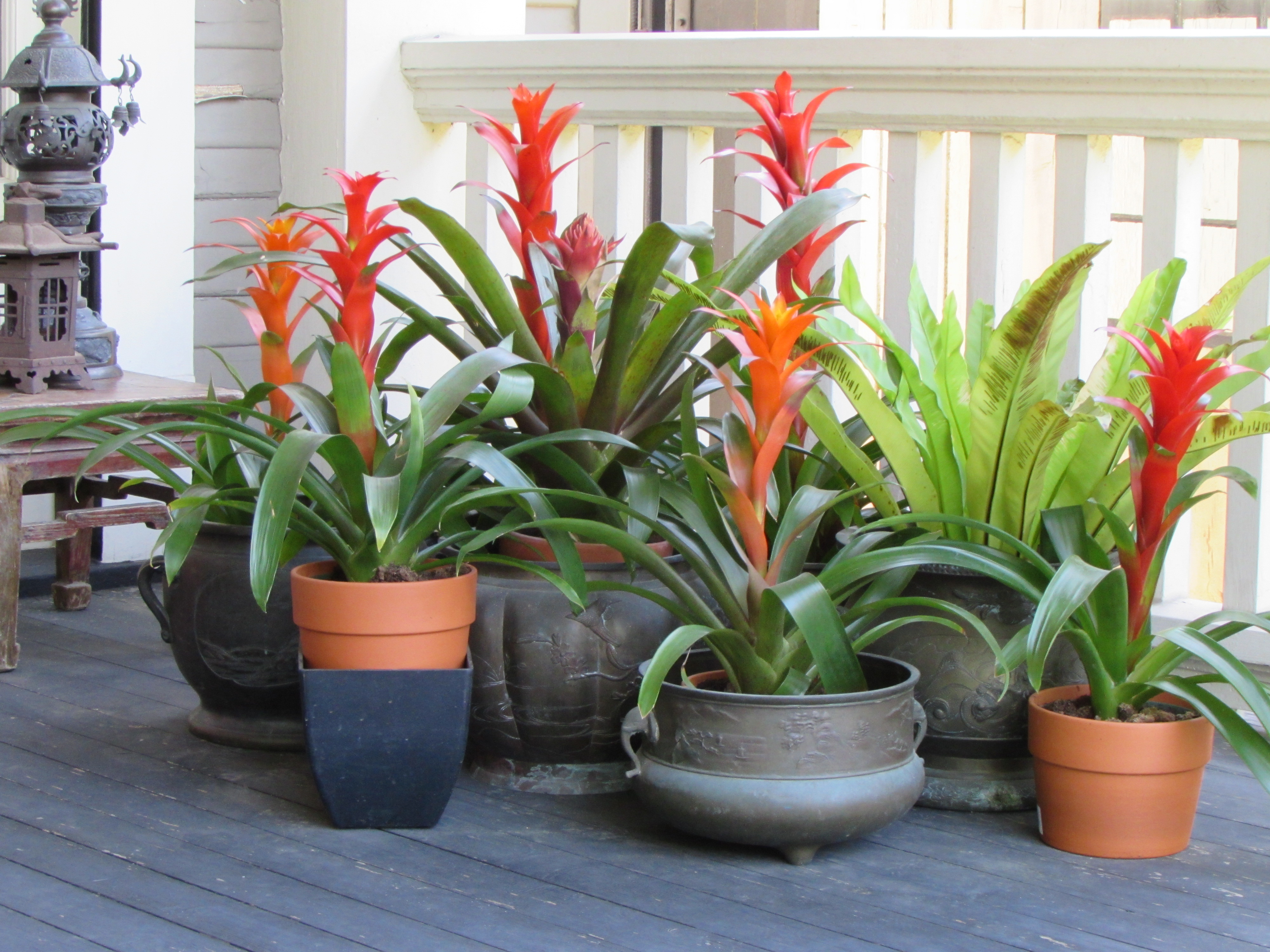 The bright orange flowers of these bromeliad in their cluster of brass pots invites you to the front door.
