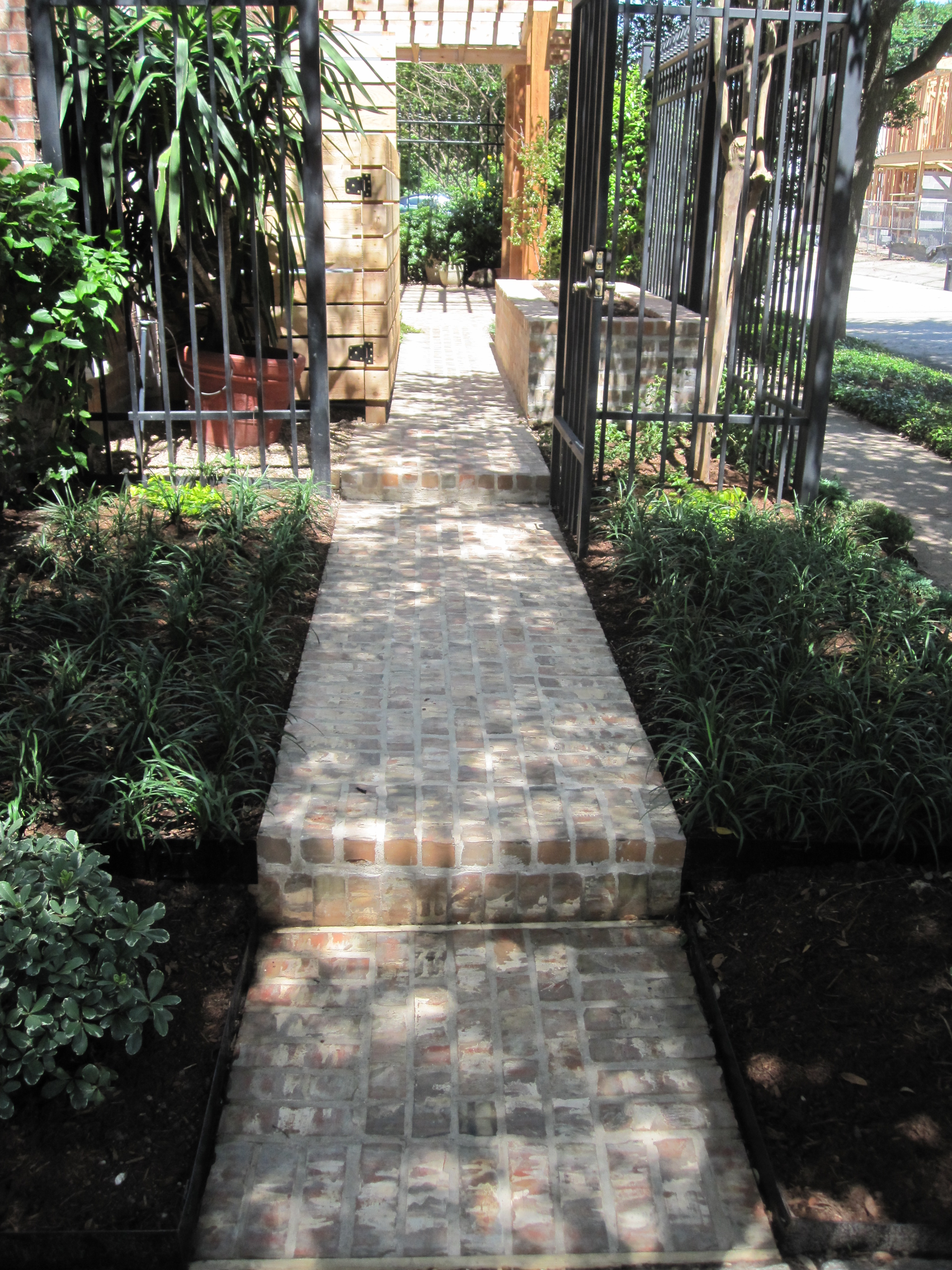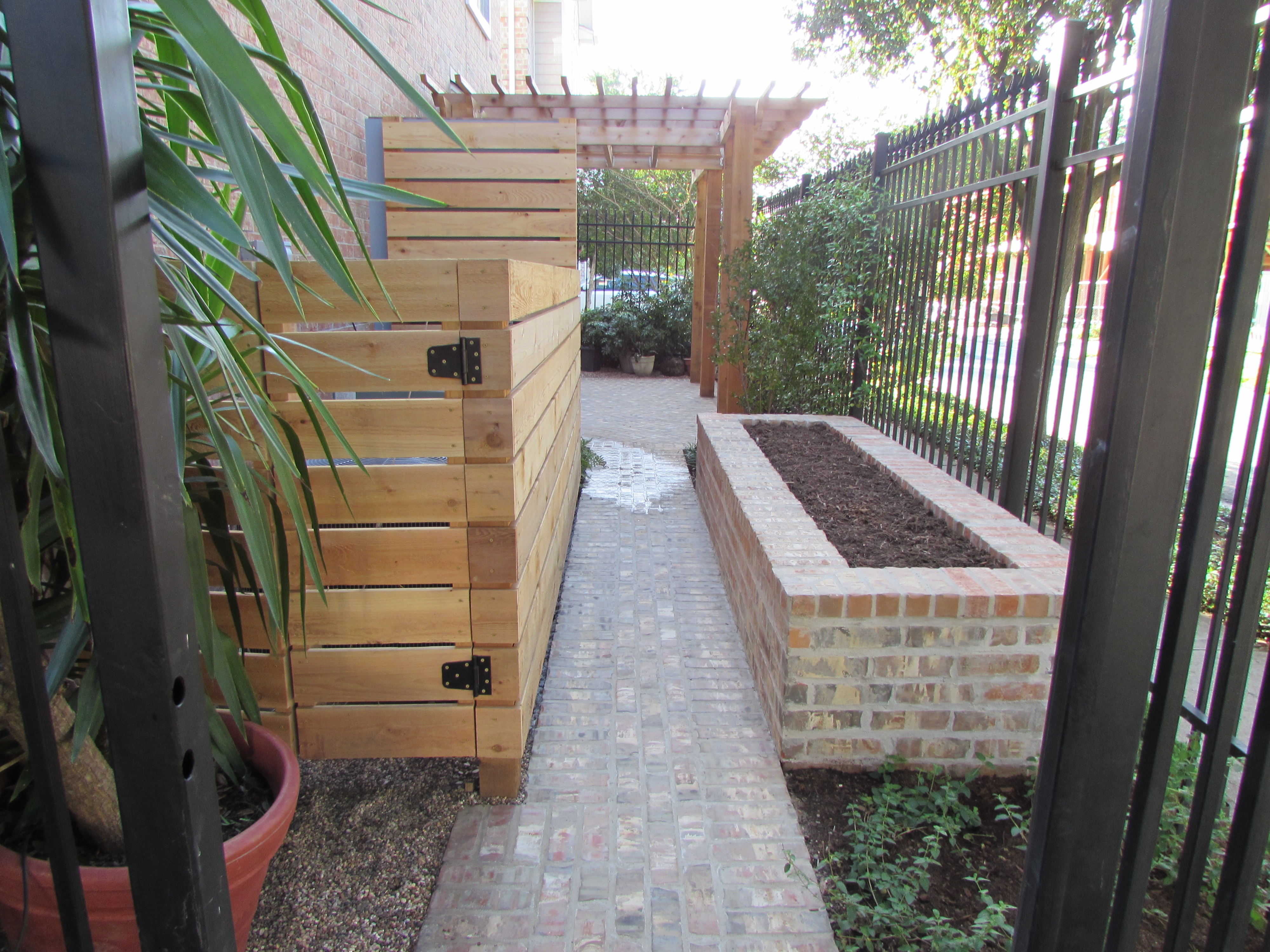 Now we enter through the gates. The space has nice clean lines and the raised bed is about 16 inches high, wide enough to sit on and plant or weed. The a/c units are contained and the back of the mirrored screen matches the a/c screen to give continuity.