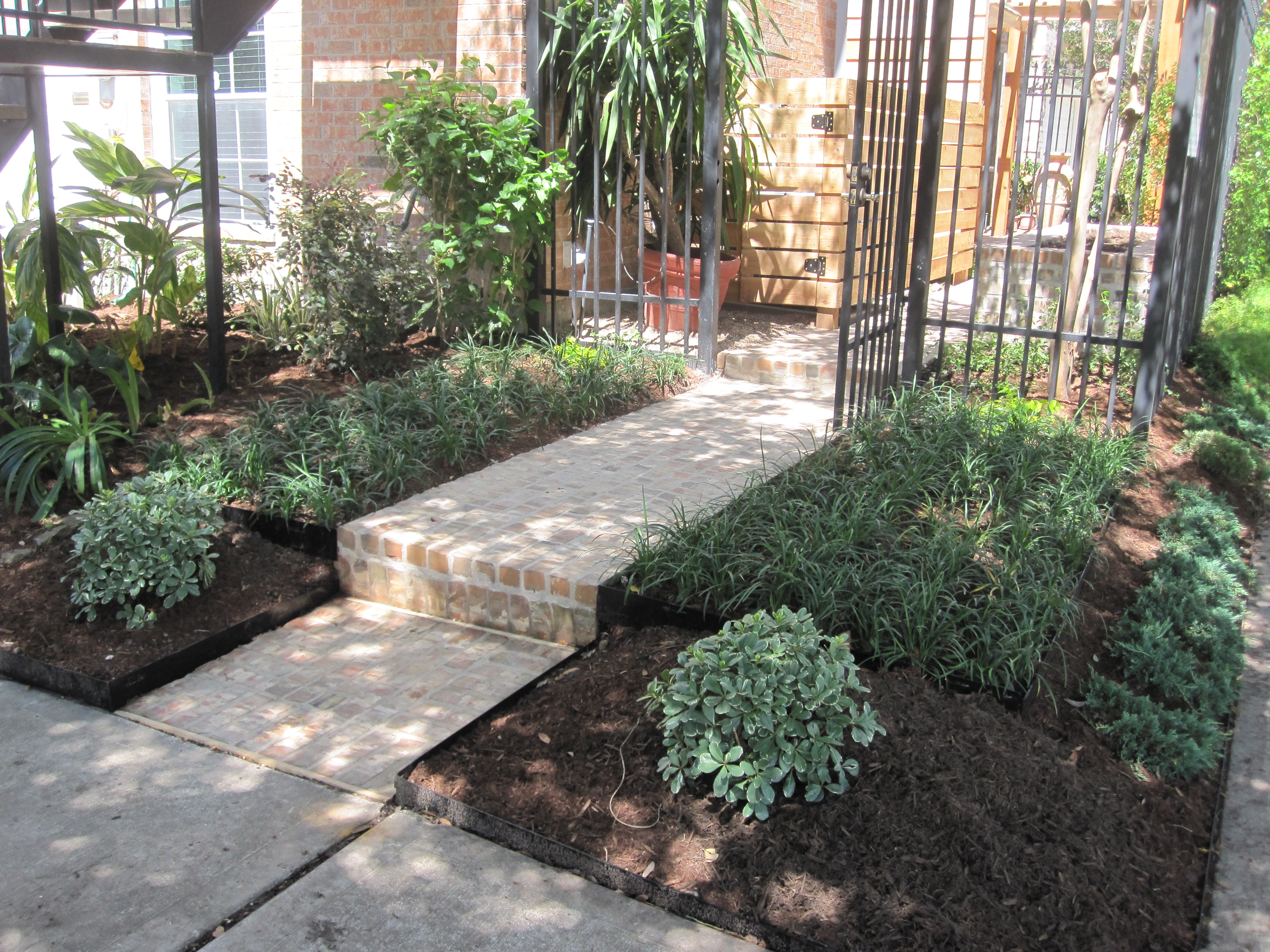 Dwarf pittosporum flank the walk and their variegated leaves add a bit of interest in a shady space. We came back after this photo and added dwarf mondo grass around the pittosporum.