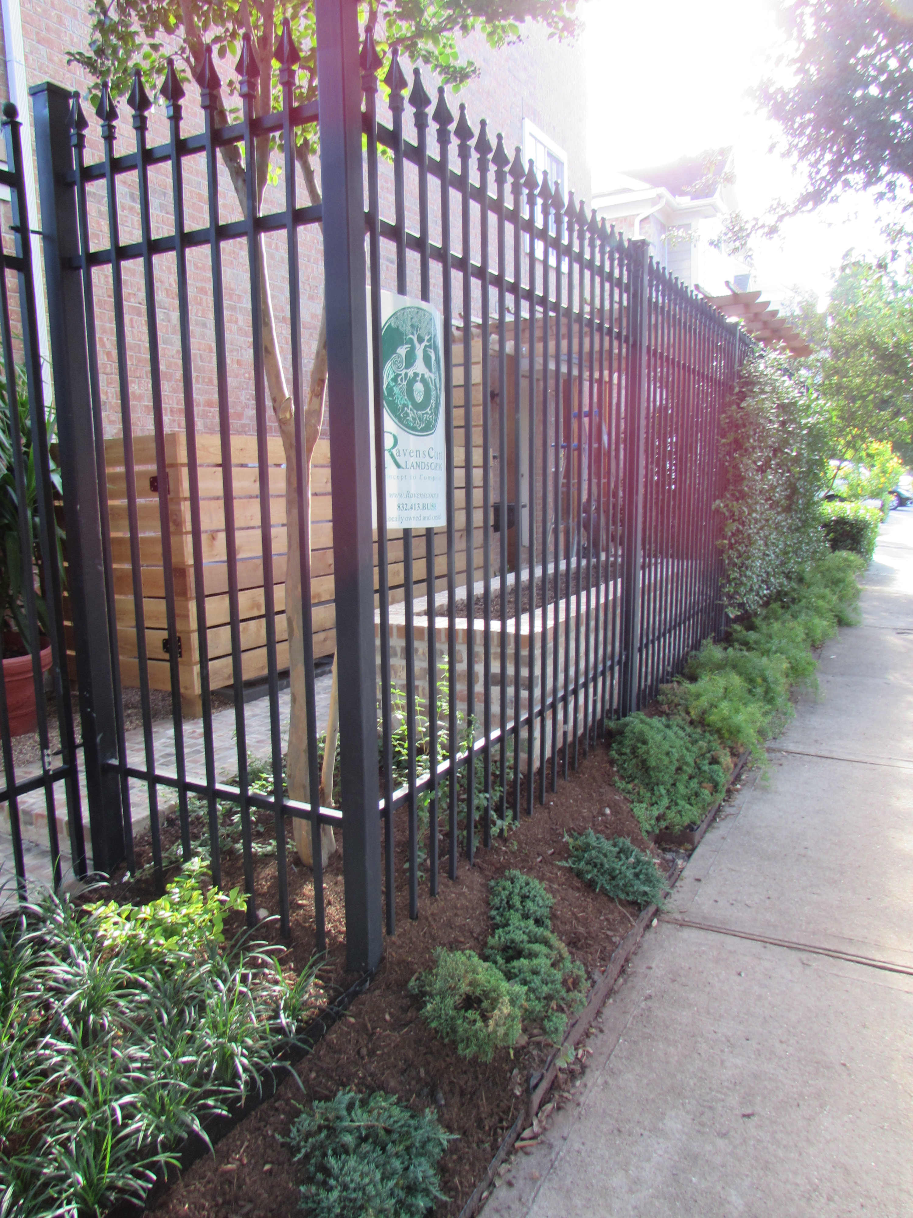 View through the fence. We left the existing crape myrtle in the corner and under-planted it with low maintenance white trailing lantana.