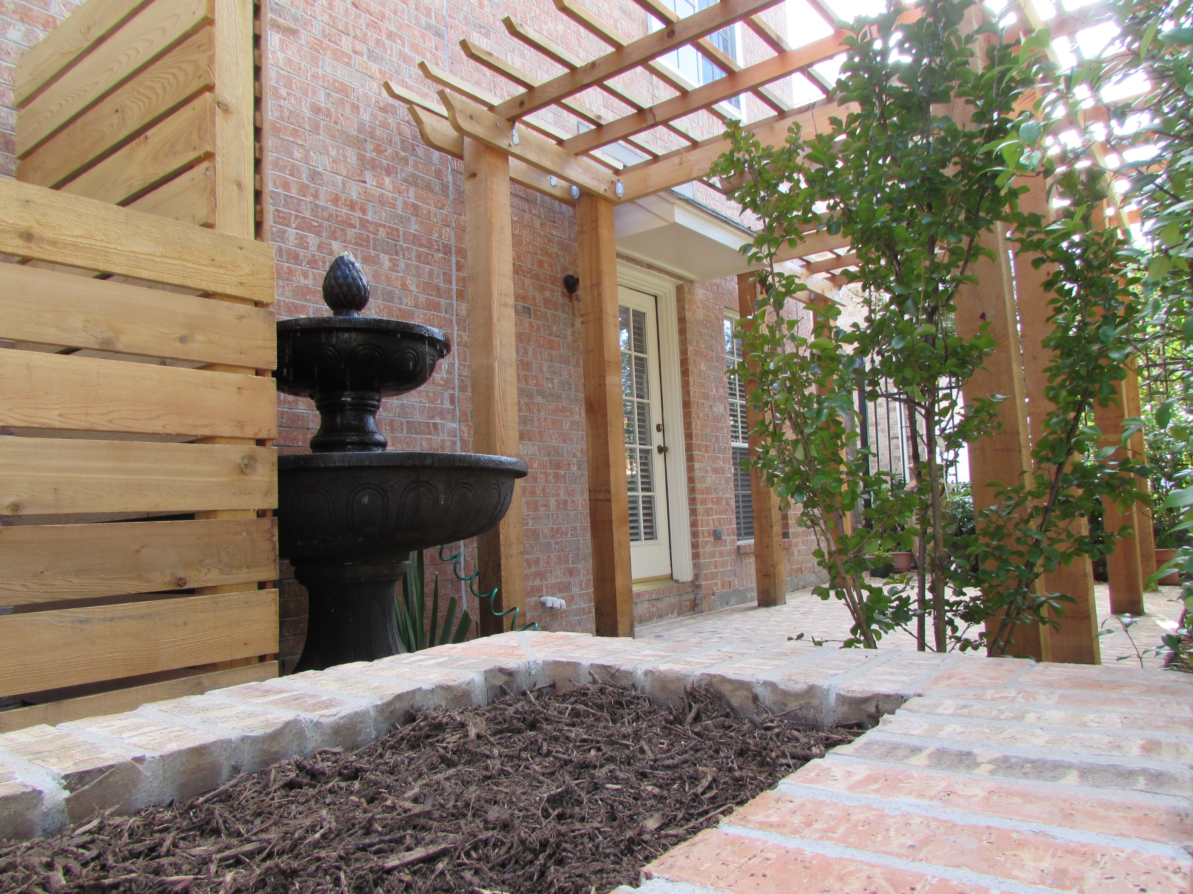 Right now the cedar is bright and reddish but in time it will fade to a subtle gray. That will blend nicely with the bricks. We planted fig ivy behind the fountain that will grow up the wall and soften the space even more. Right behind the raised bed is a small dynamite red crape myrtle, that grows to 15 feet full grown. It will add more shade on that south west corner of the patio.
