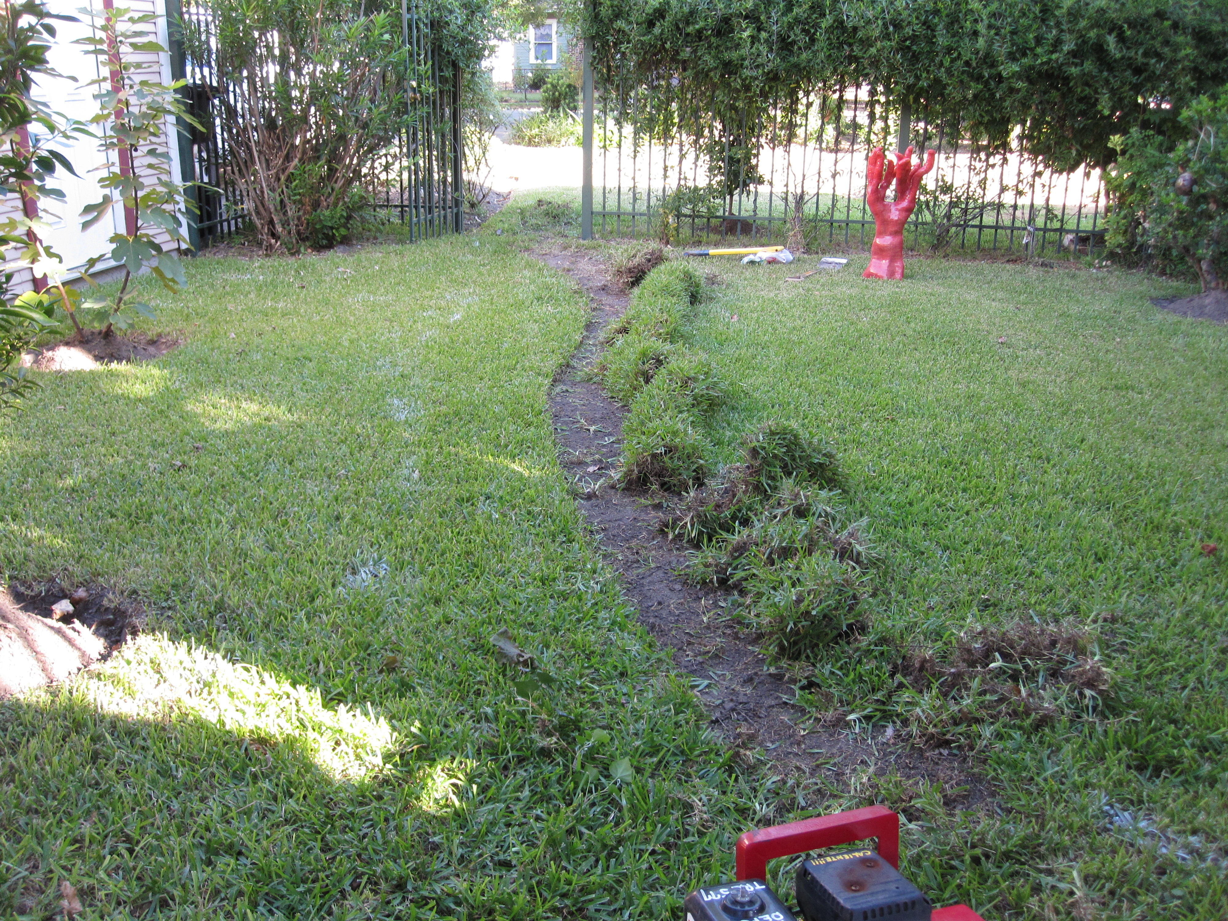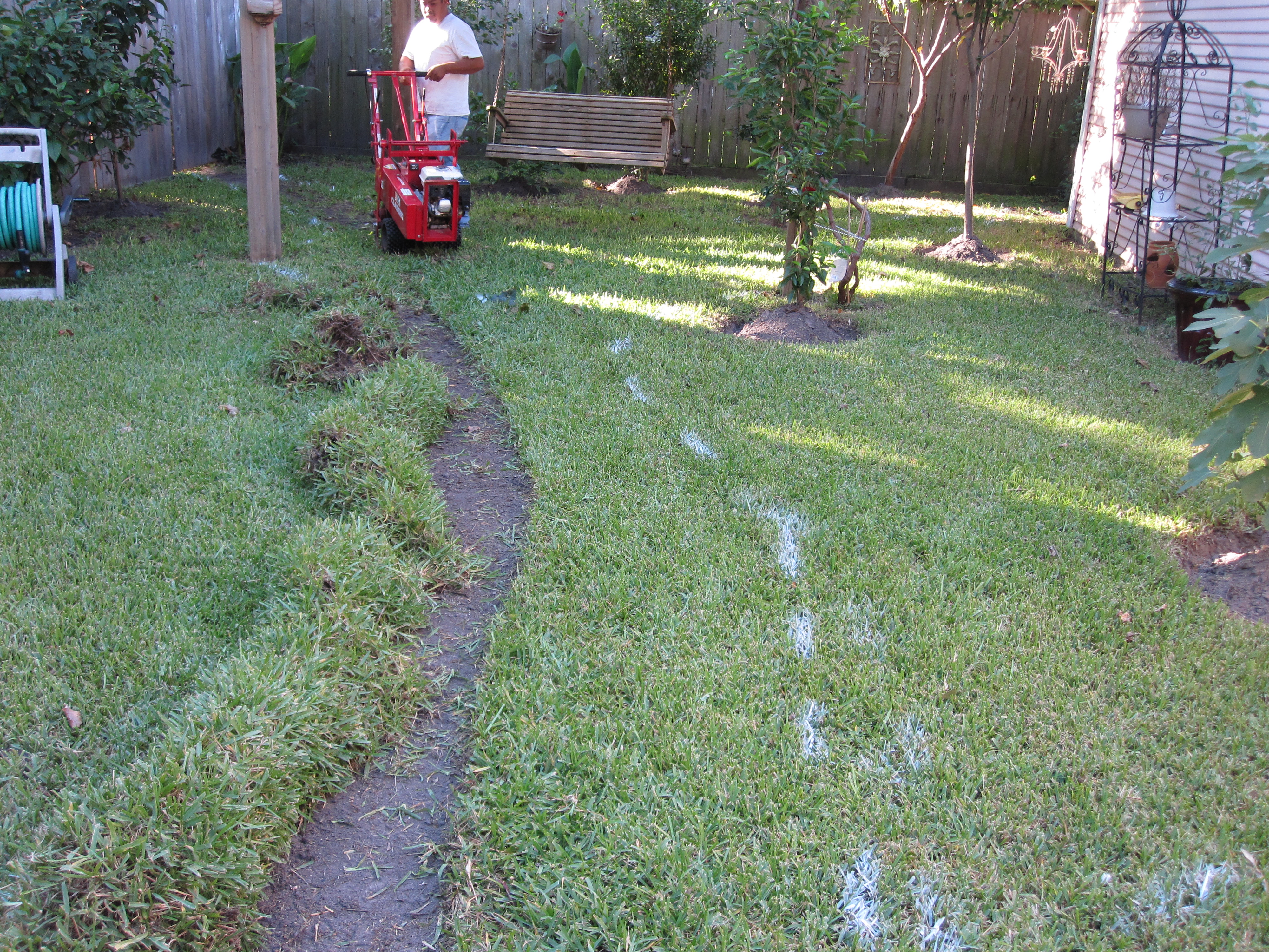 Our client had plenty of green space, but found the use of it awkward. This bed bisected their usable space and walking through the lawn left their shoes sodden. We first mark the space with spray paint. This notes the edge for us as well as allows the client to understand exactly what parameters we imagine. When stripping/removing great amounts of sod I highly recommend using a sod stripper. It will save your back and make sod-removal a much easier chore than removal by hand/shovel.