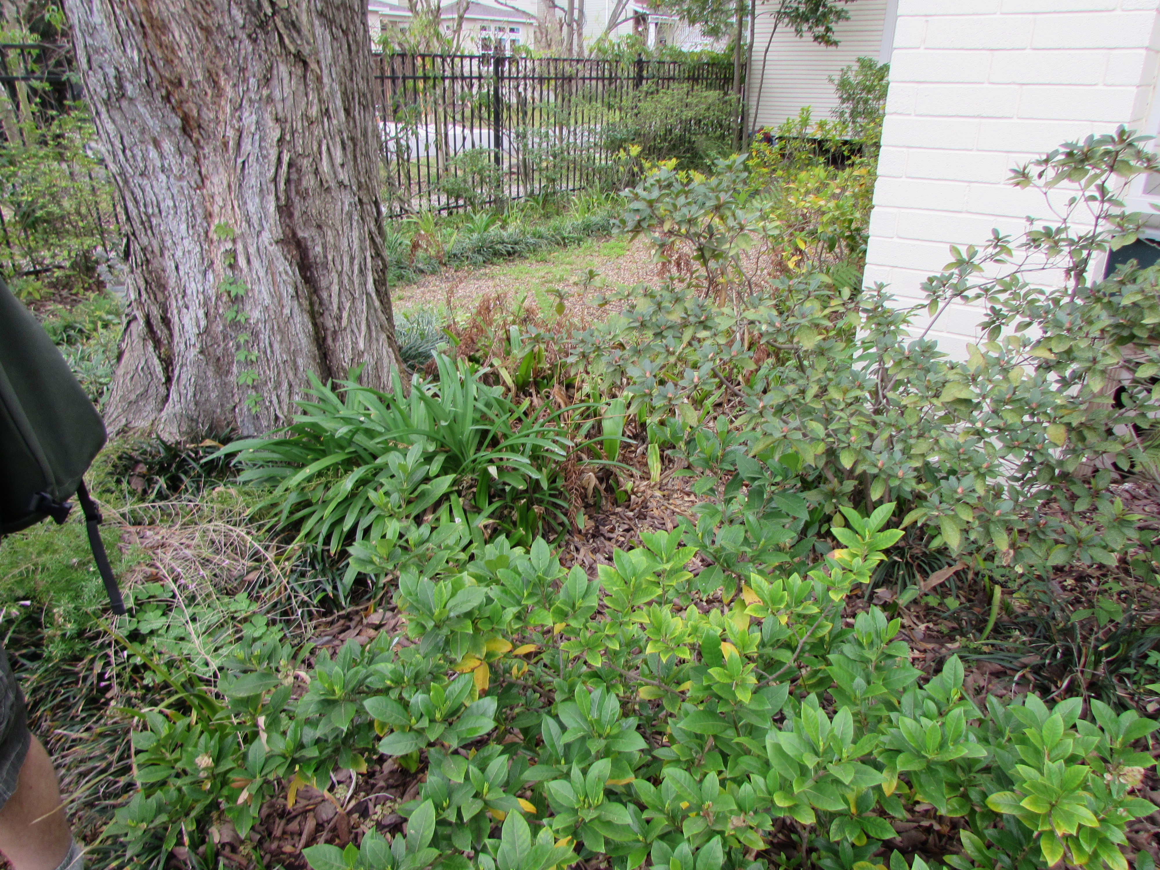 Below is another privacy screen. The neighbor’s garage looms over the back lawn area and the owners really don’t like looking at it. We planted Savannah hollies because they are very adaptable and don’t want to be overly wide even when they are 20 feet tall, plus take shaping very well.