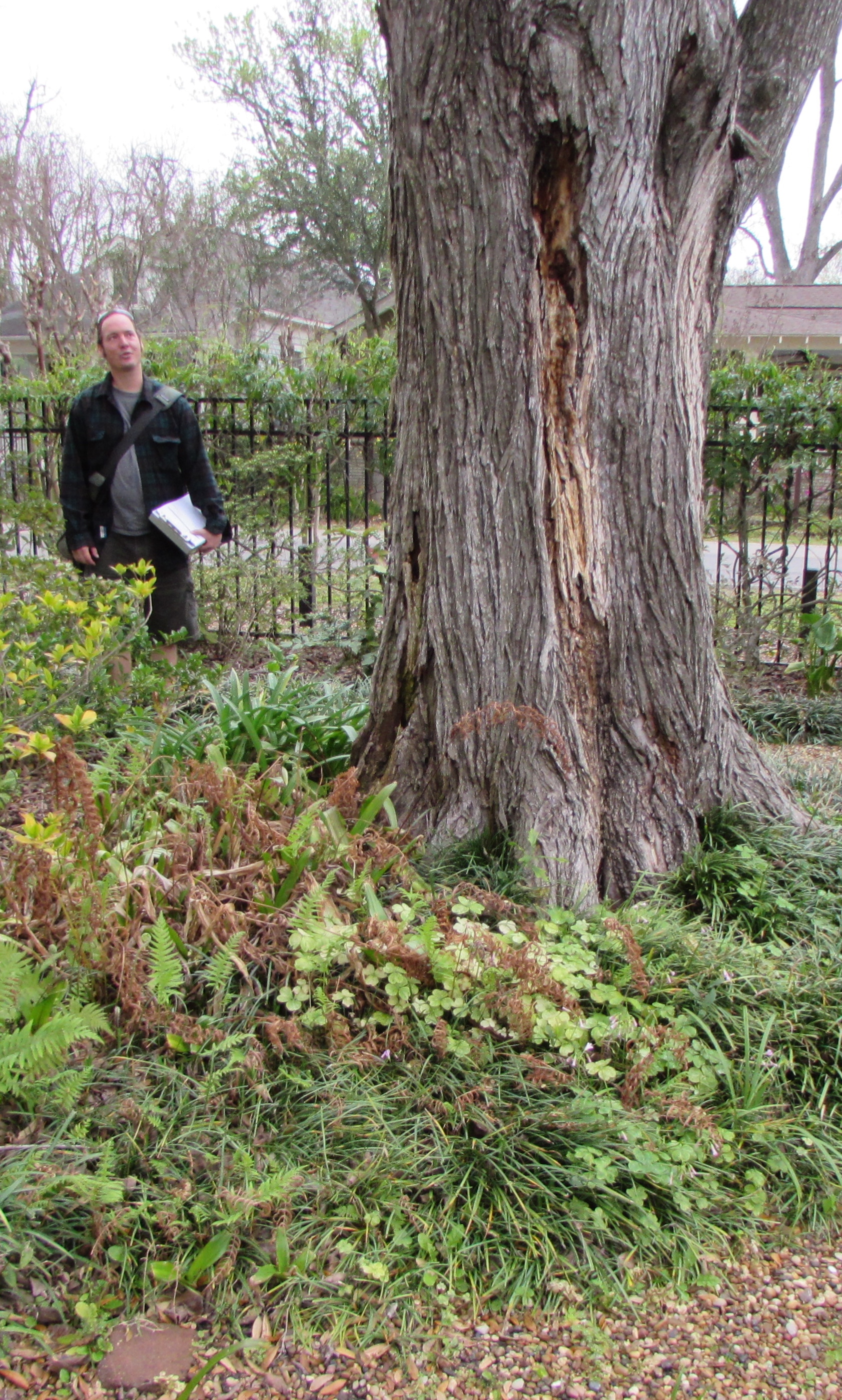 When we were first there we talked about the health of this old Pecan. In the end the arborist said it was too far gone to save. This opened up the space to more light and possibilities. The owners were a bit overwhelmed with all the changes so for now we moved the big Sego that was behind the carport to where the tree used to be and dressed up the bed with annuals.