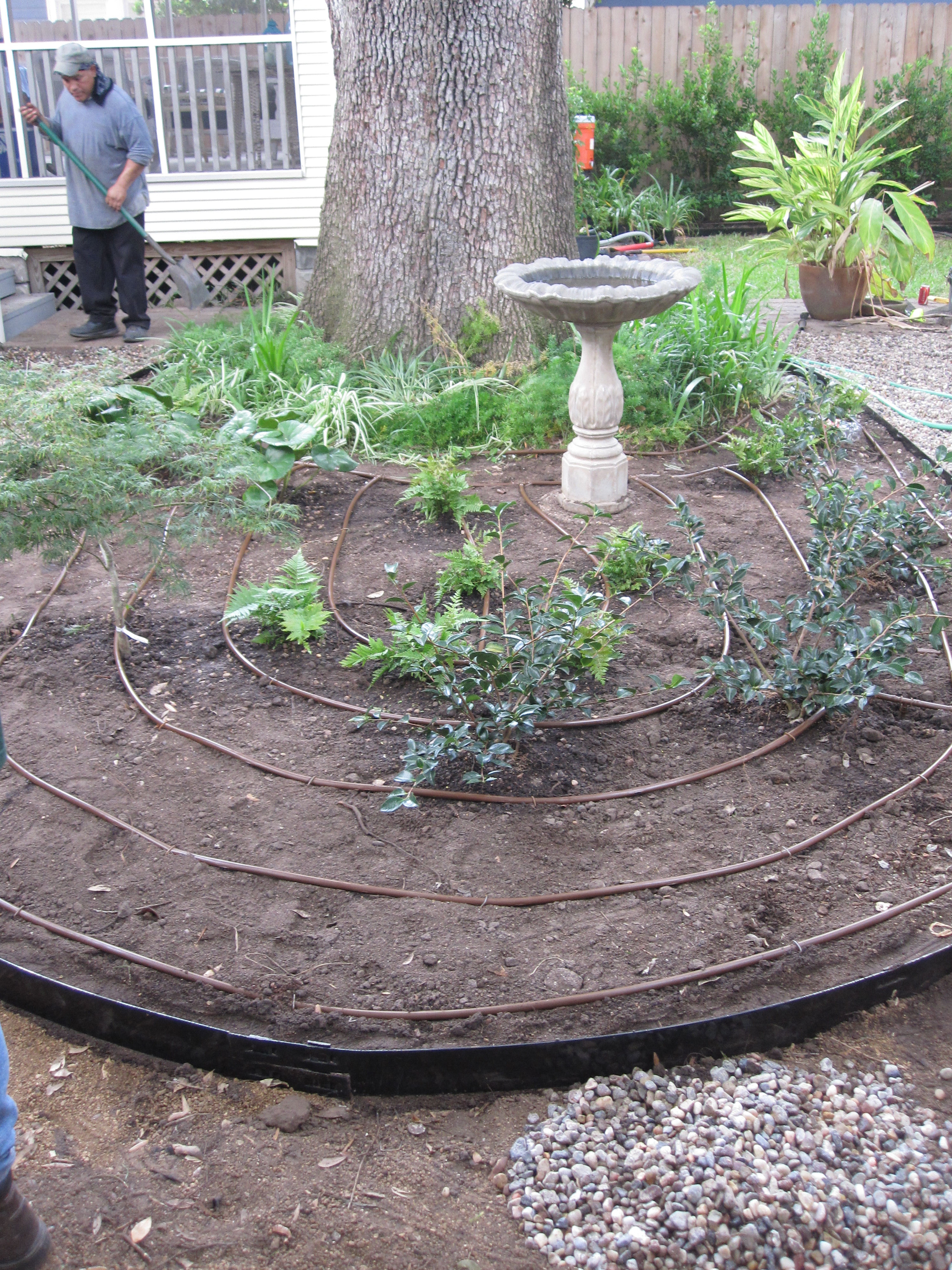 Redefining the beds. Notice the dark line running through the bed. This is the water line to the garage apartment. We were sure to avoid disturbing this pipe!