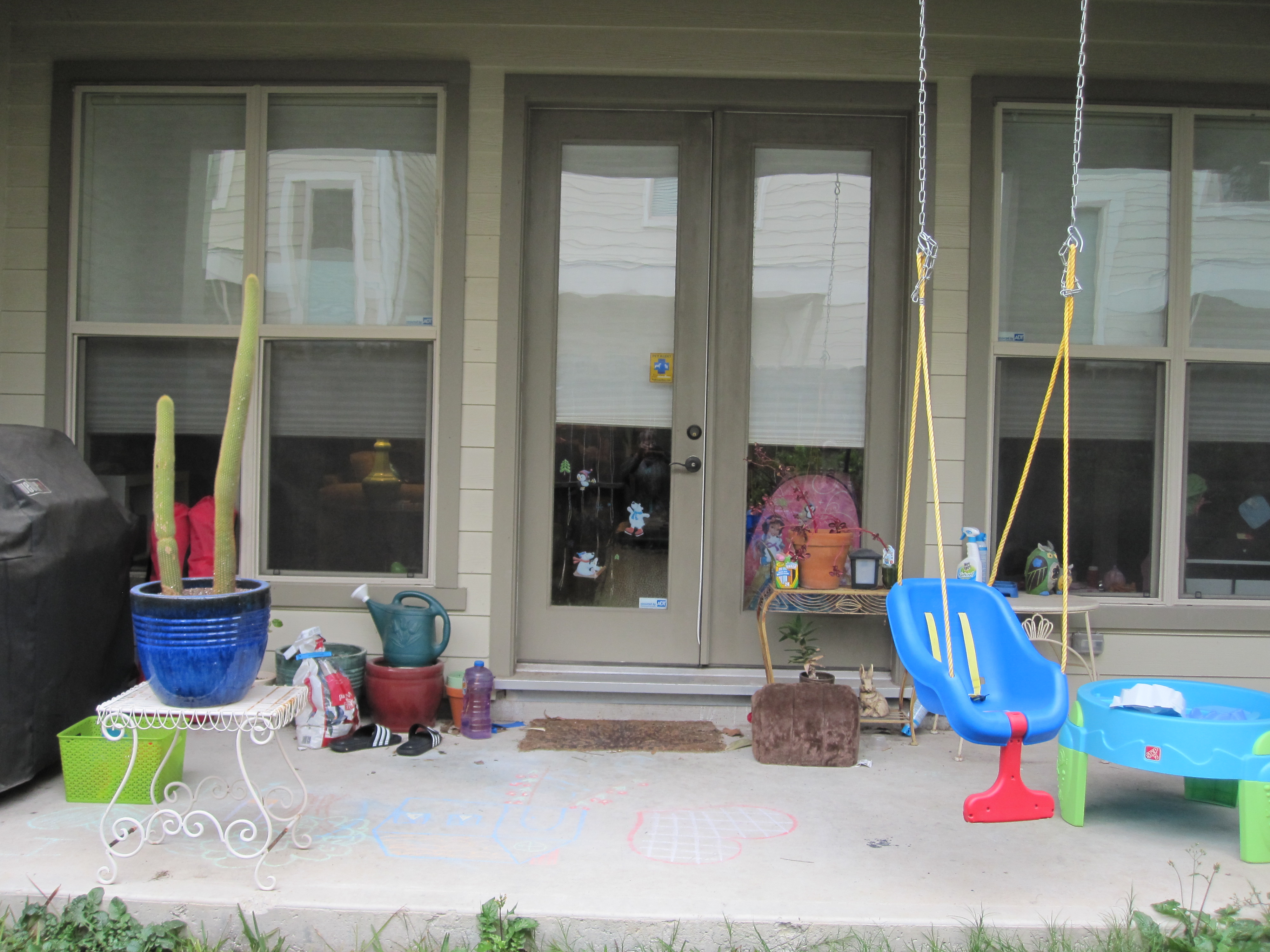 Nowadays, as land has become more scarce in the Heights, we see two houses build on a lot that use to have one. This means less yard for kids and adults to enjoy. It also means less to take care of. Wanting the best of both worlds we needed to come up with a design that maximizes the space for this busy family with a young child. They wanted to have a place to sit, cook outdoors and also lots of room for their young daughter to play.  Low maintenance was equally important. The small cement patio off the house was narrow and not enough for adults and children alike. We worked together and got to a design which added two more usable surfaces. A cement patio off to the side and a half circle artificial turf patio off the front of the existing patio.