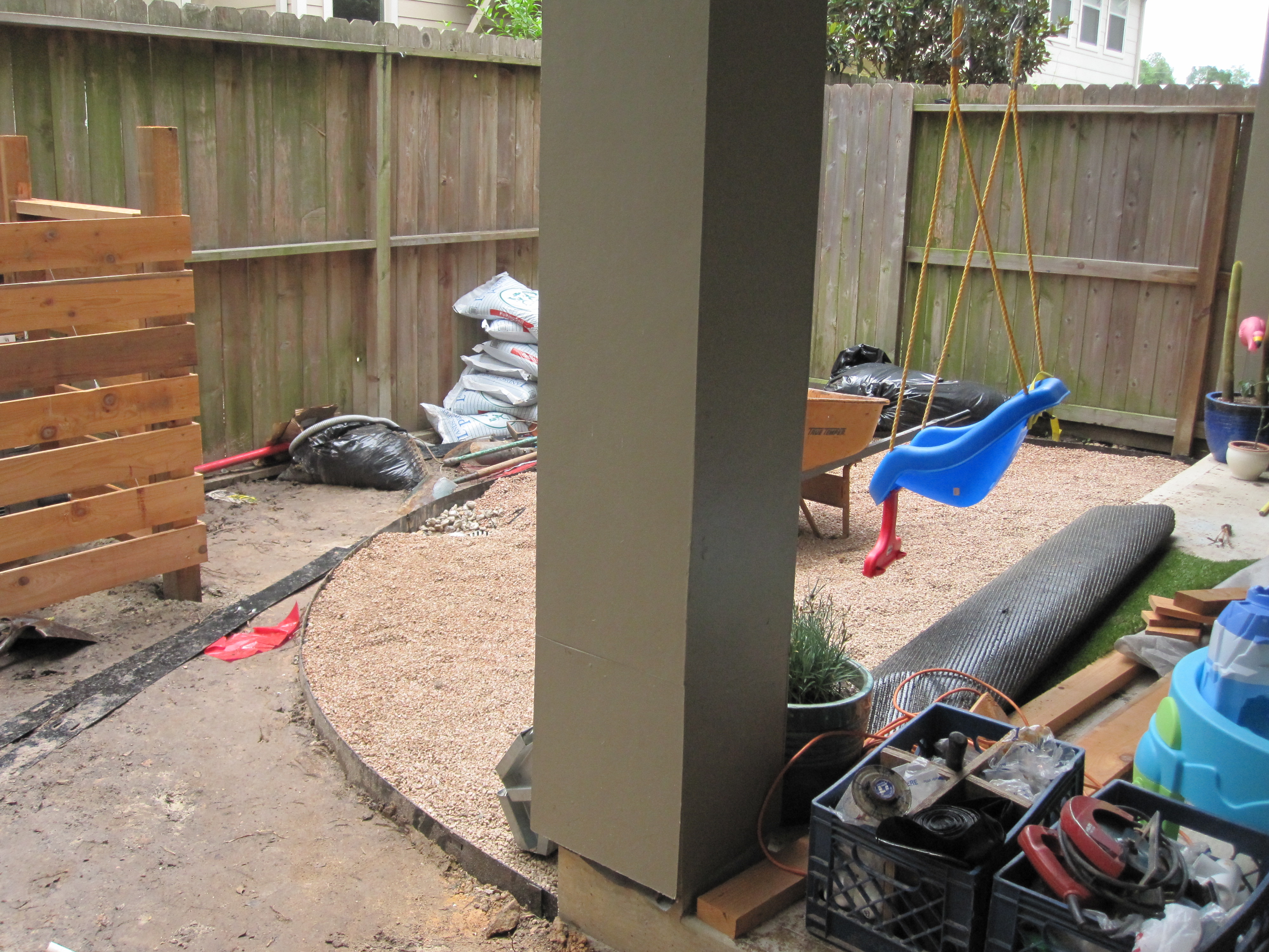 We edged the area in artificial turf. You see the small gate in the top of the photo? That was our only means for bringing all of our supplies in and out of this project.