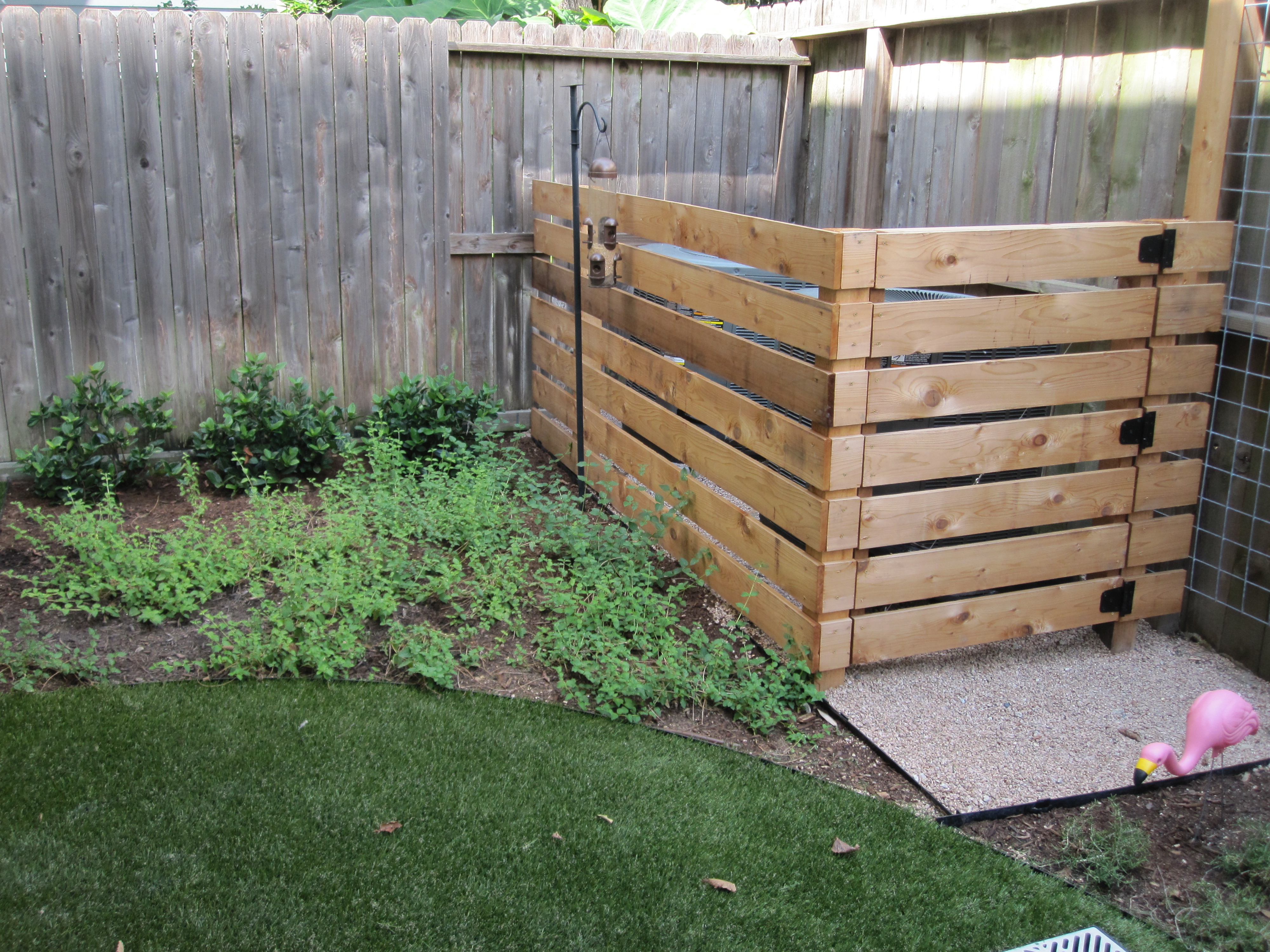 We like to mask the units while keeping them accessible for maintenance. Remember, if you dig around A/C units first find where their pipes are located. Digging a post-hole in the middle of a copper line gets expensive quickly.