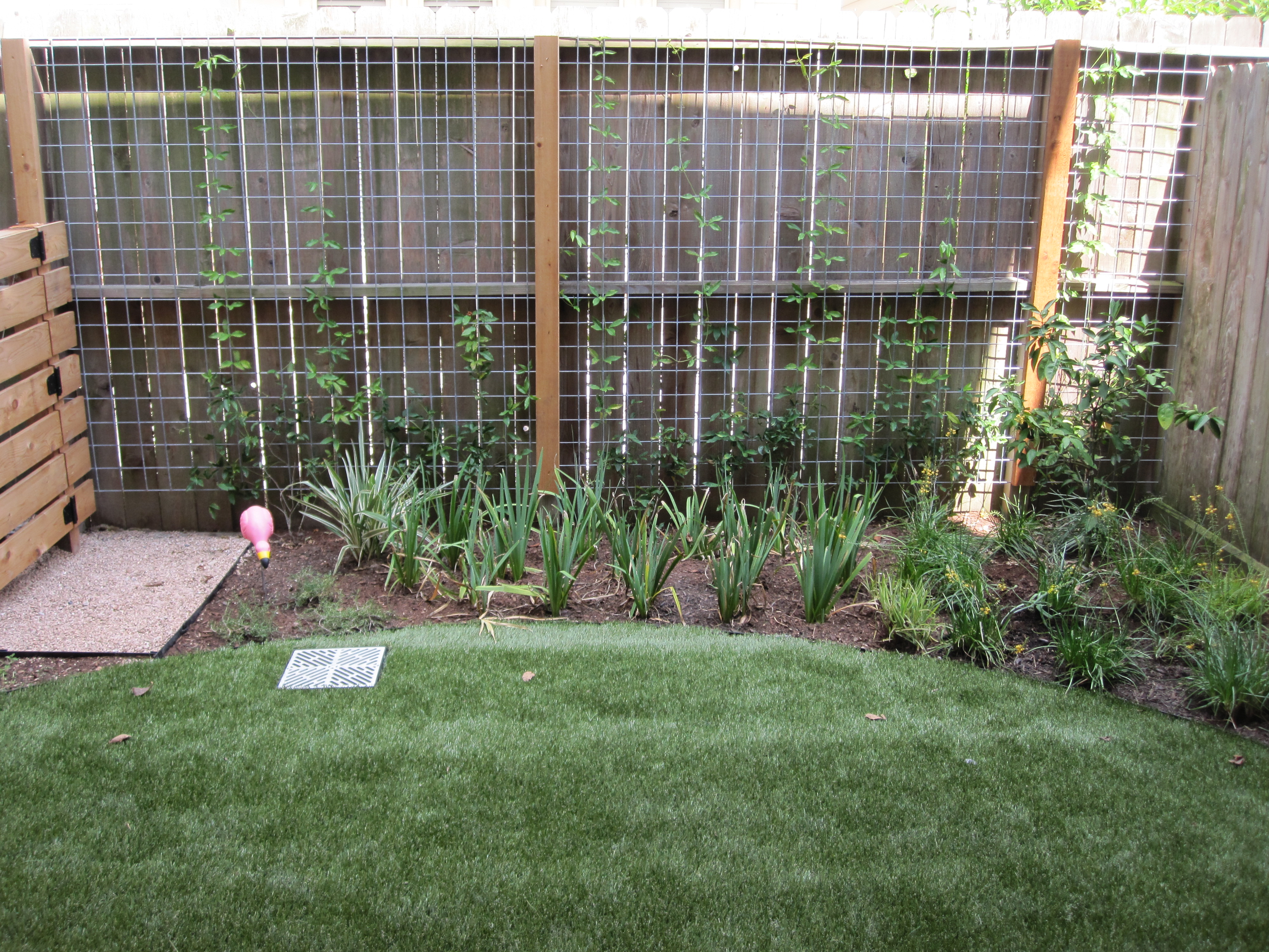 Welded wire on fence to help create a green wall. The artificial turf patio is a smooth transition from their concrete patio.