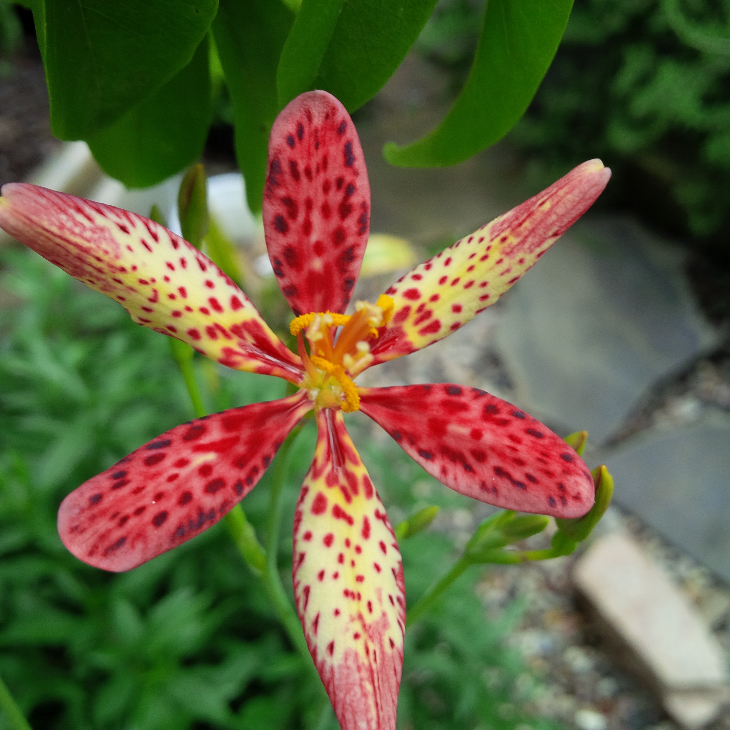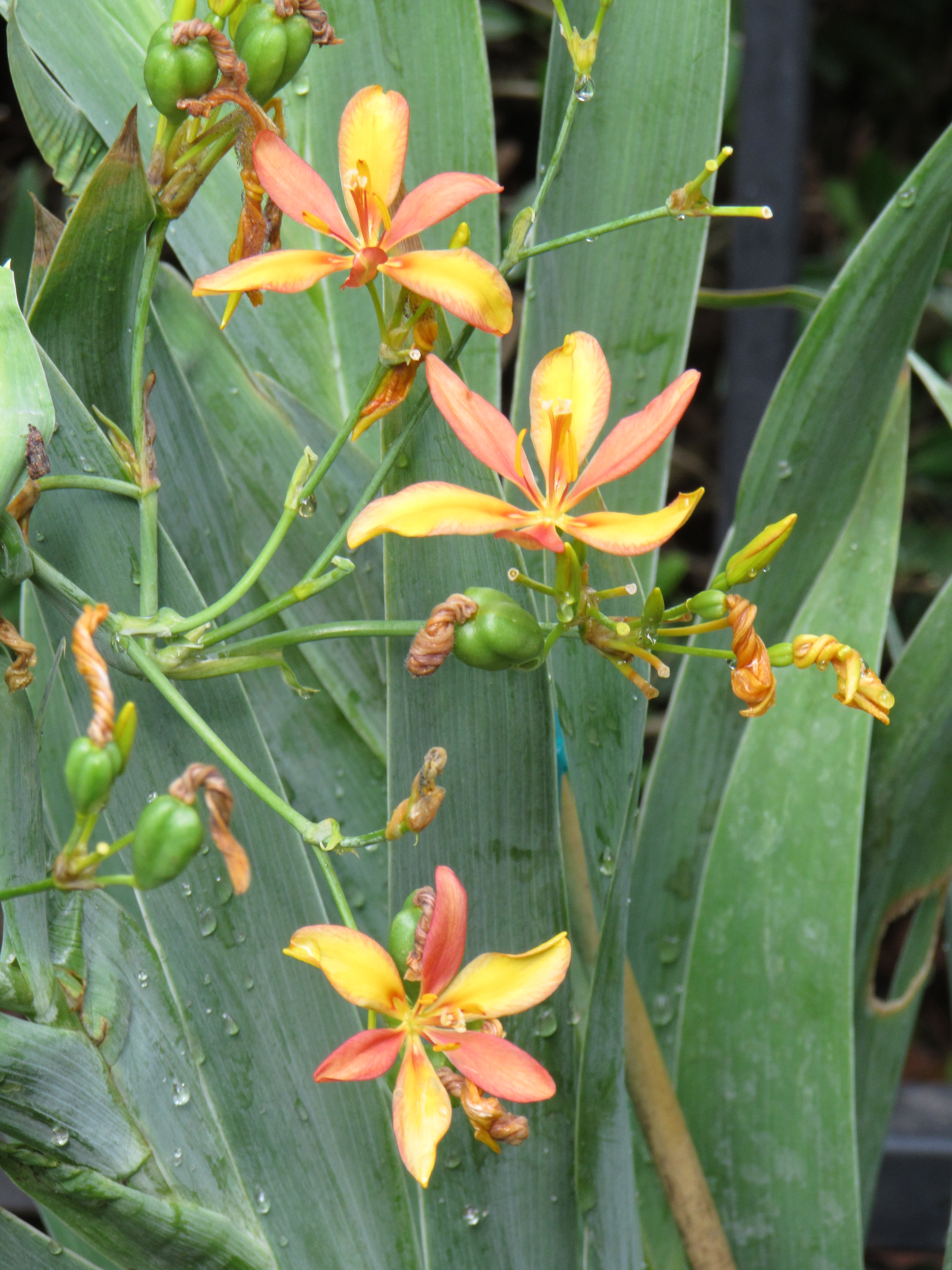 Formerly knows as Belamcanda chinensis but renamed based on molecular DNA sequence evidence. Belamcanda chinensis, the sole species in the genus Belamcanda, was transferred to the genus Iris and renamed Iris domestica in 2005.