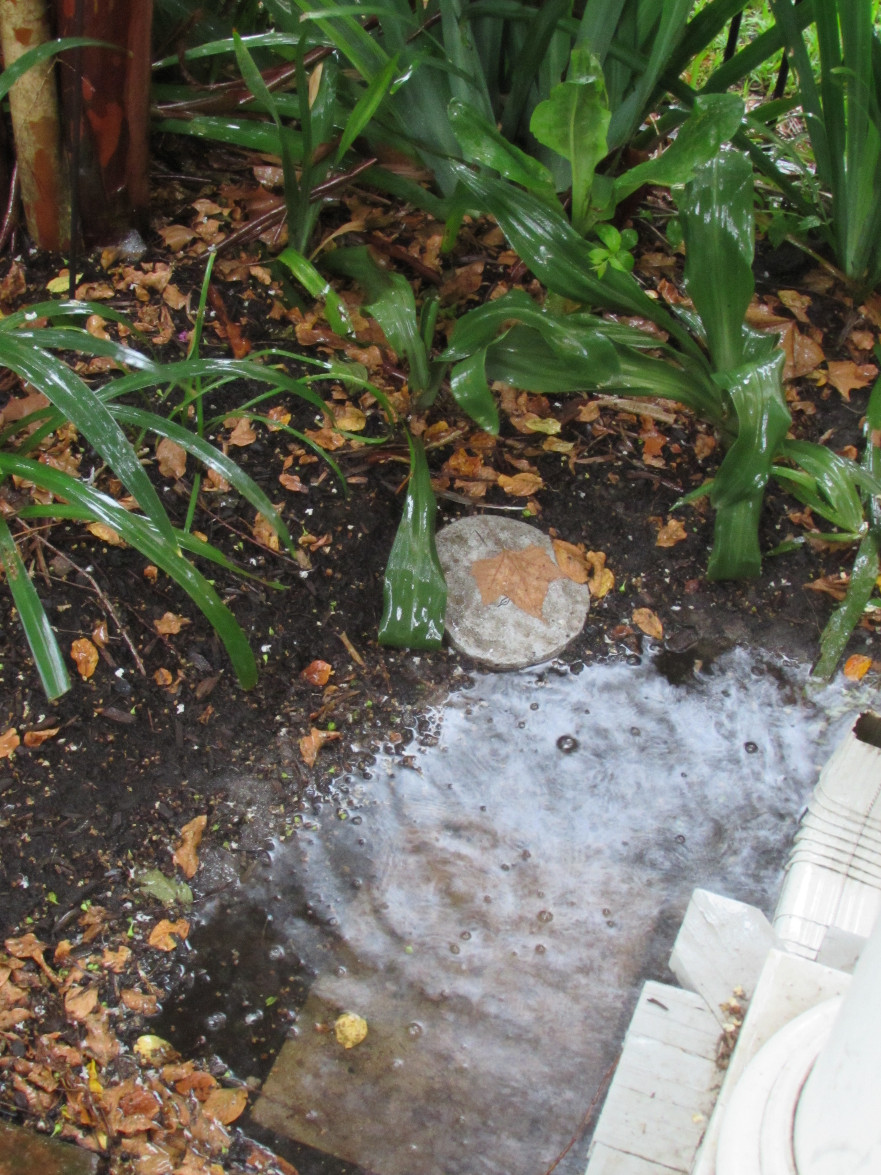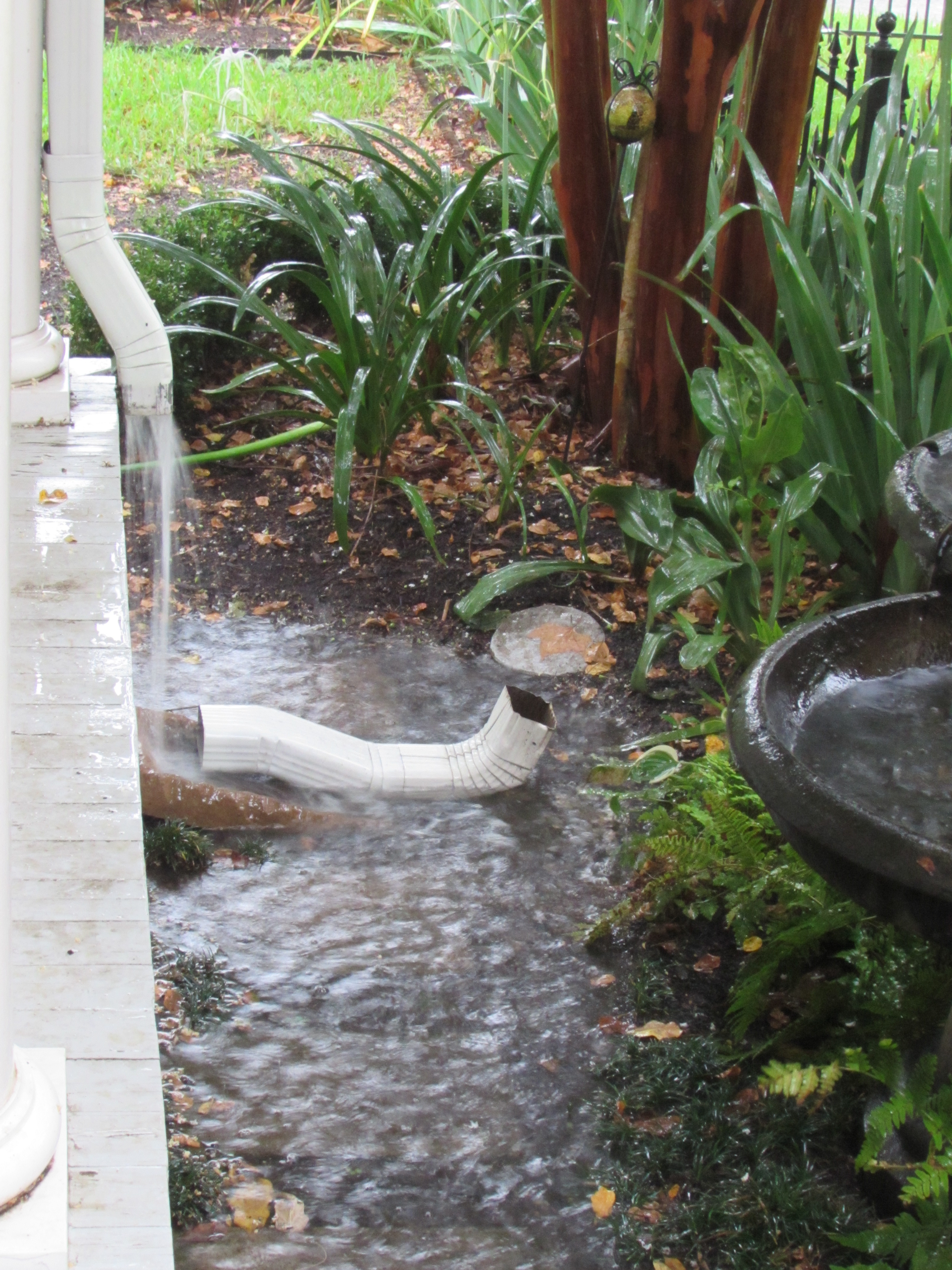 I see it rained so hard it knocked off the end of your gutter downspout! I know rainwater is good for plants but a friend told me about learning in a gardening class that it is even better when there is lightning, something about it increasing the ions or something. I love the pictures of the rain in your garden.