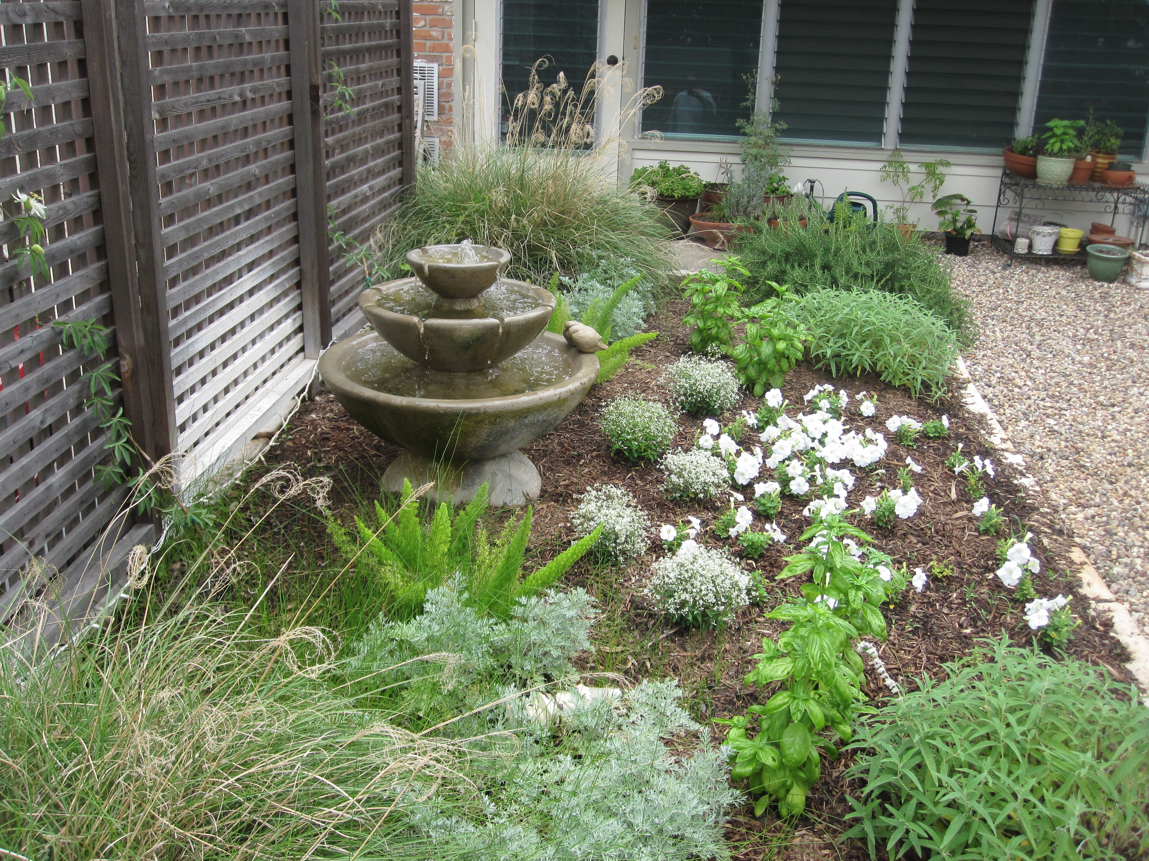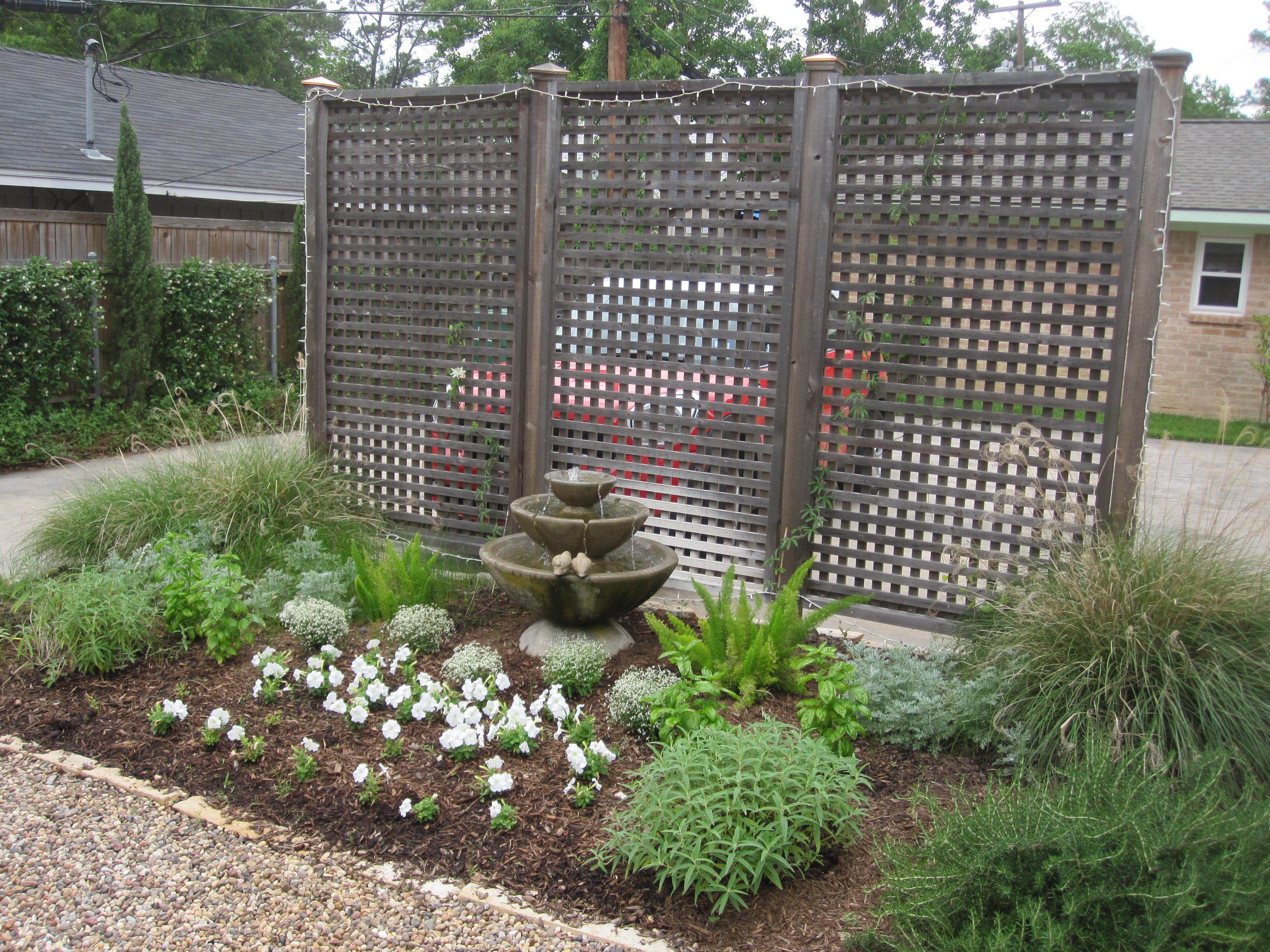 We designed a bed to fit into a curve that already existed in the cement driveway area. We installed a 3 panel cedar screen to obscure the view but still keep the openness of the space. The fountain makes a nice focal feature and helps you feel cooler in this hot space. We planted vines to grow up the screen and a mixture of herbs and butterfly attracting native plants.