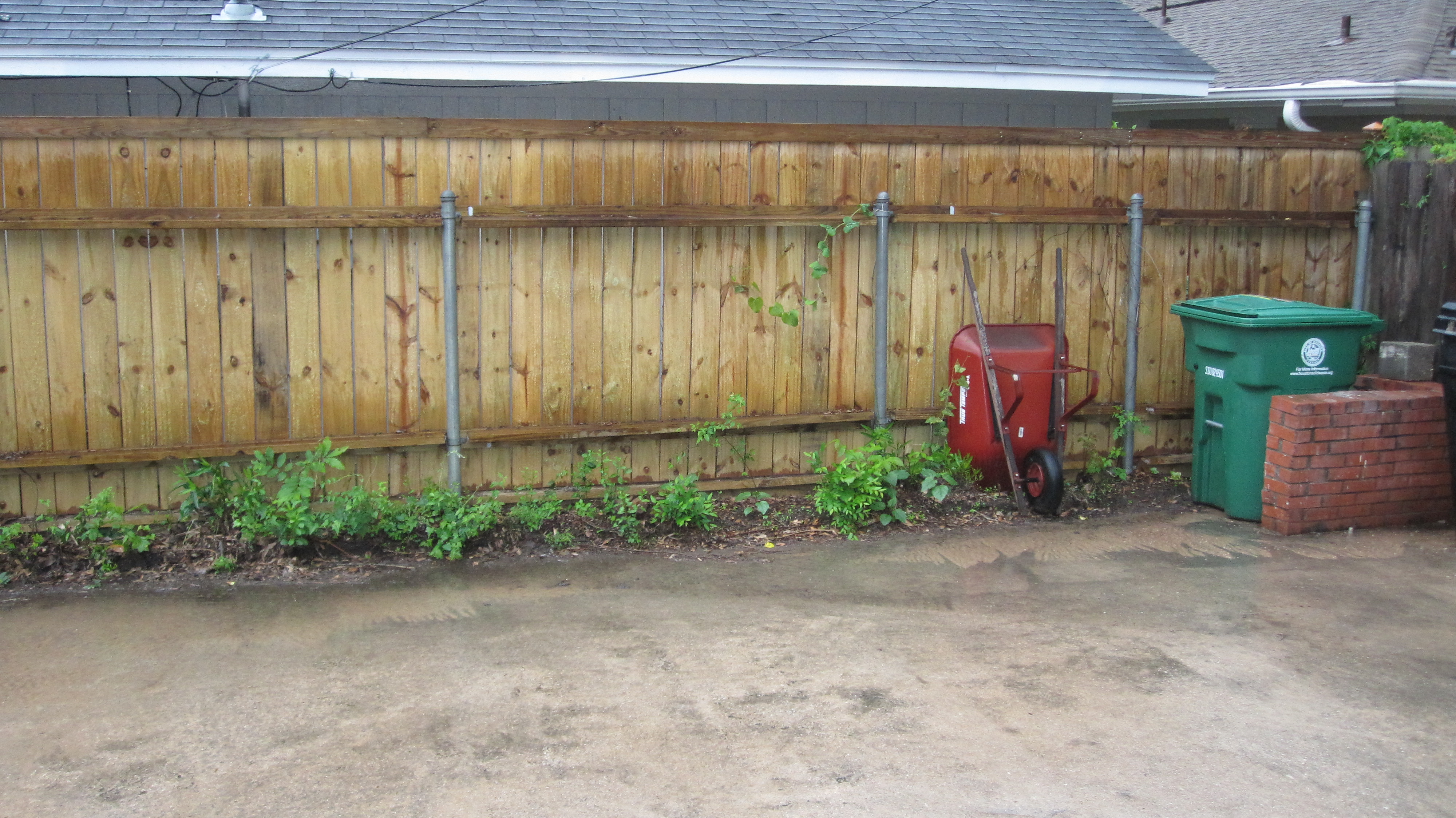 One of the challenges was the metal post that were left after the neighbors put up a new fence. Below is the driveway side of the yard. They wanted something to mask the fence but the challenge was the bed was only 18″ wide at its widest!