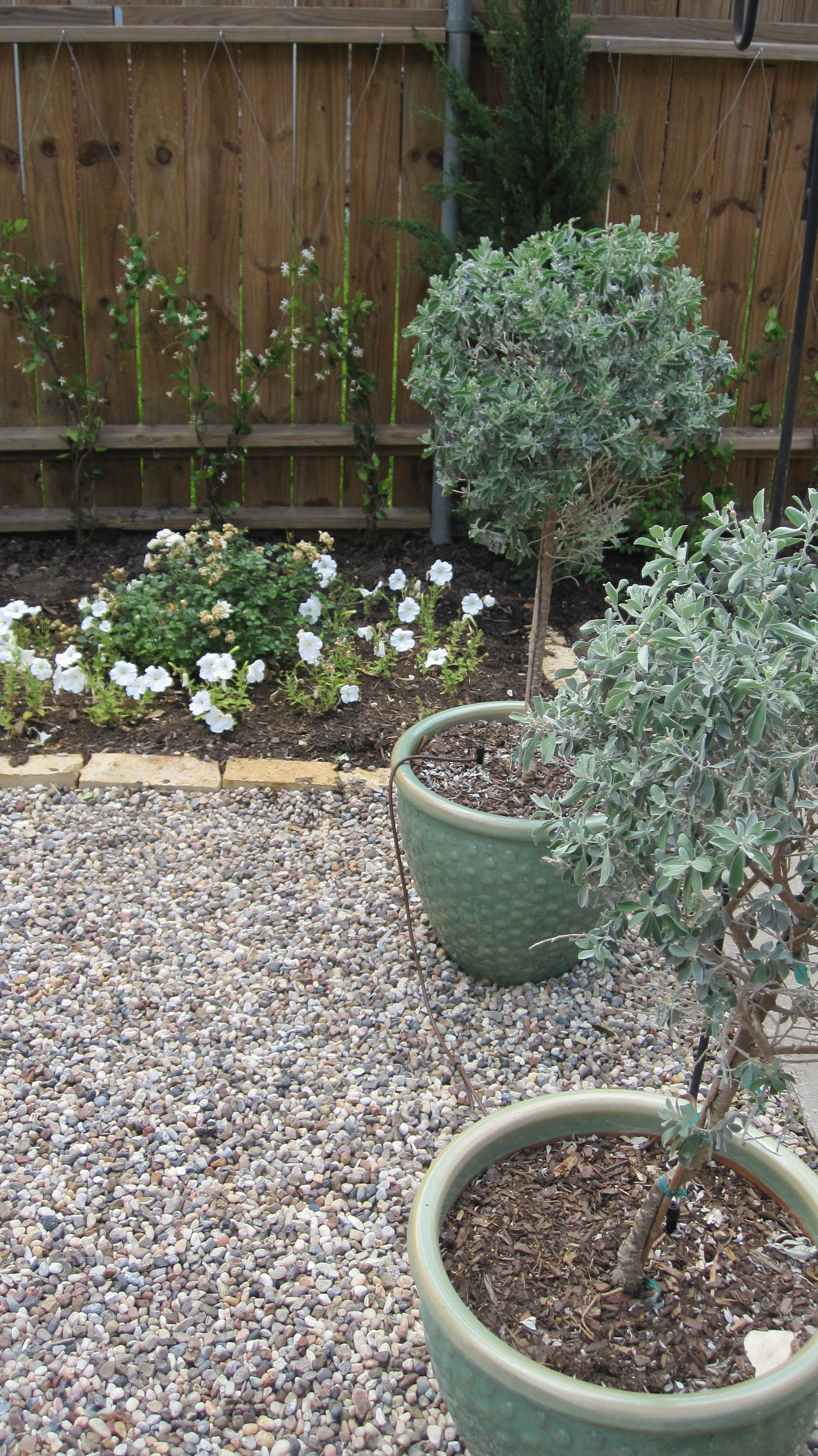 Transforming this backyard into an inviting garden was a bit of a challenge. The driveway took up half the space and the neighbor’s windows looked across the yard. The space felt hot with all the concrete and brick. The sun blazed down on it all day long. The owners desired a simple garden with charm in a soft southern style. We decided on a white garden which looks fresh and is lovely in the evening as the sun goes down. That is the most pleasant time to sit out there so it was a perfect choice. High on the list of needs was gain some privacy and more space to entertain. Additionally they wanted a place for herbs and some cut flowers. And they were on a tight budget!