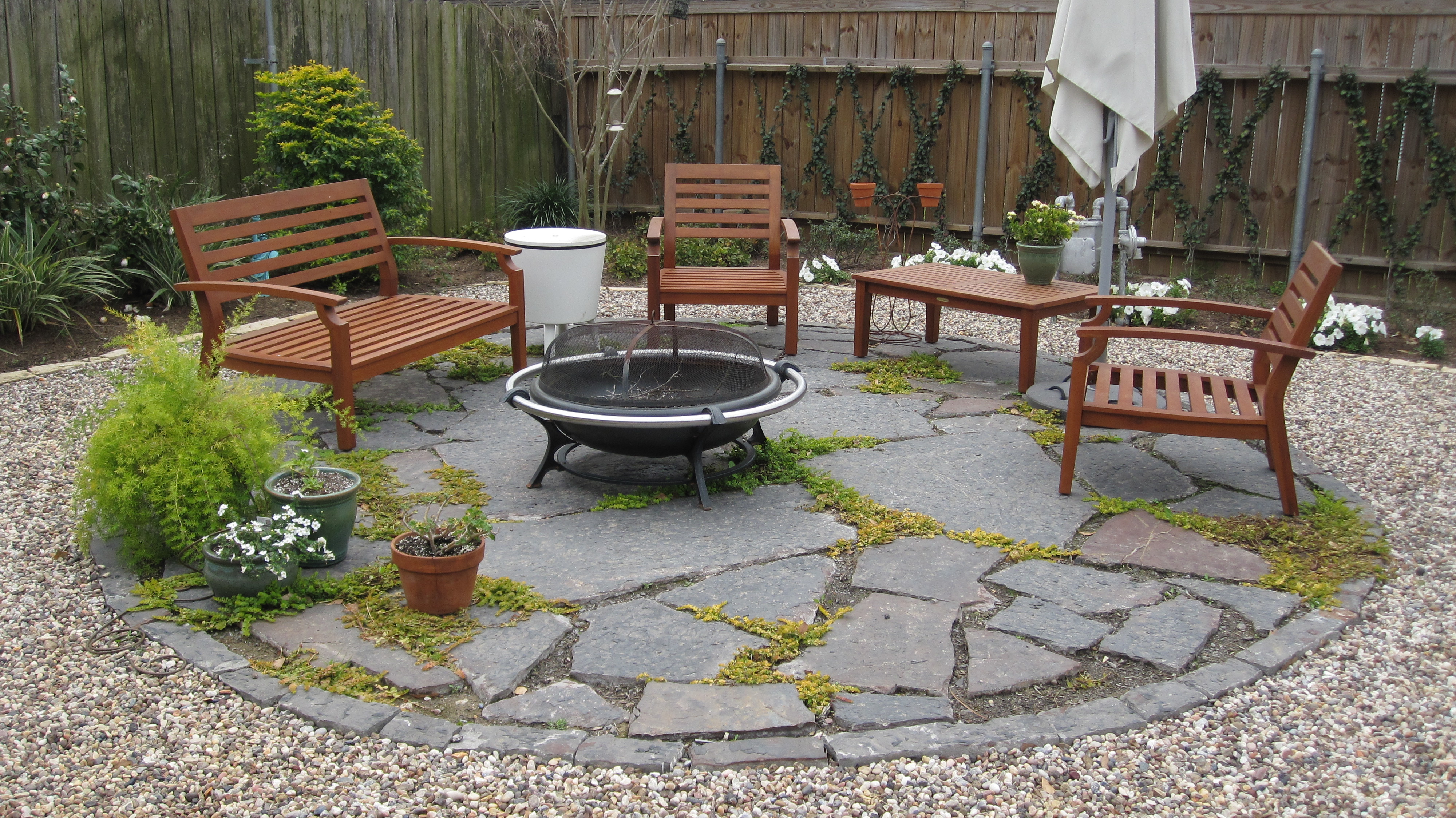 What a nice area it’s become, and I love the stone that was used for the seating area. It really became a well defined space with the circular edging. Love the screen too!