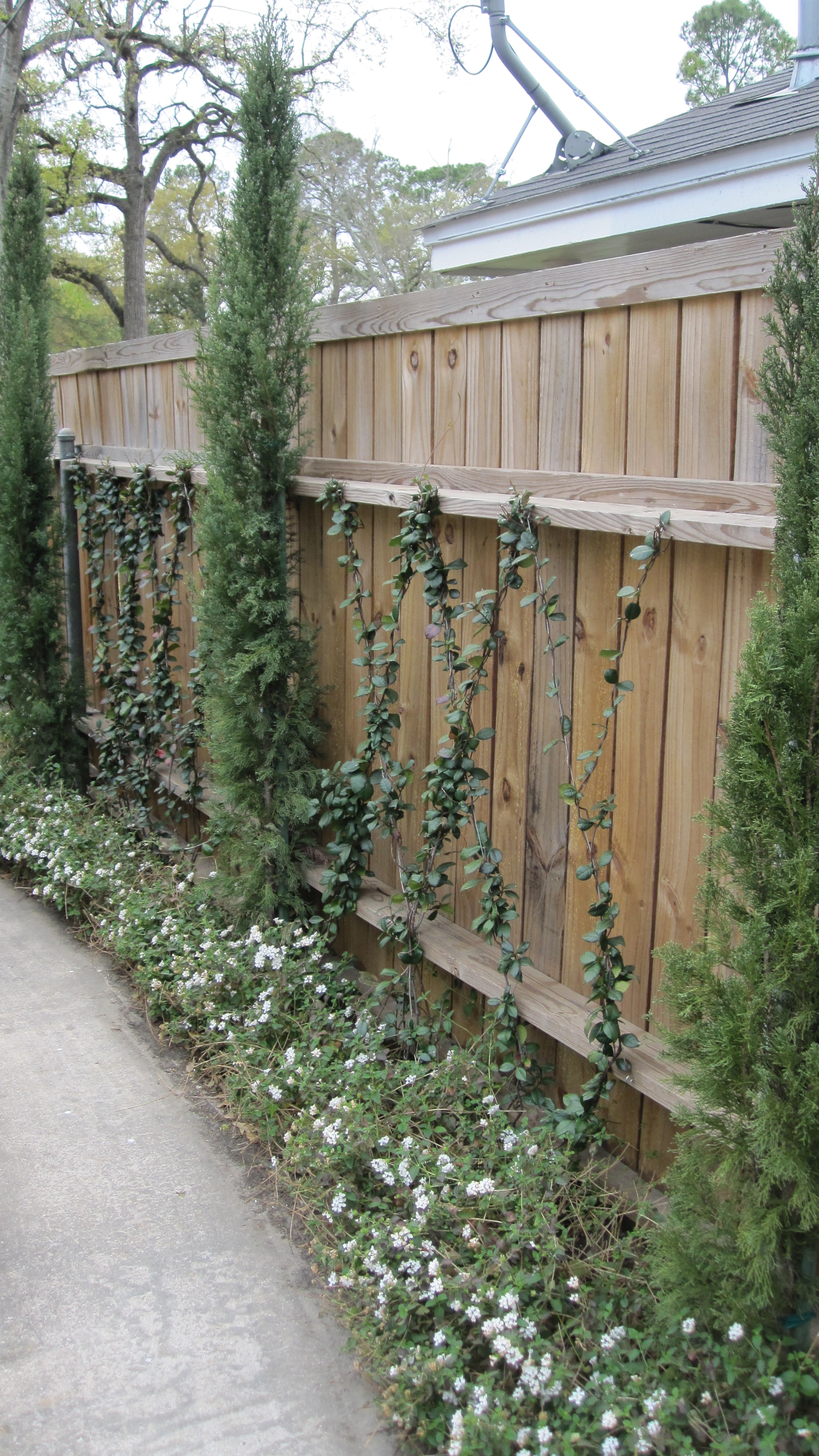 To keep with the white theme we used a Natchez crape myrtle in the southwest corner. It will take a few years but it will help shade the area from the late afternoon sun. Natchez crape myrtles are fast growers and one of the larger varieties of crape myrtles. I love the way their bark turns a cinnamon color in the spring and then peels to a smooth cream brown as it loses its leaves in the fall. If left to grow natural, and not over-pruned, it makes a nice umbrella shape with lovely long multi-trunks. I like to put string lights on mine for Christmas. It is a hybrid between the Japanese Crape Myrtle (Lagerstroemia faurei) and the common Crape Myrtle (Lagerstroemia indica). One of the first hybrids developed and released by the US National Arboretum in 1978. Natchez produces long lasting clusters of white flowers that last up to 100 days, longer than any other variety of crape myrtle. It wants to grow into a tall arching form up to 25 plus feet tall. The leaves become dark green by summer and then turn yellow and orange in the fall, especially if we have a cold snap. It is tolerant of many different kinds of soil and grows like a weed here in Houston.