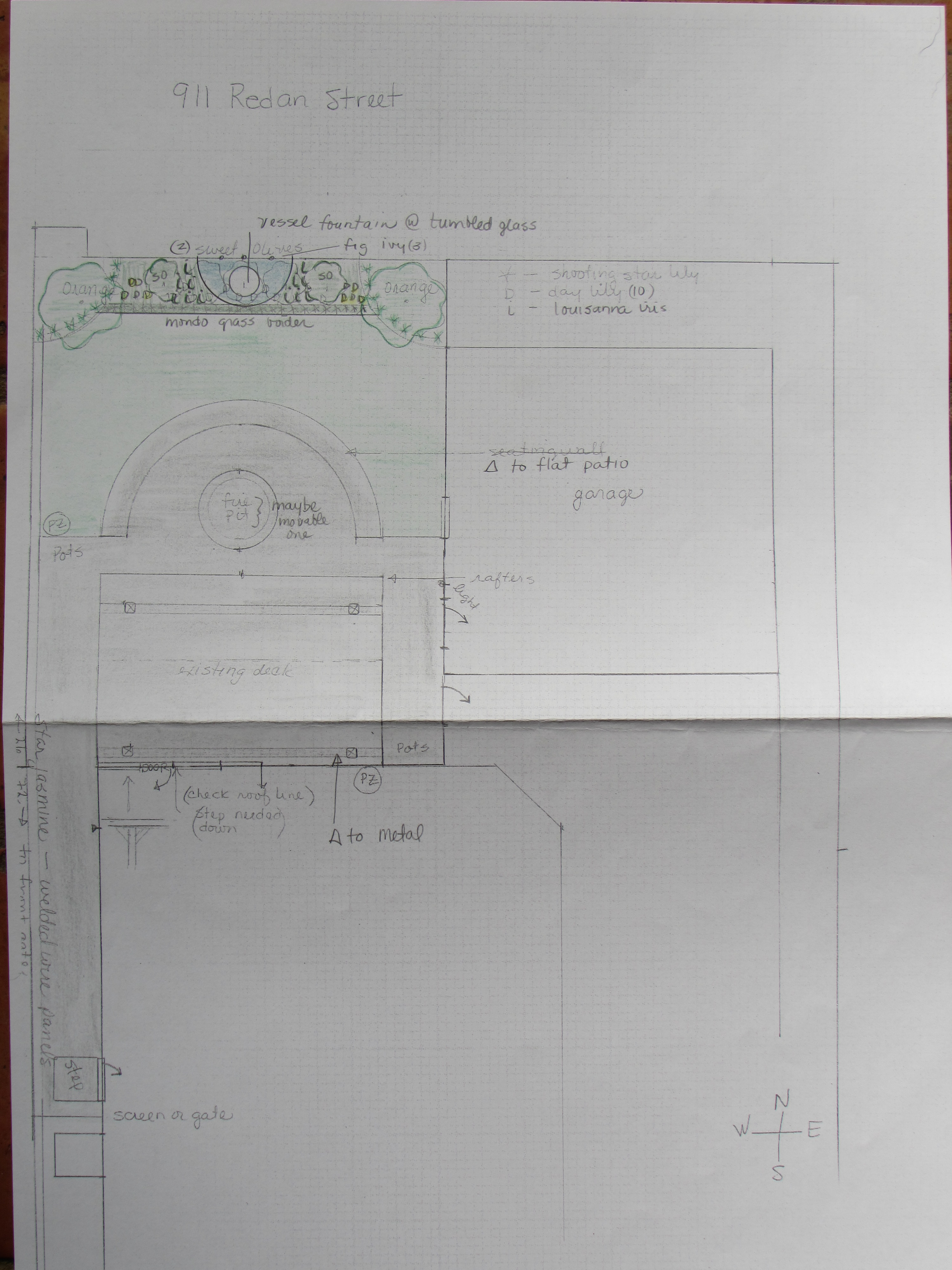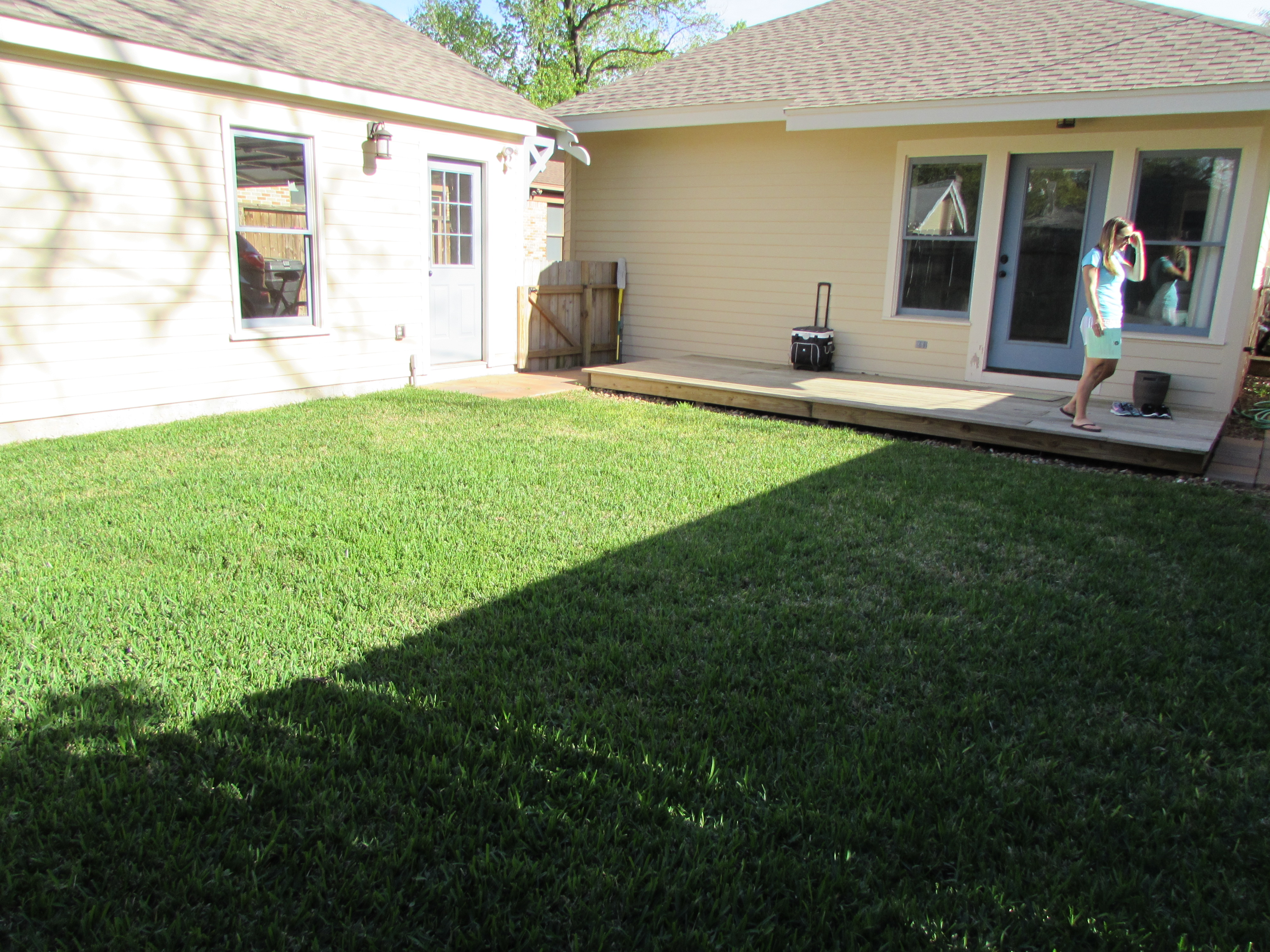 Recently we worked on landscaping in the back yard of  a bungalow that belongs to a young couple in Woodland Heights. He is a professional baseball player and she flies out to spend time with him regularly. This means they need a very low maintenance garden. In the off-season they love to have friends over to BBQ and hang out. Also there are years when they are going to rent out their home for the season and so wanted to make sure they put in hardscape that was very durable and no care. In our original design we had a cedar pergola and fire ring. They decided to have a metal powered coated one that include lots of lighting and fans. And we decided to use a portable fire ring for more flexibility.Before shot, nothing but lawn and a small wood deck.