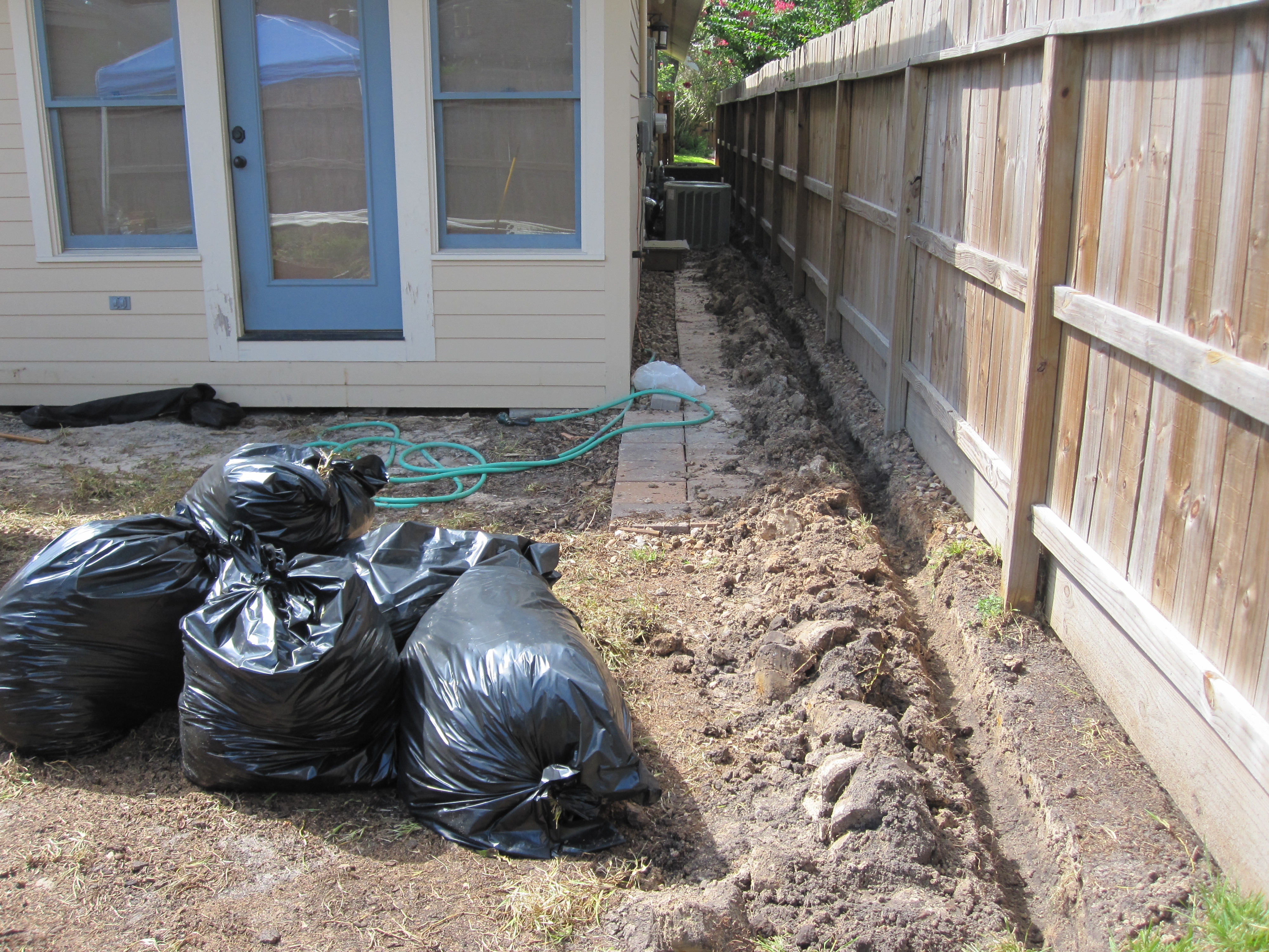 The patio comes around the corner and creates a path to the side door and the lovely view of the A/C condenser units! The bare fence will be covered with vines by this time next year.Irrigation lines down the side fence for future green wall.