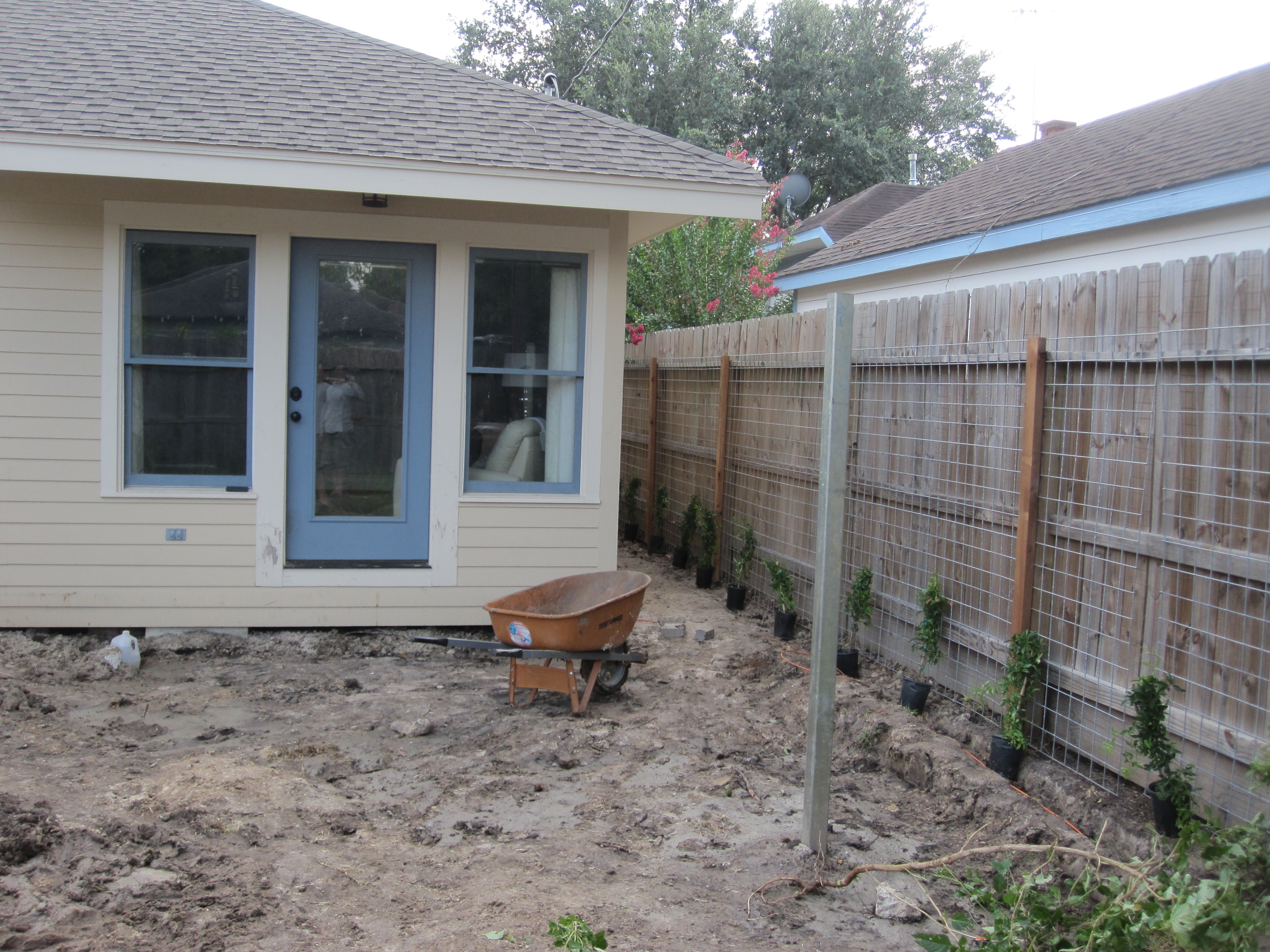 The vines are already stretching for the sky! Vines on a fence are a great way to provide greenery in narrow spaces. We will be installing another post and more welded wire and vines to hide the A/C which can be accessed from the front yard.The patio continues on around the corner and leads to the kitchen door.