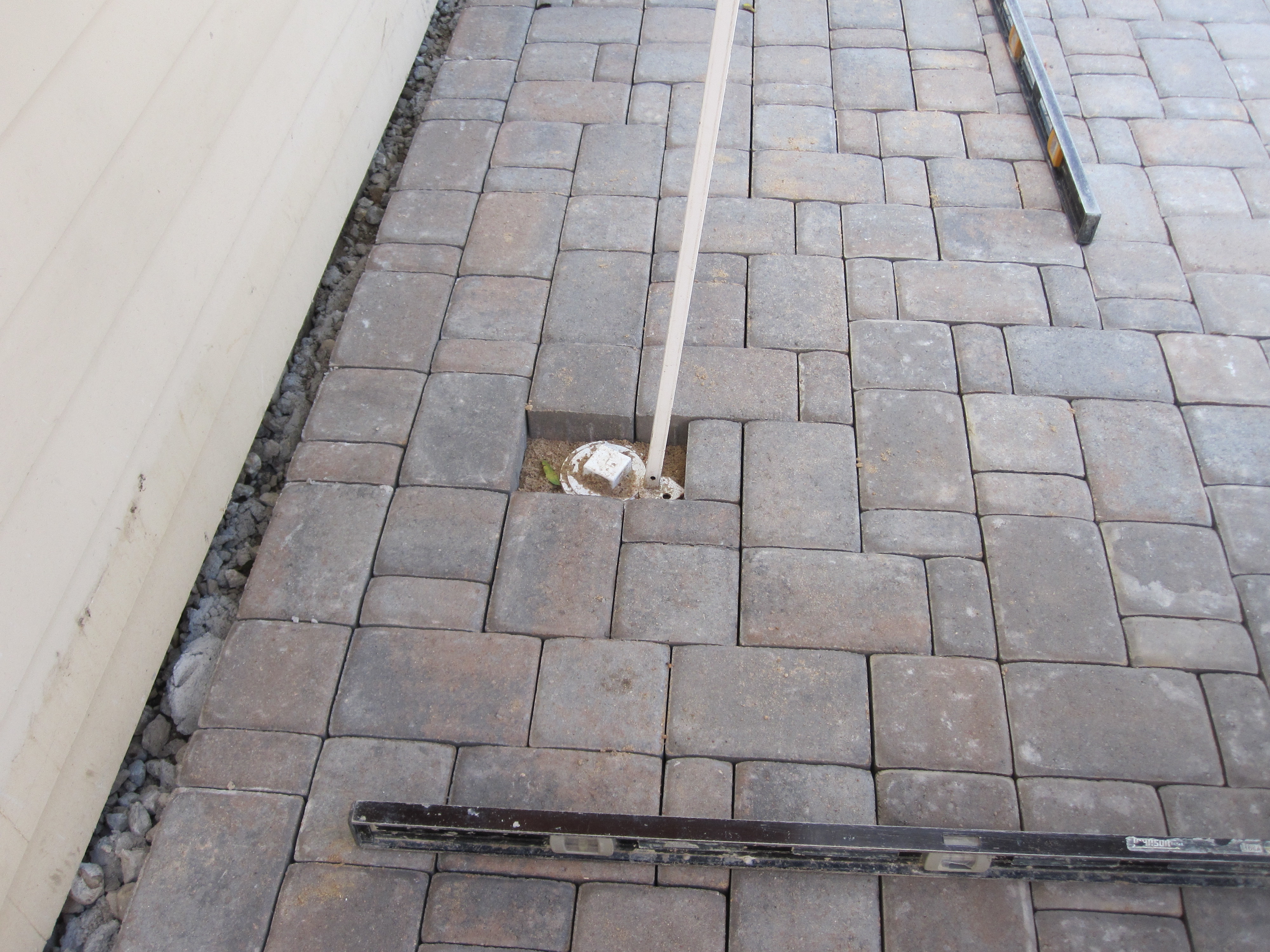 Certain ‘features’ of a landscape can be removed while others, like the access to the sewer, is good to retain. We abutted the pavers to the clean-out and later filled the void with gravel; easy enough to remove if access is needed, while still solid enough to walk across.Working around the clean out.