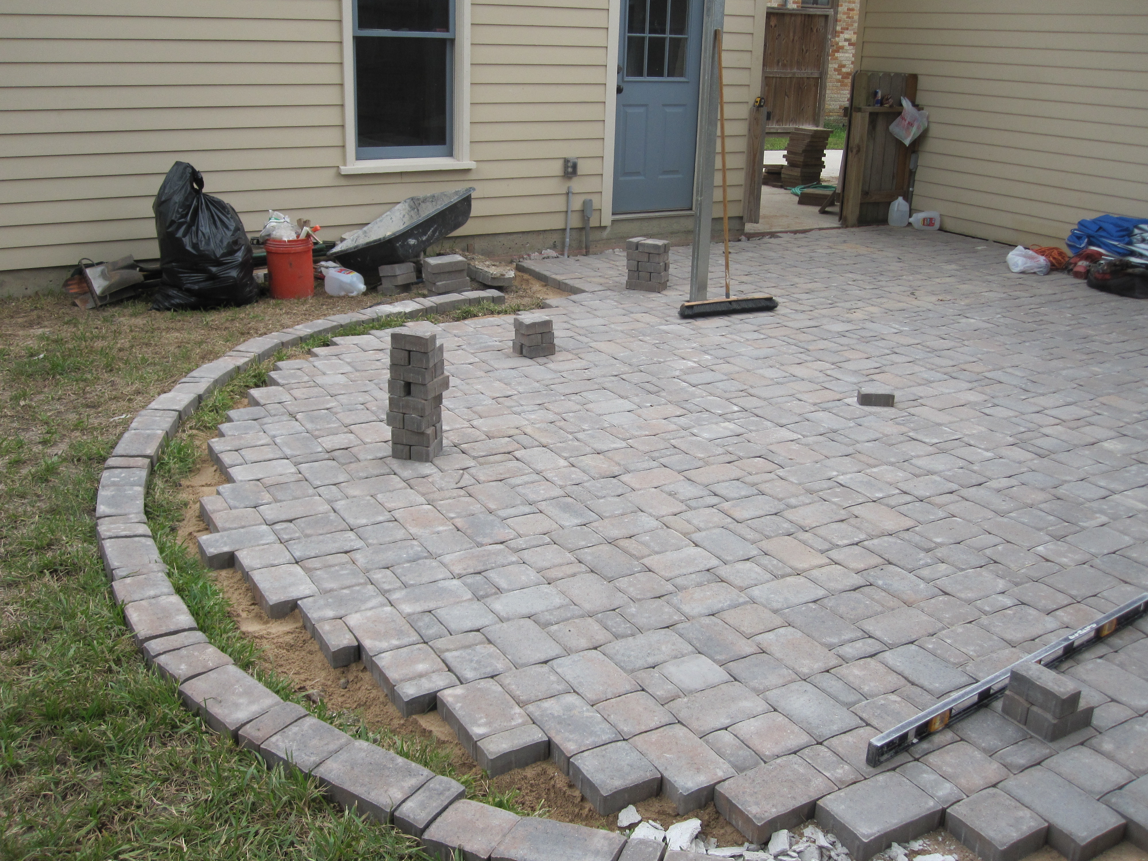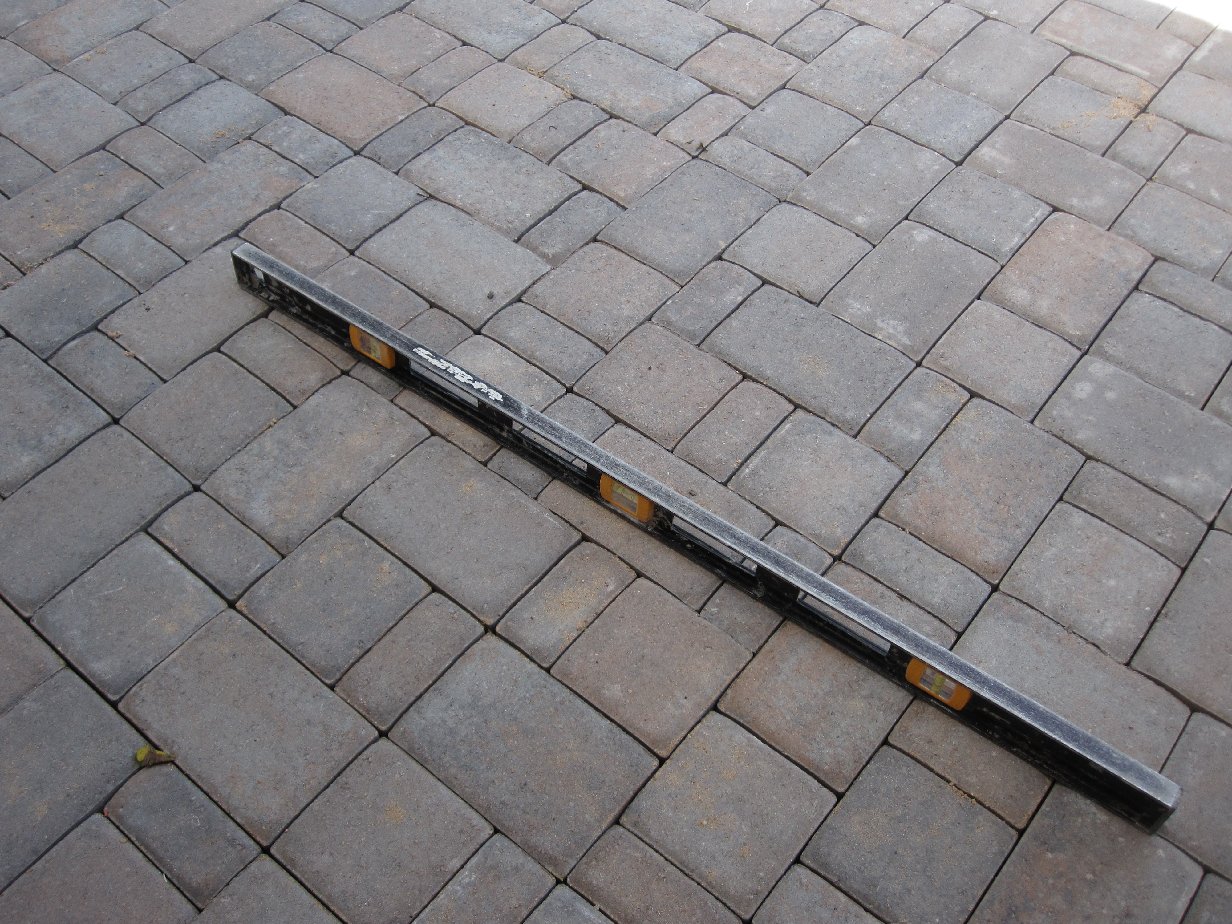 Be sure to keep checking your grade. Proper leveling will keep the water moving where you want it and by extension create a more low-maintenance space. It is much easier to modify the grade as the patio is installed than having to change the pitch after the final stone is laid.Continually checking the level.