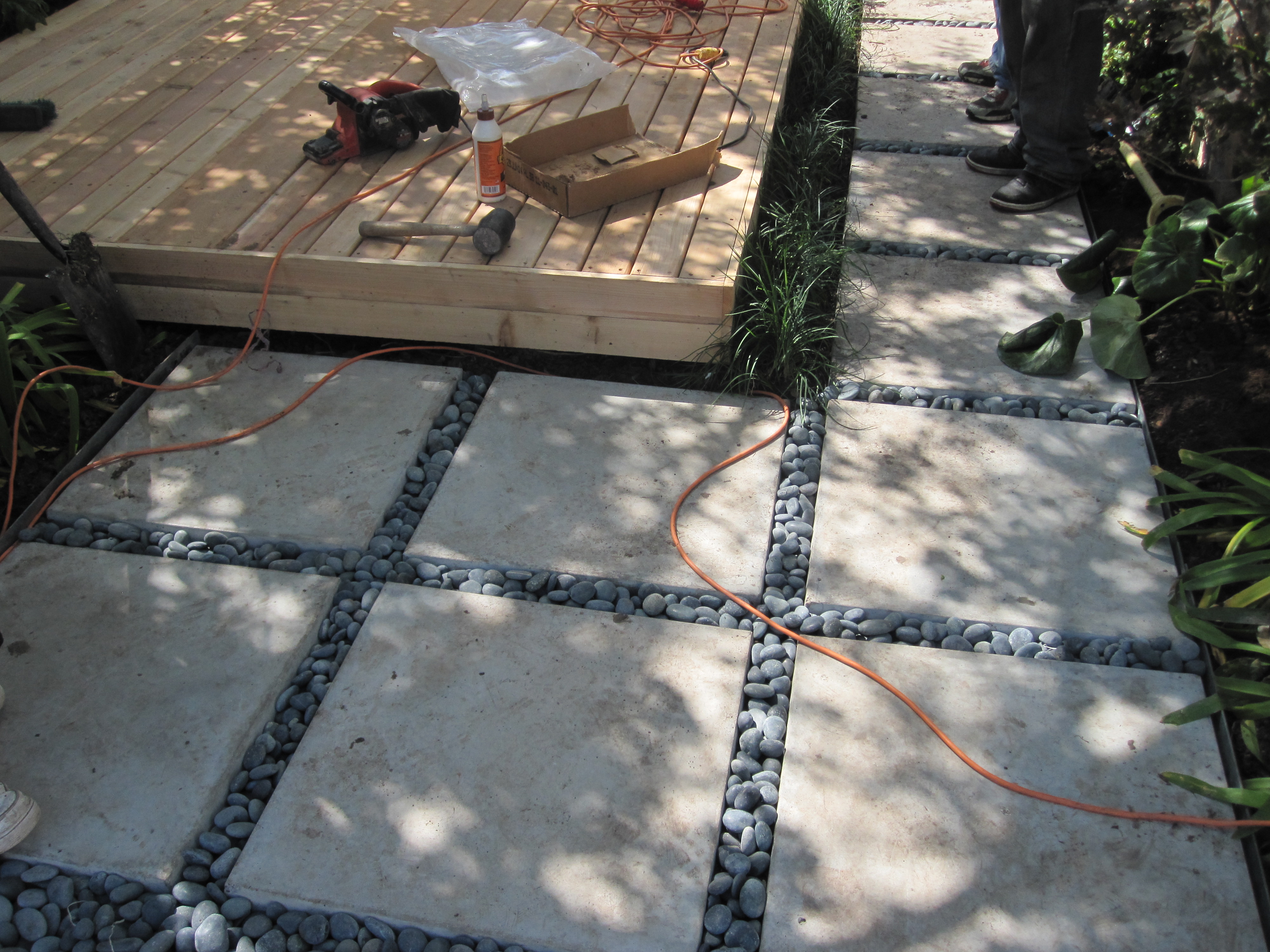 Hi Laurin, We are doing a similar concrete paver design (30″ pavers) and wondered what spacing you used between pavers and the size of the beach pebbles. Great job on this little oasis!