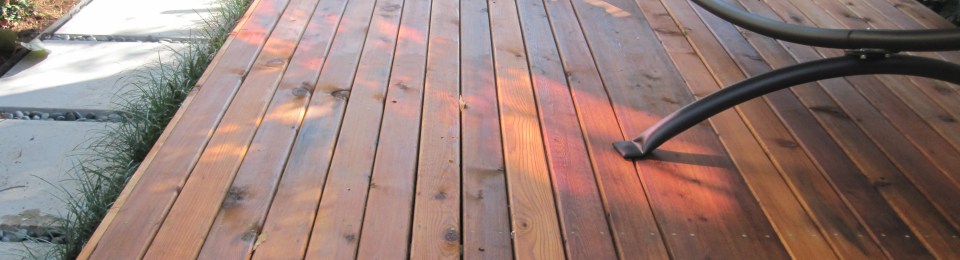 The exposed portions of the deck are all cedar; 2×4’s for the decking and 1×4’s for the surrounding trim. Routered edges of the decking gives a smooth look. We also counter-sunk the screws to ensure that they would not catch on bare feet.