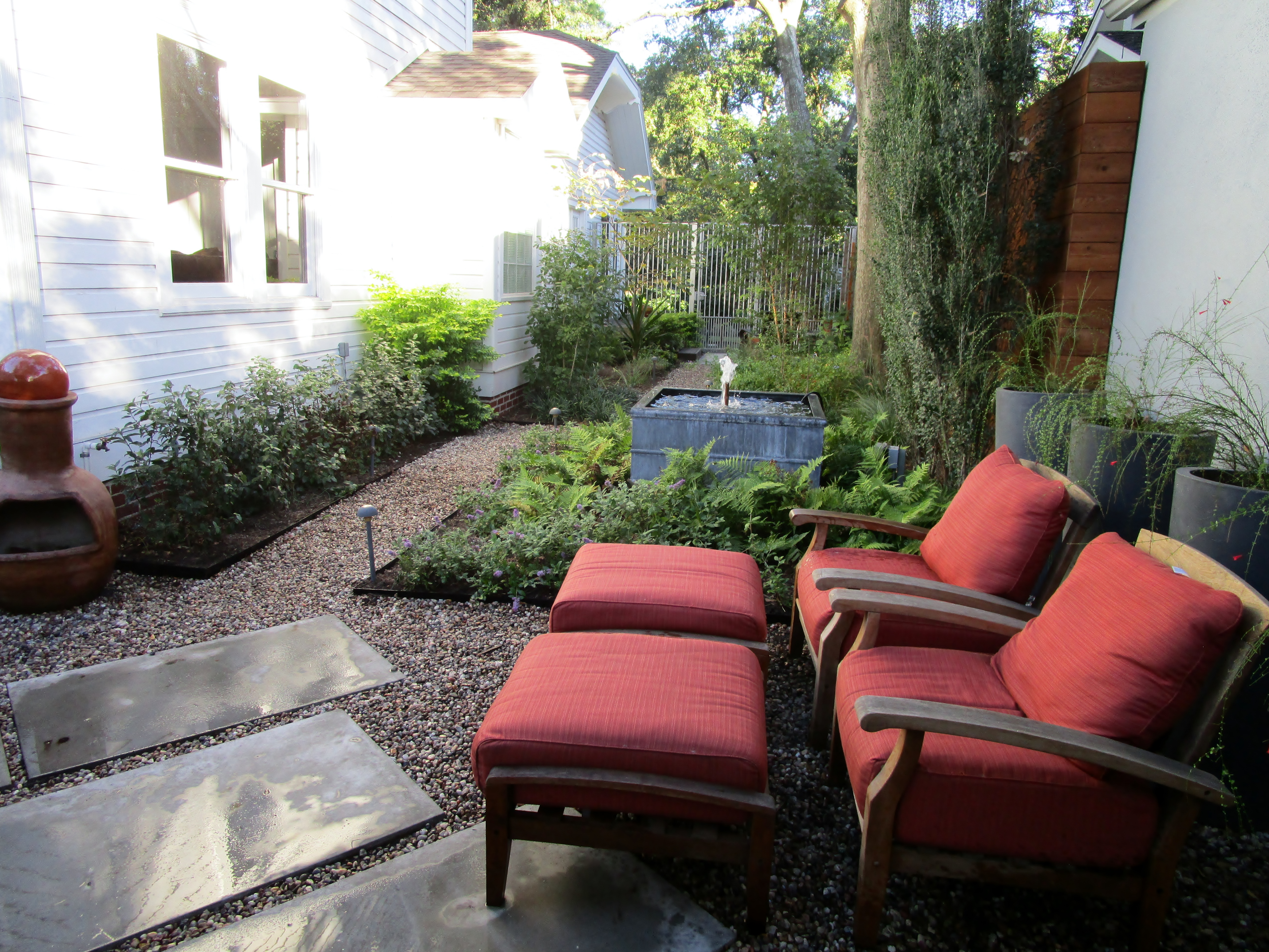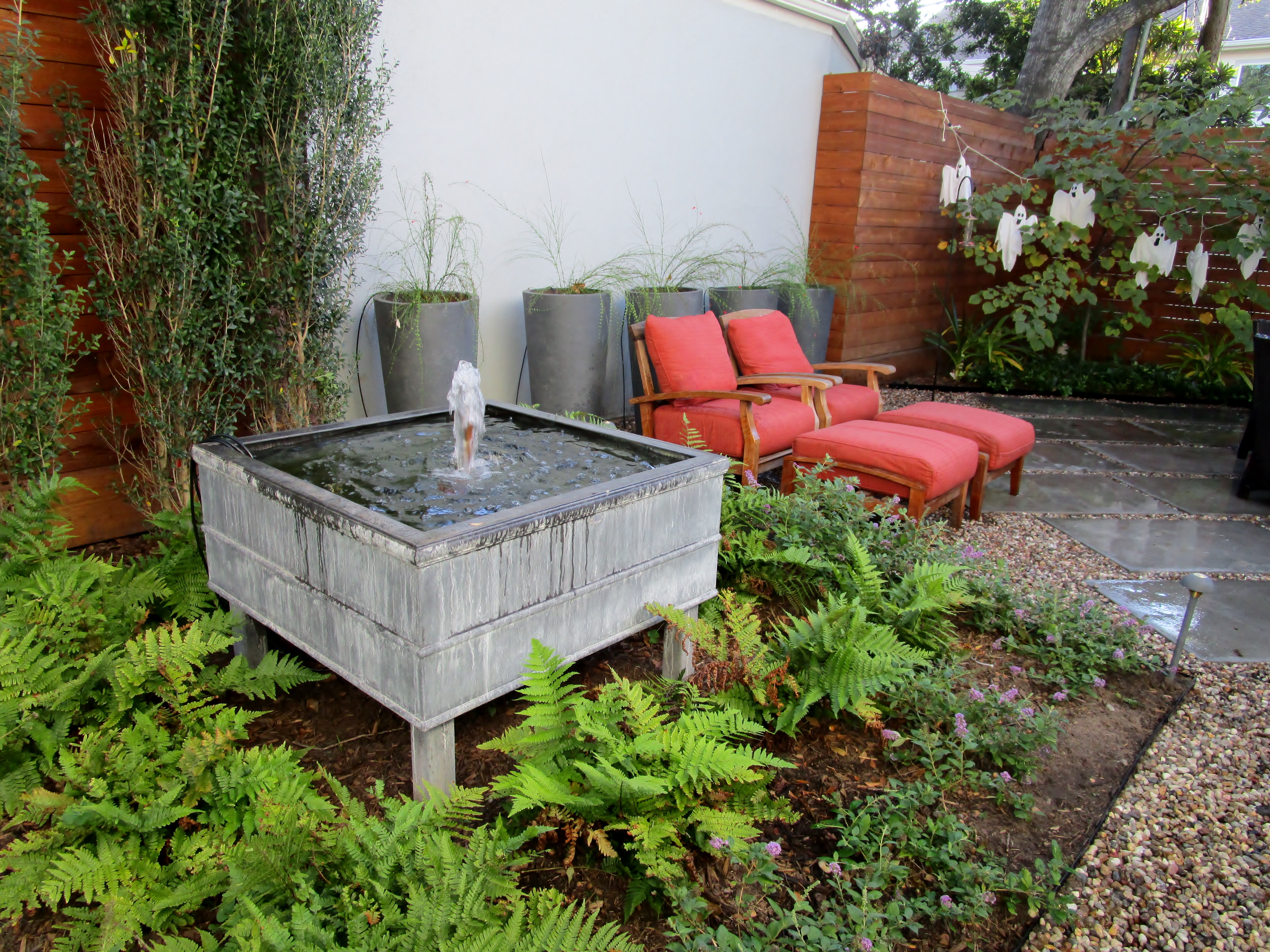 The fountain was placed to been seen from anywhere in this east garden and it provides a subtle white-noise to drown out the sounds of the urban surroundings. The fountain, forged steel with an industrial feel, continues the modern theme and is meant to be a water source for birds. The blue daze around the fountain never recovered from a late frost and we recently replaced them with Blue Chip buddleia.