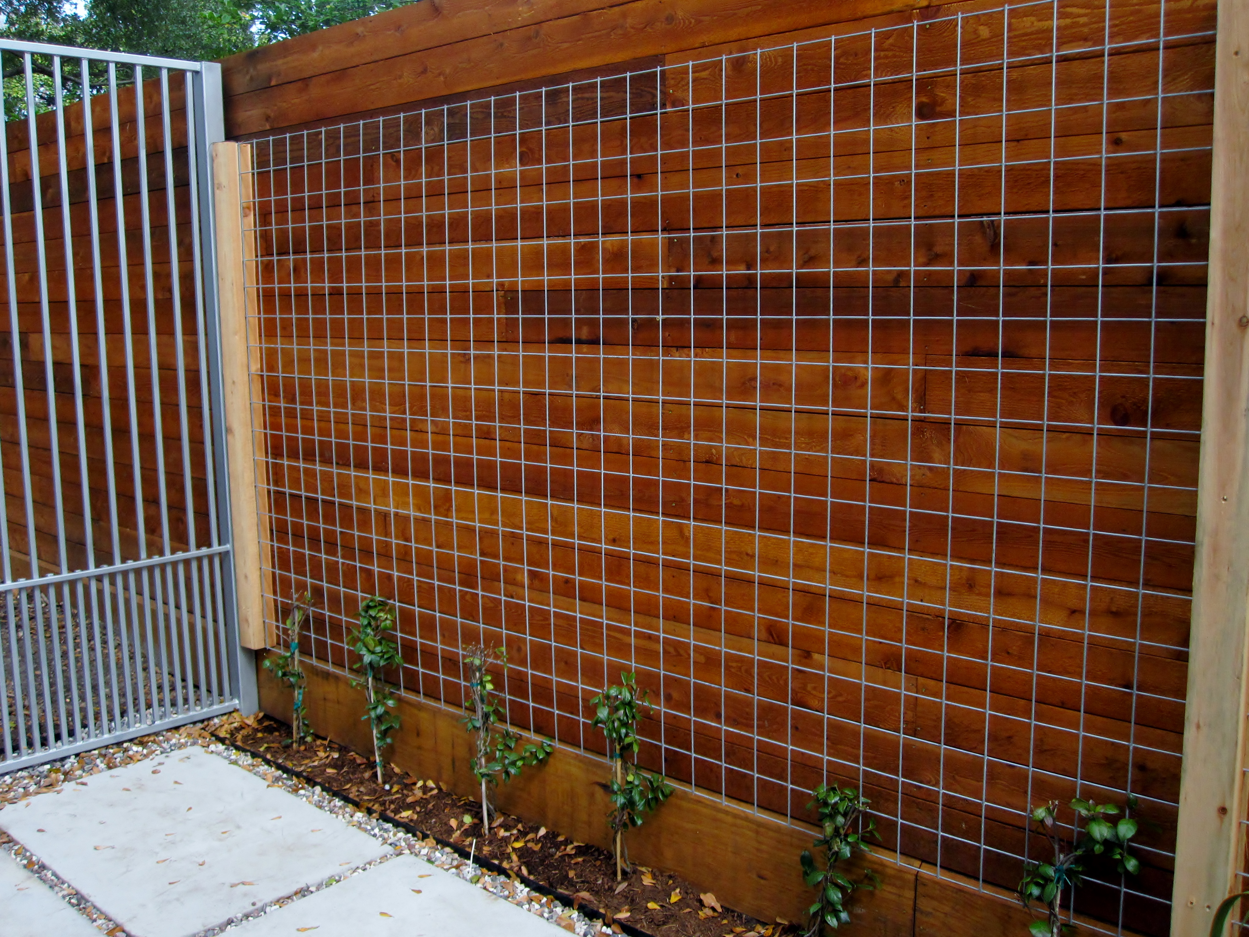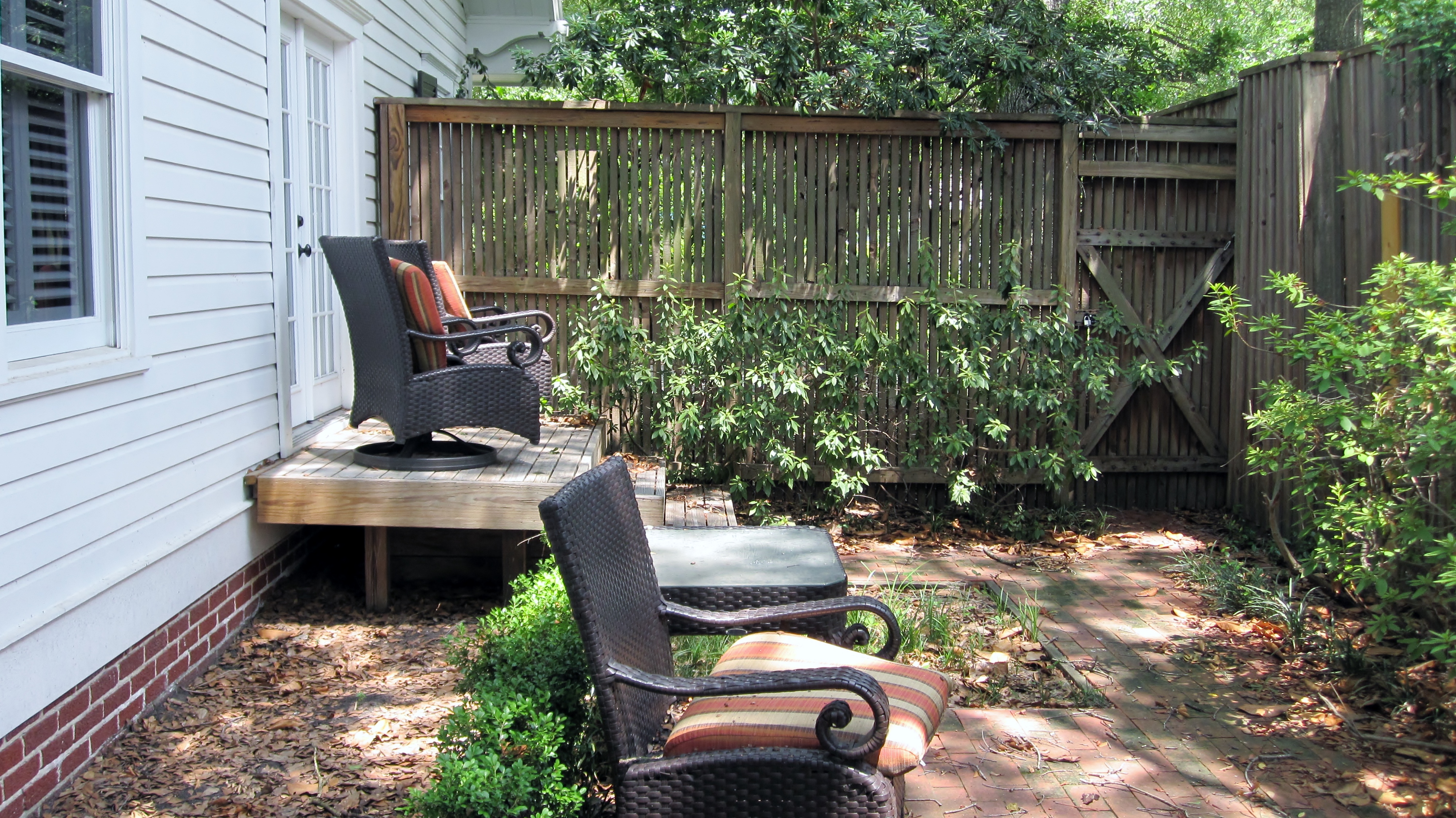 Here is the view from the small patio that is next to the small deck. We attached welded wire to the wood fence to create a green wall that will further define this as a separate area. In later shots you will see that the River birch on the left behind the chairs and Redbud on the right off the little deck also make it more secluded.