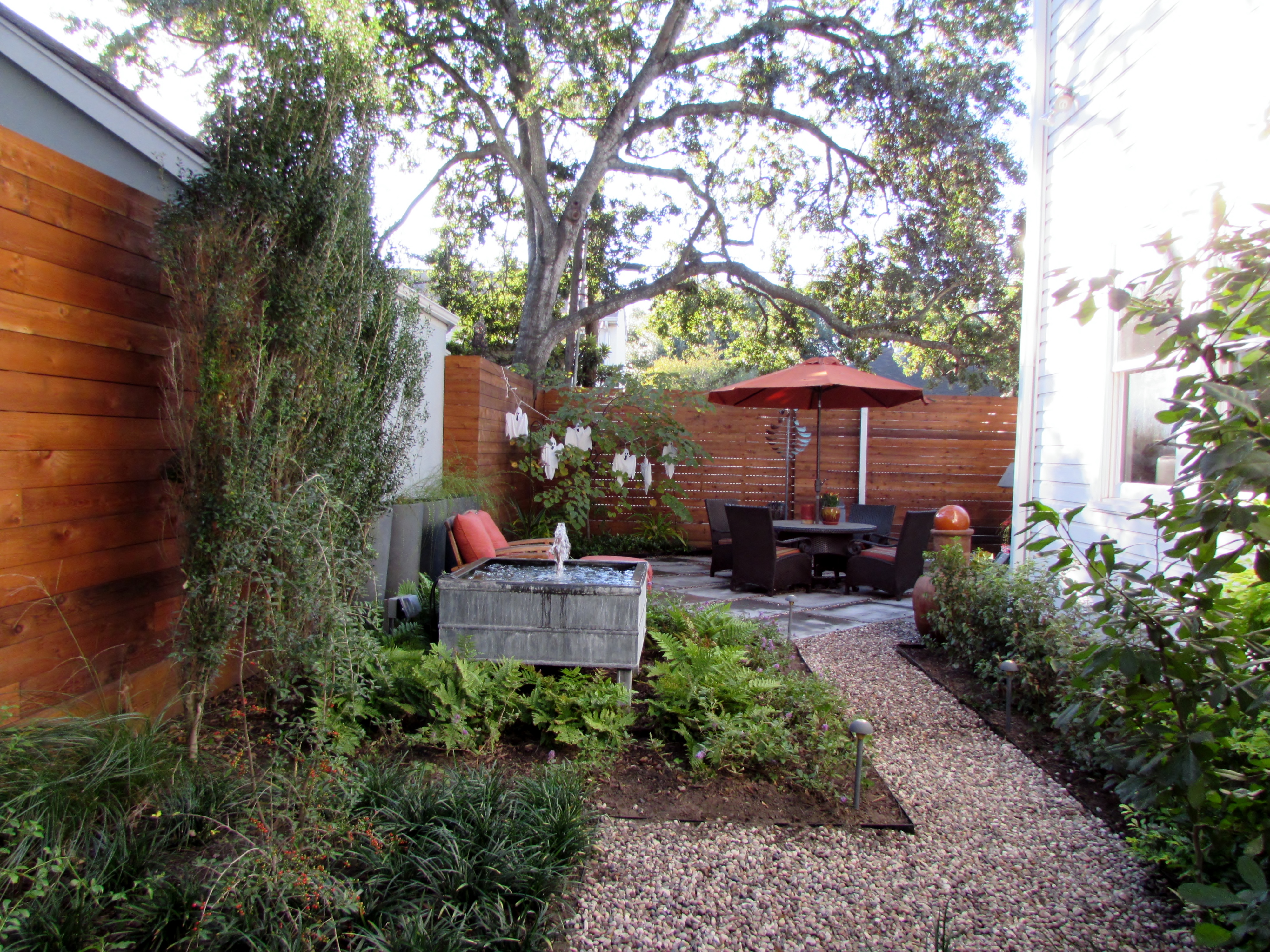 Finally the last piece of the design and installation we did for a lovely bungalow, tucked into a quiet neighborhood in Montrose. The couple had recently renovated with a very light and airy modern inside. The home had lots of windows that looked out on to the garden areas on both sides. With this in mind we created a garden full of vignettes to be viewed from different rooms all the while making it a cohesive garden to enjoy while outside and viewed as a whole. We used a mixture of low maintenance natives and acclimated plants that will have a naturalist look once they are grown in. We irrigated the entire property using only drip tubing in the beds, the only spray heads are in the small front lawn. Behind the flanking Chinese fringe trees there are gates leading to gardens on each side. The spaces are meant to be tranquil and attract wildlife. The over all design is a fusion of naturalist and Zen.