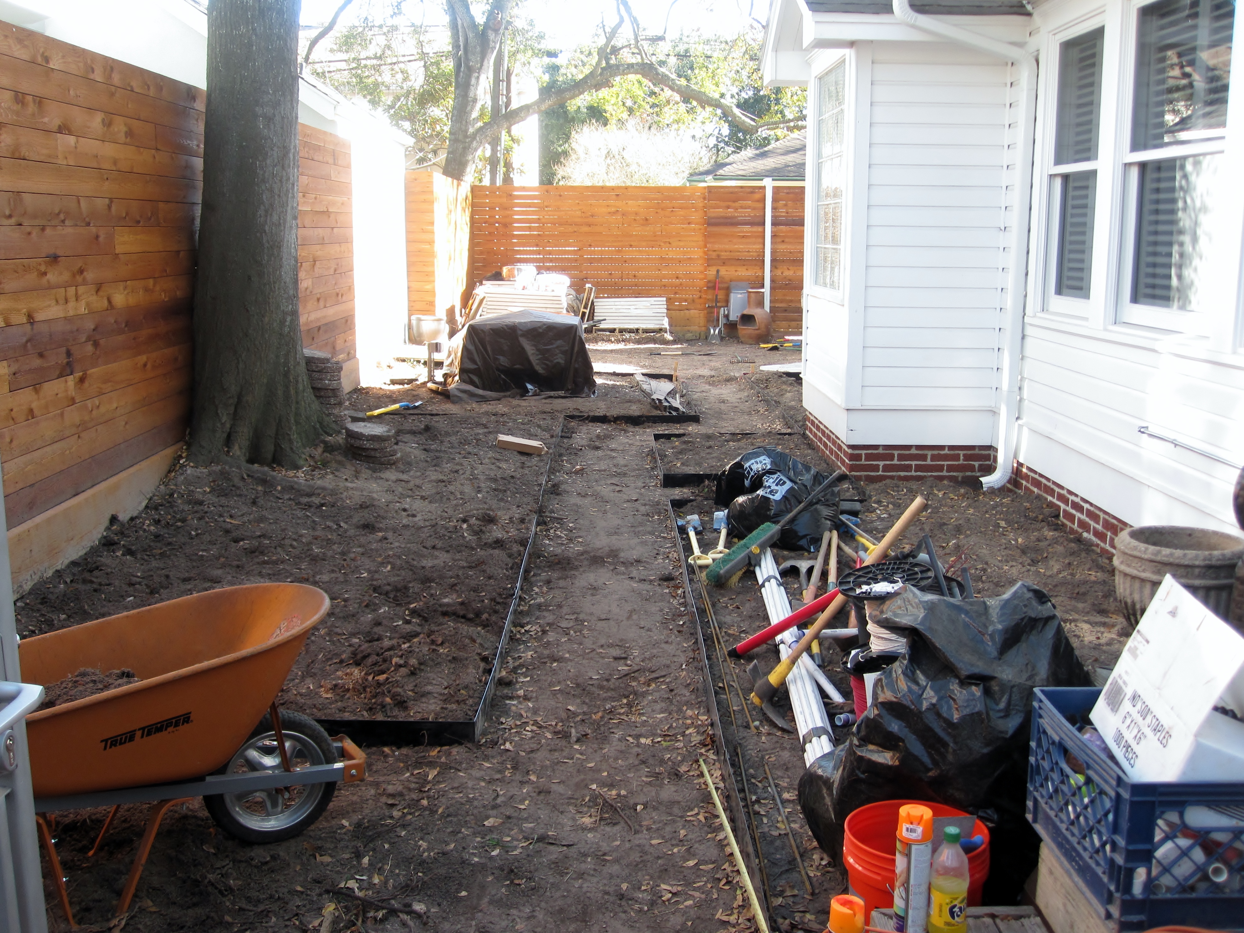 Process shot, the paths will be rainbow gravel (installed 3” thick) leading between the two cement pad patios, also functioning as a conveyance for excess rainfall; the water is carried to the rear of the property where their is an alley and the opening to the garage.